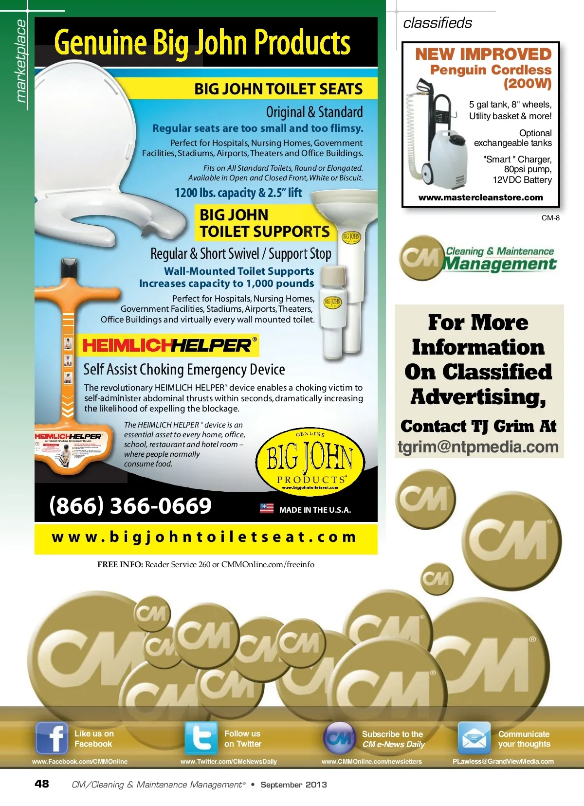 marketplace Genuine Big John Products BIG JOHN TOILET SEATS Original & Standard Regular seats are too small and too flimsy. Perfect for Hospitals, Nursing Homes, Government Facilities, Stadiums, Airports, Theaters and Office Buildings. Fits on All Standard Toilets, Round or Elongated. Available in Open and Closed Front, White or Biscuit. classifieds NEW IMPROVED Penguin Cordless (200W) 5 gal tank, 8" wheels, Utility basket & more! Optional exchangeable tanks "Smart " Charger, 80psi pump, 12VDC Battery www.mastercleanstore.com CM-8 1200 lbs. capacity & 2.5” lift BIG JOHN TOILET SUPPORTS Regular & Short Swivel / Support Stop Wall-Mounted Toilet Supports Increases capacity to 1,000 pounds Perfect for Hospitals, Nursing Homes, Government Facilities, Stadiums, Airports, Theaters, Office Buildings and virtually every wall mounted toilet. INSTRUCTIONS: Wall Method Table Method Self Assist Choking Emergency Device The revolutionary HEIMLICH HELPER ® device enables a choking victim to self-administer abdominal thrusts within seconds, dramatically increasing the likelihood of expelling the blockage. The HEIMLICH HELPER ® device is an essential asset to every home, office, school, restaurant and hotel room – where people normally consume food. Assisted Method For More Information On Classified Advertising, Contact TJ Grim At [email protected] U.S. Patent No. 6,725,863 Canadian Patent No. 2,444,589 Self Assist Choking Emergency Device TIME IS CRITICAL IMPORTANT: IF YOU CAN COUGH, TALK OR BREATHE, DO NOT USE THE HEIMLICH HELPER. CALL 911 BASE HANDLES RUBBER TIP 1.866.366.0669 MADE IN THE U.S.A. IN THE EVENT OF A CHOKING EMERGENCY FOLLOW THESE STEPS: Grasp the HEIMLICH HELPER and stand with back against wall Position base of HEIMLICH HELPER below rib cage & above navel with handles slightly lower than base Begin forceful, rapid thrusts inward and upward until obstruction is dislodged PRODUCTS (866) 366-0669 MADE IN THE U.S.A. www.bigjohntoiletseat.com FREE INFO: Reader Service 260 or CMMOnline.com/freeinfo Like us on Facebook www.Facebook.com/CMMOnline Follow us on Twitter www.Twitter.com/CMeNewsDaily Subscribe to the CM e-News Daily www.CMMOnline.com/newsletters Communicate your thoughts [email protected] 48 CM/Cleaning & Maintenance Management ® • September 2013