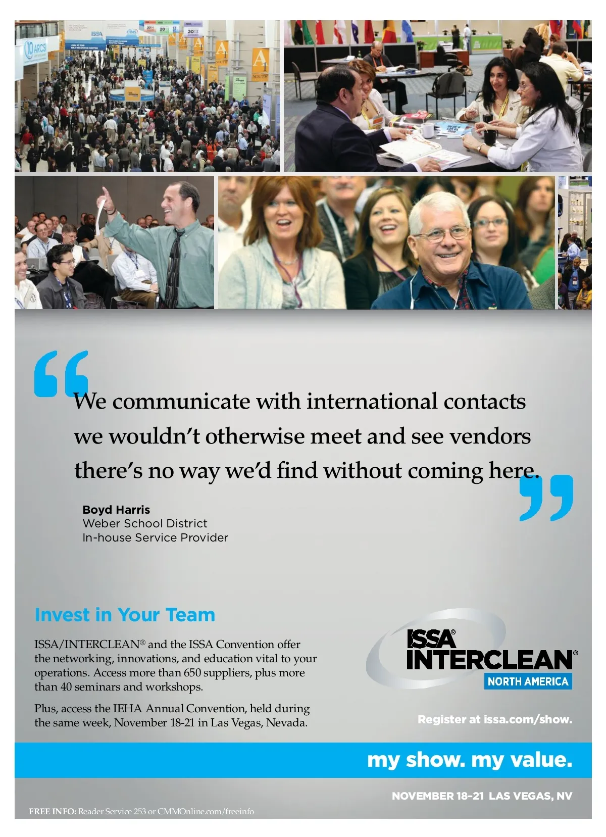 We communicate with international contacts we wouldn’t otherwise meet and see vendors there’s no way we’d fi nd without coming here. Boyd Harris Weber School District In-house Service Provider Invest in Your Team ISSA/INTERCLEAN ® and the ISSA Convention offer the networking, innovations, and education vital to your operations. Access more than 650 suppliers, plus more than 40 seminars and workshops. Plus, access the IEHA Annual Convention, held during the same week, November 18-21 in Las Vegas, Nevada. Register at issa.com/show. my show. my value. NOVEMBER 18–21 LAS VEGAS, NV FREE INFO: Reader Service 253 or CMMOnline.com/freeinfo