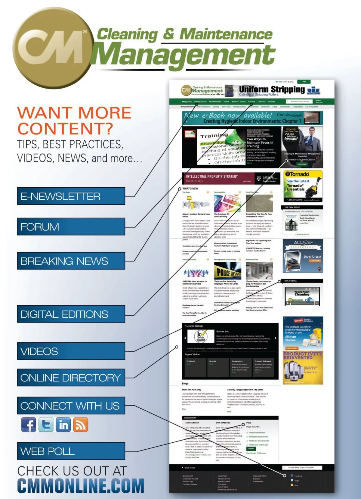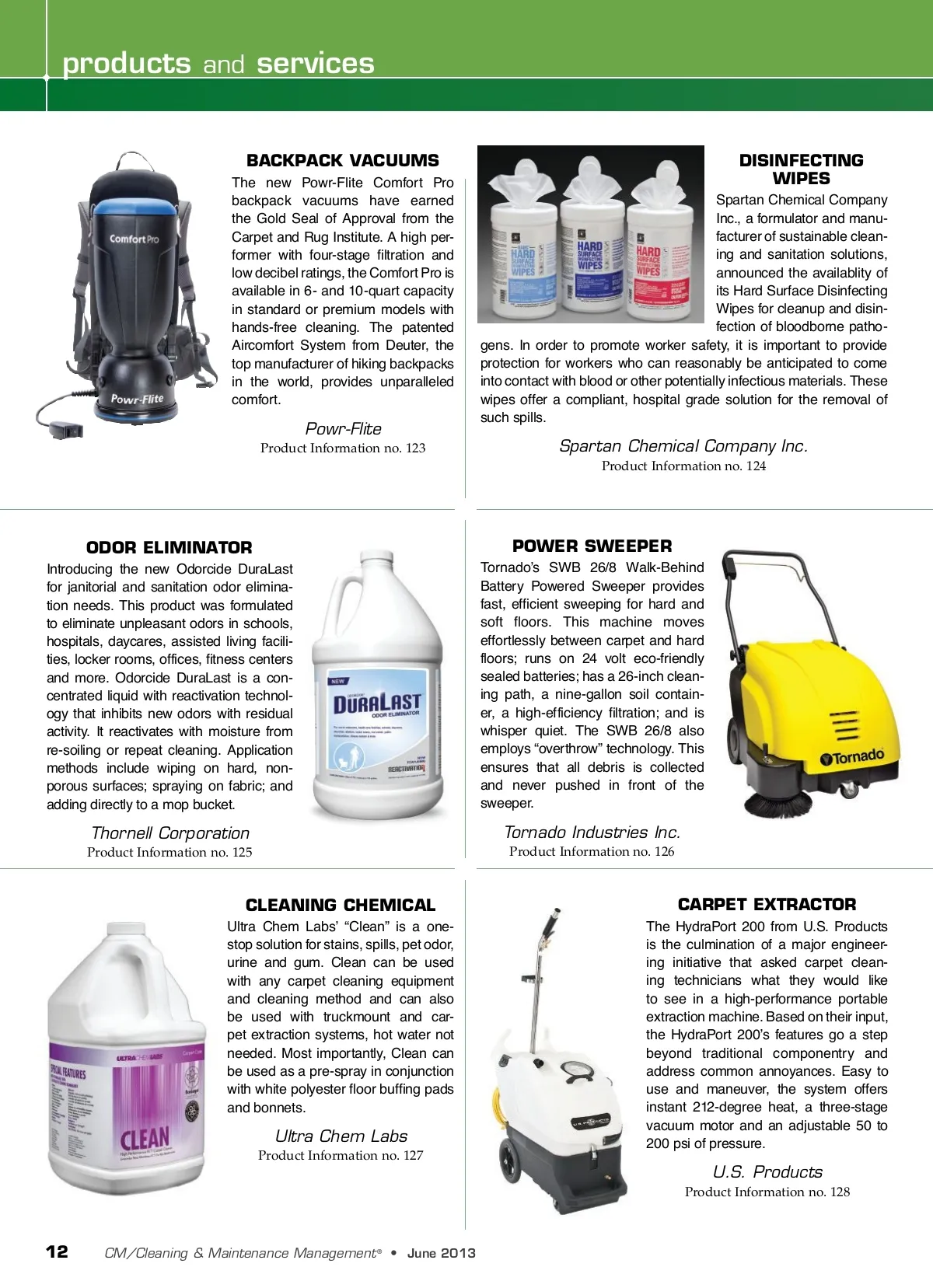 products and services BACKPACK VACUUMS The new Powr-Flite Comfort Pro backpack vacuums have earned the Gold Seal of Approval from the Carpet and Rug Institute. A high per-former with four-stage filtration and low decibel ratings, the Comfort Pro is available in 6-and 10-quart capacity in standard or premium models with hands-free cleaning. The patented Aircomfort System from Deuter, the top manufacturer of hiking backpacks in the world, provides unparalleled comfort. DISINFECTING WIPES Spartan Chemical Company Inc., a formulator and manu-facturer of sustainable clean-ing and sanitation solutions, announced the availablity of its Hard Surface Disinfecting Wipes for cleanup and disin-fection of bloodborne patho-gens. In order to promote worker safety, it is important to provide protection for workers who can reasonably be anticipated to come into contact with blood or other potentially infectious materials. These wipes offer a compliant, hospital grade solution for the removal of such spills. Powr-Flite Product Information no. 123 Spartan Chemical Company Inc. Product Information no. 124 ODOR ELIMINATOR Introducing the new Odorcide DuraLast for janitorial and sanitation odor elimina-tion needs. This product was formulated to eliminate unpleasant odors in schools, hospitals, daycares, assisted living facili-ties, locker rooms, offices, fitness centers and more. Odorcide DuraLast is a con-centrated liquid with reactivation technol-ogy that inhibits new odors with residual activity. It reactivates with moisture from re-soiling or repeat cleaning. Application methods include wiping on hard, non-porous surfaces; spraying on fabric; and adding directly to a mop bucket. Tornado’s SWB 26/8 Walk-Behind Battery Powered Sweeper provides fast, efficient sweeping for hard and soft floors. This machine moves effortlessly between carpet and hard floors; runs on 24 volt eco-friendly sealed batteries; has a 26-inch clean -ing path, a nine-gallon soil contain-er, a high-efficiency filtration; and is whisper quiet. The SWB 26/8 also employs “overthrow” technology. This ensures that all debris is collected and never pushed in front of the sweeper. POWER SWEEPER Thornell Corporation Product Information no. 125 Tornado Industries Inc. Product Information no. 126 Ultra Chem Labs’ “Clean” is a one-stop solution for stains, spills, pet odor, urine and gum. Clean can be used with any carpet cleaning equipment and cleaning method and can also be used with truckmount and car-pet extraction systems, hot water not needed. Most importantly, Clean can be used as a pre-spray in conjunction with white polyester floor buffing pads and bonnets. CLEANING CHEMICAL Ultra Chem Labs Product Information no. 127 The HydraPort 200 from U.S. Products is the culmination of a major engineer-ing initiative that asked carpet clean-ing technicians what they would like to see in a high-performance portable extraction machine. Based on their input, the HydraPort 200’s features go a step beyond traditional componentry and address common annoyances. Easy to use and maneuver, the system offers instant 212-degree heat, a three-stage vacuum motor and an adjustable 50 to 200 psi of pressure. CARPET EXTRACTOR U.S. Products Product Information no. 128 12 CM/Cleaning & Maintenance Management ® • June 2013