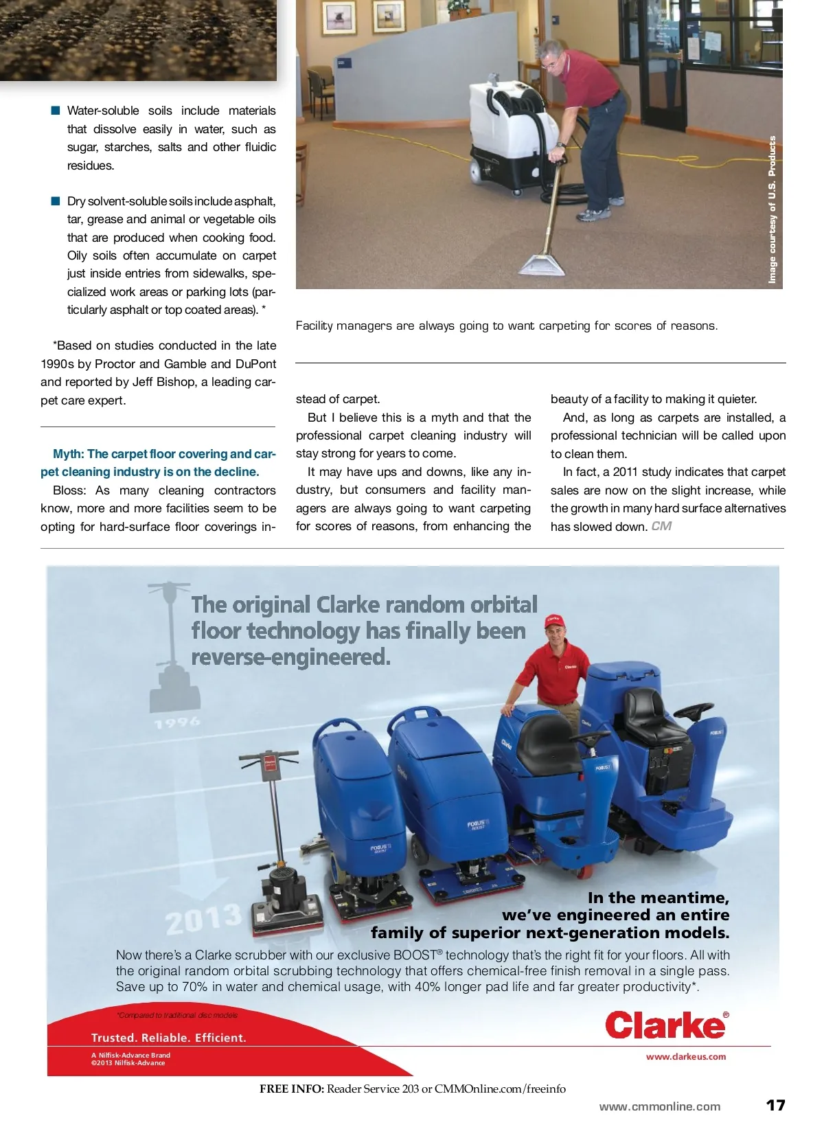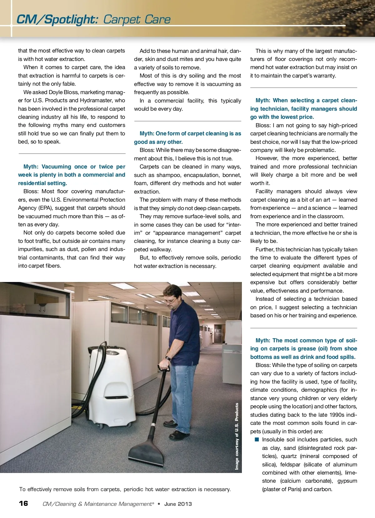CM/Spotlight: Carpet Care that the most effective way to clean carpets is with hot water extraction. When it comes to carpet care, the idea that extraction is harmful to carpets is cer-tainly not the only fable. We asked Doyle Bloss, marketing manag-er for U.S. Products and Hydramaster, who has been involved in the professional carpet cleaning industry all his life, to respond to the following myths many end customers still hold true so we can finally put them to bed, so to speak. Add to these human and animal hair, dan-der, skin and dust mites and you have quite a variety of soils to remove. Most of this is dry soiling and the most effective way to remove it is vacuuming as frequently as possible. In a commercial facility, this typically would be every day. This is why many of the largest manufac-turers of floor coverings not only recom-mend hot water extraction but may insist on it to maintain the carpet’s warranty. Myth: Vacuuming once or twice per week is plenty in both a commercial and residential setting. Bloss: Most floor covering manufactur-ers, even the U.S. Environmental Protection Agency (EPA), suggest that carpets should be vacuumed much more than this — as of-ten as every day. Not only do carpets become soiled due to foot traffic, but outside air contains many impurities, such as dust, pollen and indus-trial contaminants, that can find their way into carpet fibers. Myth: One form of carpet cleaning is as good as any other. Bloss: While there may be some disagree-ment about this, I believe this is not true. Carpets can be cleaned in many ways, such as shampoo, encapsulation, bonnet, foam, different dry methods and hot water extraction. The problem with many of these methods is that they simply do not deep clean carpets. They may remove surface-level soils, and in some cases they can be used for “inter-im” or “appearance management” carpet cleaning, for instance cleaning a busy car-peted walkway. But, to effectively remove soils, periodic hot water extraction is necessary. Myth: When selecting a carpet clean-ing technician, facility managers should go with the lowest price. Bloss: I am not going to say high-priced carpet cleaning technicians are normally the best choice, nor will I say that the low-priced company will likely be problematic. However, the more experienced, better trained and more professional technician will likely charge a bit more and be well worth it. Facility managers should always view carpet cleaning as a bit of an art — learned from experience — and a science — learned from experience and in the classroom. The more experienced and better trained a technician, the more effective he or she is likely to be. Further, this technician has typically taken the time to evaluate the different types of carpet cleaning equipment available and selected equipment that might be a bit more expensive but offers considerably better value, effectiveness and performance. Instead of selecting a technician based on price, I suggest selecting a technician based on his or her training and experience. To effectively remove soils from carpets, periodic hot water extraction is necessary. Myth: The most common type of soil-ing on carpets is grease (oil) from shoe bottoms as well as drink and food spills. Bloss: While the type of soiling on carpets can vary due to a variety of factors includ-ing how the facility is used, type of facility, climate conditions, demographics (for in-stance very young children or very elderly people using the location) and other factors, studies dating back to the late 1990s indi-cate the most common soils found in car-pets (usually in this order) are: ■ Insoluble soil includes particles, such as clay, sand (disintegrated rock par-ticles), quartz (mineral composed of silica), feldspar (silicate of aluminum combined with other elements), lime-stone (calcium carbonate), gypsum (plaster of Paris) and carbon. 16 CM/Cleaning & Maintenance Management ® • June 2013 Image courtesy of U.S. Products