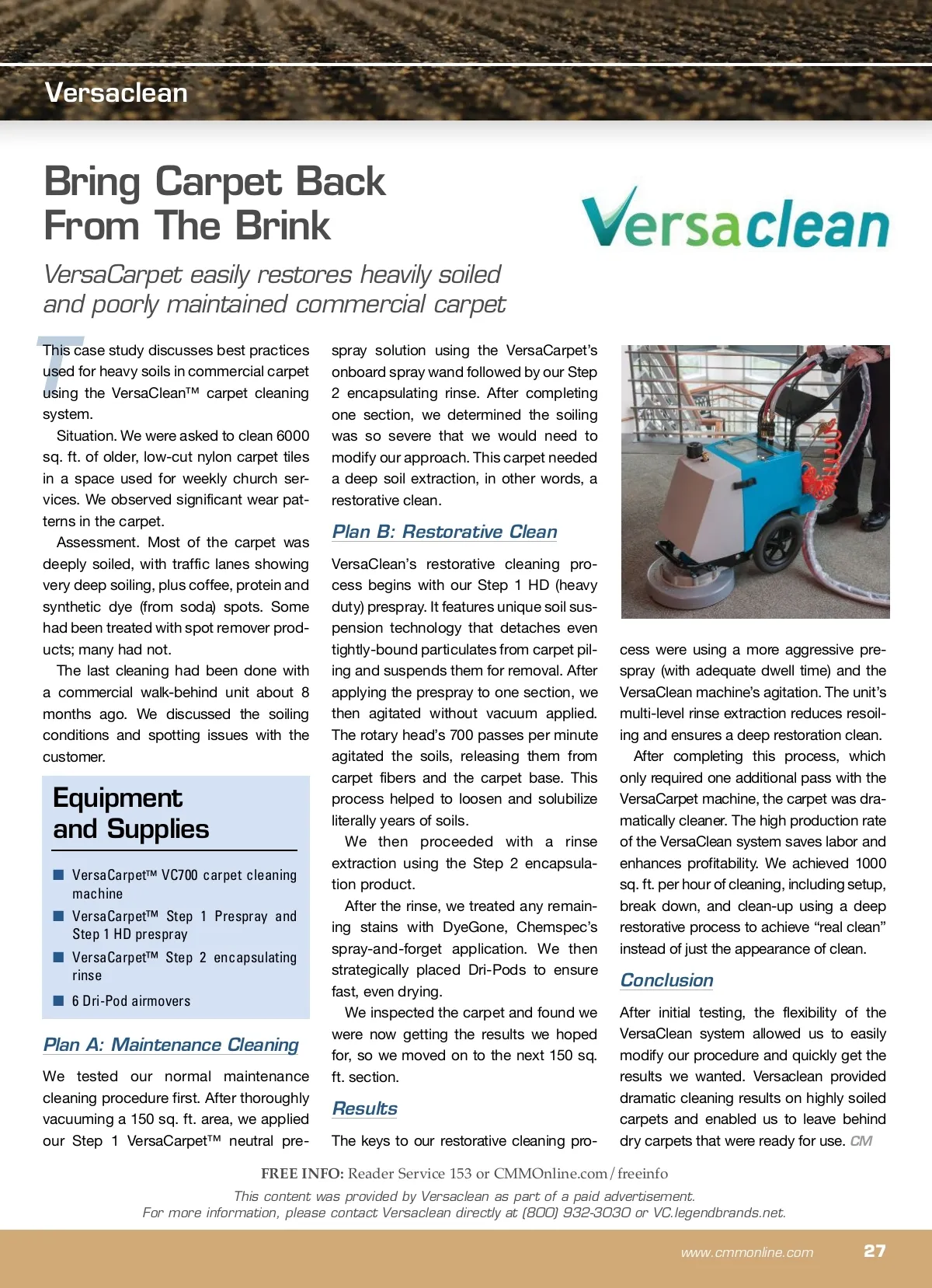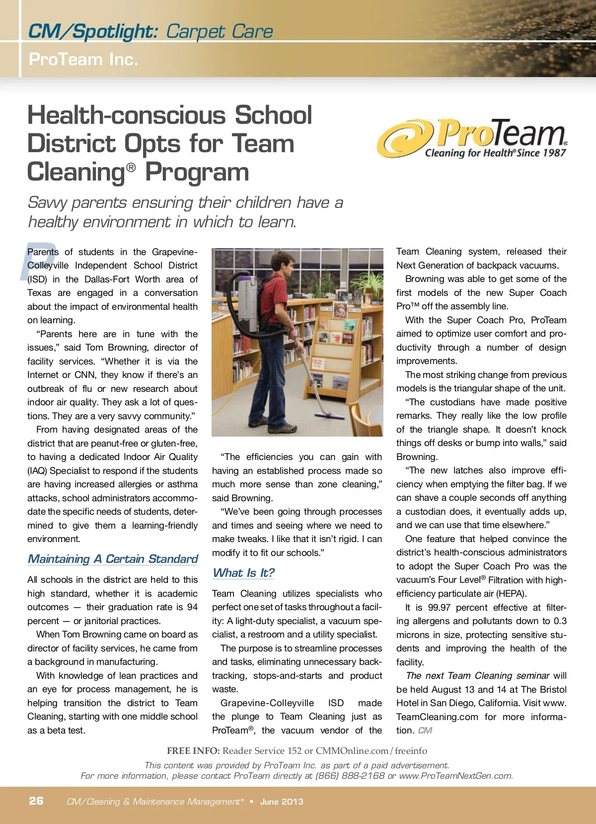 CM/Spotlight: Carpet Care ProTeam Inc. Health-conscious School District Opts for Team Cleaning ® Program Savvy parents ensuring their children have a healthy environment in which to learn. P Parents of students in the Grapevine-Colleyville Independent School District (ISD) in the Dallas-Fort Worth area of Texas are engaged in a conversation about the impact of environmental health on learning. “Parents here are in tune with the issues,” said Tom Browning, director of facility services. “Whether it is via the Internet or CNN, they know if there’s an outbreak of flu or new research about indoor air quality. They ask a lot of ques-tions. They are a very savvy community.” From having designated areas of the district that are peanut-free or gluten-free, to having a dedicated Indoor Air Quality (IAQ) Specialist to respond if the students are having increased allergies or asthma attacks, school administrators accommo-date the specific needs of students, deter-mined to give them a learning-friendly environment. Maintaining A Certain Standard All schools in the district are held to this high standard, whether it is academic outcomes — their graduation rate is 94 percent — or janitorial practices. When Tom Browning came on board as director of facility services, he came from a background in manufacturing. With knowledge of lean practices and an eye for process management, he is helping transition the district to Team Cleaning, starting with one middle school as a beta test. “The efficiencies you can gain with having an established process made so much more sense than zone cleaning,” said Browning. “We’ve been going through processes and times and seeing where we need to make tweaks. I like that it isn’t rigid. I can modify it to fit our schools.” What Is It? Team Cleaning utilizes specialists who perfect one set of tasks throughout a facil-ity: A light-duty specialist, a vacuum spe-cialist, a restroom and a utility specialist. The purpose is to streamline processes and tasks, eliminating unnecessary back-tracking, stops-and-starts and product waste. Grapevine-Colleyville ISD made the plunge to Team Cleaning just as ProTeam ® , the vacuum vendor of the Team Cleaning system, released their Next Generation of backpack vacuums. Browning was able to get some of the first models of the new Super Coach Pro™ off the assembly line. With the Super Coach Pro, ProTeam aimed to optimize user comfort and pro-ductivity through a number of design improvements. The most striking change from previous models is the triangular shape of the unit. “The custodians have made positive remarks. They really like the low profile of the triangle shape. It doesn’t knock things off desks or bump into walls,” said Browning. “The new latches also improve effi-ciency when emptying the filter bag. If we can shave a couple seconds off anything a custodian does, it eventually adds up, and we can use that time elsewhere.” One feature that helped convince the district’s health-conscious administrators to adopt the Super Coach Pro was the vacuum’s Four Level ® Filtration with high-efficiency particulate air (HEPA). It is 99.97 percent effective at filter-ing allergens and pollutants down to 0.3 microns in size, protecting sensitive stu-dents and improving the health of the facility. The next Team Cleaning seminar will be held August 13 and 14 at The Bristol Hotel in San Diego, California. Visit www. TeamCleaning.com for more informa-tion. CM FREE INFO: Reader Service 152 or CMMOnline.com/freeinfo This content was provided by ProTeam Inc. as part of a paid advertisement. For more information, please contact ProTeam directly at (866) 888-2168 or www.ProTeamNextGen.com. 26 CM/Cleaning & Maintenance Management ® • June 2013
