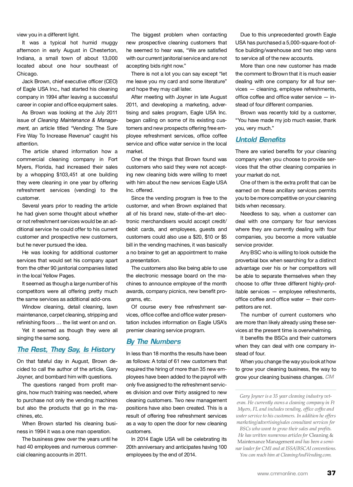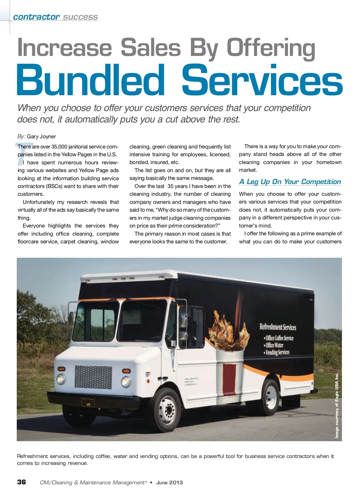 contractor success Increase Sales By Offering Bundled Services When you choose to offer your customers services that your competition does not, it automatically puts you a cut above the rest. By: Gary Joyner There are over 35,000 janitorial service com-panies listed in the Yellow Pages in the U.S. I have spent numerous hours review-ing various websites and Yellow Page ads looking at the information building service contractors (BSCs) want to share with their customers. Unfortunately my research reveals that virtually all of the ads say basically the same thing. Everyone highlights the services they offer including office cleaning, complete floorcare service, carpet cleaning, window cleaning, green cleaning and frequently list intensive training for employees, licensed, bonded, insured, etc. The list goes on and on, but they are all saying basically the same message. Over the last 35 years I have been in the cleaning industry, the number of cleaning company owners and managers who have said to me, “Why do so many of the custom-ers in my market judge cleaning companies on price as their prime consideration?” The primary reason in most cases is that everyone looks the same to the customer. T There is a way for you to make your com-pany stand heads above all of the other cleaning companies in your hometown market. A Leg Up On Your Competition When you choose to offer your custom-ers various services that your competition does not, it automatically puts your com-pany in a different perspective in your cus-tomer’s mind. I offer the following as a prime example of what you can do to make your customers Refreshment services, including coffee, water and vending options, can be a powerful tool for business service contractors when it comes to increasing revenue. 36 CM/Cleaning & Maintenance Management ® • June 2013 Image courtesy of Eagle USA Inc.
