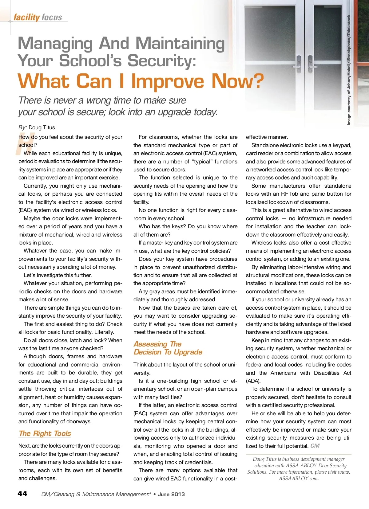 Managing And Maintaining Your School’s Security: What Can I Improve Now? There is never a wrong time to make sure your school is secure; look into an upgrade today. By: Doug Titus H How do you feel about the security of your school? While each educational facility is unique, periodic evaluations to determine if the secu-rity systems in place are appropriate or if they can be improved are an important exercise. Currently, you might only use mechani-cal locks, or perhaps you are connected to the facility’s electronic access control (EAC) system via wired or wireless locks. Maybe the door locks were implement-ed over a period of years and you have a mixture of mechanical, wired and wireless locks in place. Whatever the case, you can make im-provements to your facility’s security with-out necessarily spending a lot of money. Let’s investigate this further. Whatever your situation, performing pe-riodic checks on the doors and hardware makes a lot of sense. There are simple things you can do to in-stantly improve the security of your facility. The first and easiest thing to do? Check all locks for basic functionality. Literally. Do all doors close, latch and lock? When was the last time anyone checked? Although doors, frames and hardware for educational and commercial environ-ments are built to be durable, they get constant use, day in and day out; buildings settle throwing critical interfaces out of alignment, heat or humidity causes expan-sion, any number of things can have oc-curred over time that impair the operation and functionality of doorways. For classrooms, whether the locks are the standard mechanical type or part of an electronic access control (EAC) system, there are a number of “typical” functions used to secure doors. The function selected is unique to the security needs of the opening and how the opening fits within the overall needs of the facility. No one function is right for every class-room in every school. Who has the keys? Do you know where all of them are? If a master key and key control system are in use, what are the key control policies? Does your key system have procedures in place to prevent unauthorized distribu-tion and to ensure that all are collected at the appropriate time? Any gray areas must be identified imme-diately and thoroughly addressed. Now that the basics are taken care of, you may want to consider upgrading se-curity if what you have does not currently meet the needs of the school. Assessing The Decision To Upgrade Think about the layout of the school or uni-versity. Is it a one-building high school or el-ementary school, or an open-plan campus with many facilities? If the latter, an electronic access control (EAC) system can offer advantages over mechanical locks by keeping central con-trol over all the locks in all the buildings, al-lowing access only to authorized individu-als, monitoring who opened a door and when, and enabling total control of issuing and keeping track of credentials. There are many options available that can give wired EAC functionality in a cost-The Right Tools Next, are the locks currently on the doors ap-propriate for the type of room they secure? There are many locks available for class-rooms, each with its own set of benefits and challenges. effective manner. Standalone electronic locks use a keypad, card reader or a combination to allow access and also provide some advanced features of a networked access control lock like tempo-rary access codes and audit capability. Some manufacturers offer standalone locks with an RF fob and panic button for localized lockdown of classrooms. This is a great alternative to wired access control locks — no infrastructure needed for installation and the teacher can lock-down the classroom effectively and easily. Wireless locks also offer a cost-effective means of implementing an electronic access control system, or adding to an existing one. By eliminating labor-intensive wiring and structural modifications, these locks can be installed in locations that could not be ac-commodated otherwise. If your school or university already has an access control system in place, it should be evaluated to make sure it’s operating effi-ciently and is taking advantage of the latest hardware and software upgrades. Keep in mind that any changes to an exist-ing security system, whether mechanical or electronic access control, must conform to federal and local codes including fire codes and the Americans with Disabilities Act (ADA). To determine if a school or university is properly secured, don’t hesitate to consult with a certified security professional. He or she will be able to help you deter-mine how your security system can most effectively be improved or make sure your existing security measures are being uti-lized to their full potential. CM Doug Titus is business development manager – education with ASSA ABLOY Door Security Solutions. For more information, please visit www. ASSAABLOY.com. 44 CM/Cleaning & Maintenance Management ® • June 2013 Image courtesy of JohnnyHabell/iStockphoto/Thinkstock facility focus
