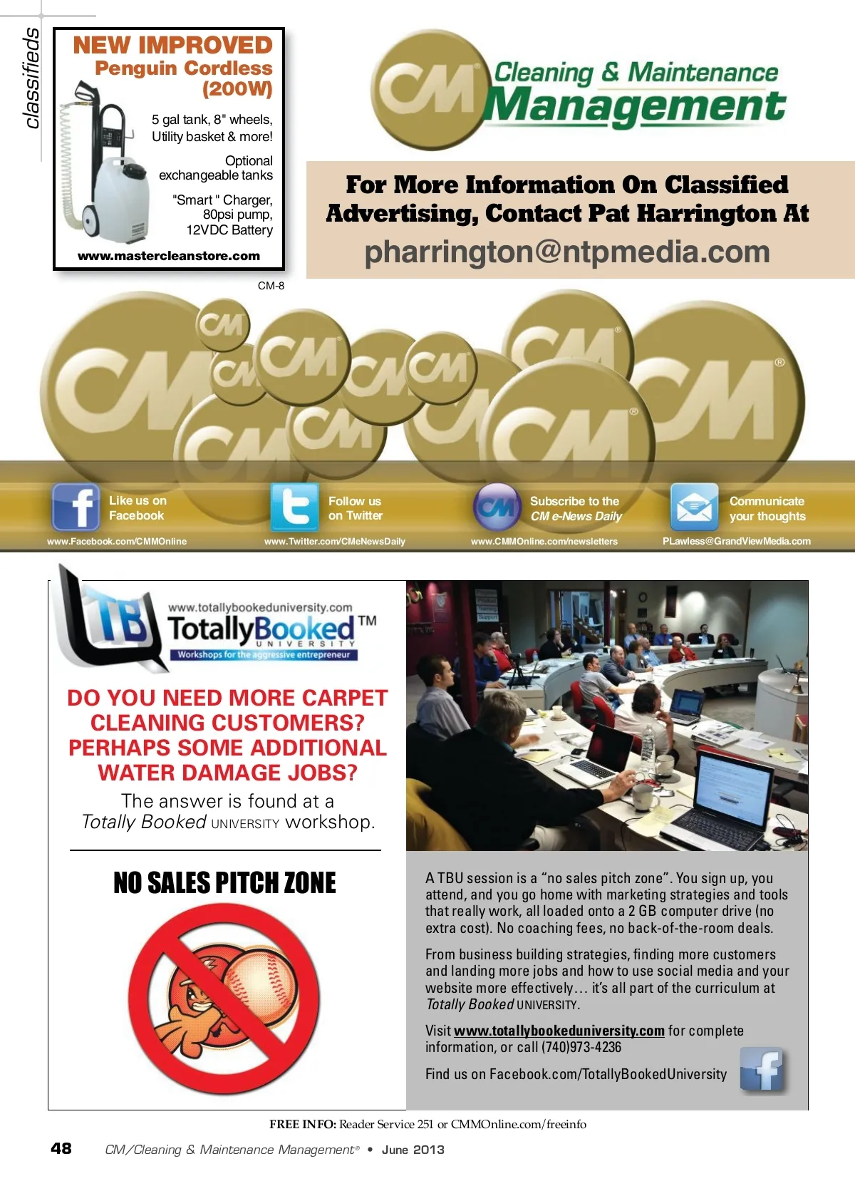classifieds NEW IMPROVED Penguin Cordless (200W) 5 gal tank, 8" wheels, Utility basket & more! Optional exchangeable tanks "Smart " Charger, 80psi pump, 12VDC Battery www.mastercleanstore.com CM-8 For More Information On Classified Advertising, Contact Pat Harrington At [email protected] Like us on Facebook www.Facebook.com/CMMOnline Follow us on Twitter www.Twitter.com/CMeNewsDaily Subscribe to the CM e-News Daily www.CMMOnline.com/newsletters Communicate your thoughts [email protected] DO YOU NEED MORE CARPET CLEANING CUSTOMERS? PERHAPS SOME ADDITIONAL WATER DAMAGE JOBS? The answer is found at a Totally Booked UNIVERSITY workshop. NO SALES PITCH ZONE A TBU session is a “no sales pitch zone”. You sign up, you attend, and you go home with marketing strategies and tools that really work, all loaded onto a 2 GB computer drive (no extra cost). No coaching fees, no back-of-the-room deals. From business building strategies, finding more customers and landing more jobs and how to use social media and your website more effectively… it’s all part of the curriculum at Totally Booked UNIVERSITY . Visit www.totallybookeduniversity.com for complete information, or call (740)973-4236 Find us on Facebook.com/TotallyBookedUniversity FREE INFO: Reader Service 251 or CMMOnline.com/freeinfo 48 CM/Cleaning & Maintenance Management ® • June 2013