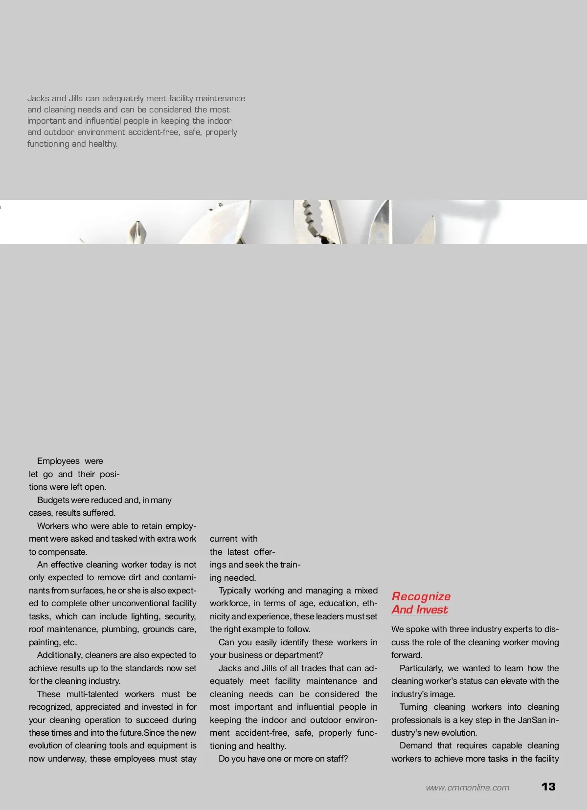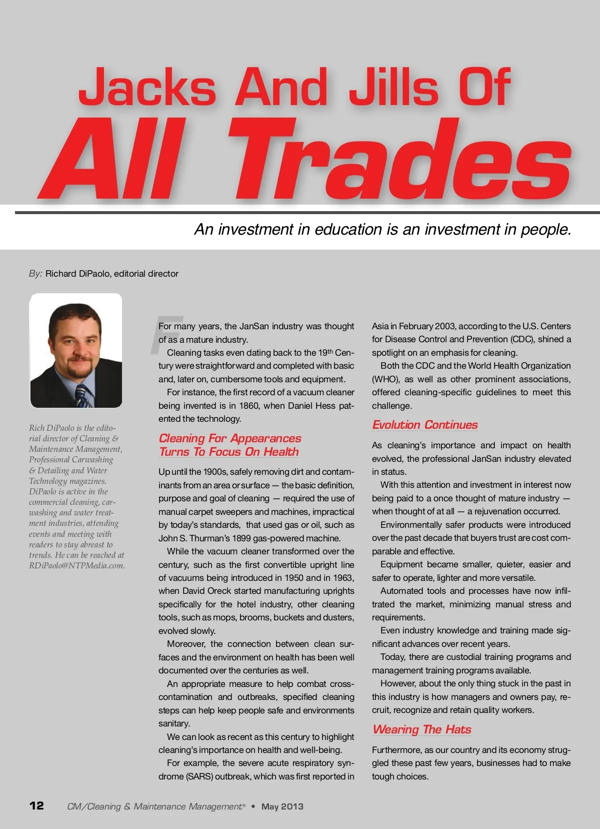Jacks And Jills Of All Trades An investment in education is an investment in people. By: Richard DiPaolo, editorial director F Rich DiPaolo is the edito-rial director of Cleaning & Maintenance Management, Professional Carwashing & Detailing and Water Technology magazines. DiPaolo is active in the commercial cleaning, car-washing and water treat-ment industries, attending events and meeting with readers to stay abreast to trends. He can be reached at [email protected]. For many years, the JanSan industry was thought of as a mature industry. Cleaning tasks even dating back to the 19 th Cen-tury were straightforward and completed with basic and, later on, cumbersome tools and equipment. For instance, the first record of a vacuum cleaner being invented is in 1860, when Daniel Hess pat-ented the technology. Asia in February 2003, according to the U.S. Centers for Disease Control and Prevention (CDC), shined a spotlight on an emphasis for cleaning. Both the CDC and the World Health Organization (WHO), as well as other prominent associations, offered cleaning-specific guidelines to meet this challenge. Evolution Continues As cleaning’s importance and impact on health evolved, the professional JanSan industry elevated in status. With this attention and investment in interest now being paid to a once thought of mature industry — when thought of at all — a rejuvenation occurred. Environmentally safer products were introduced over the past decade that buyers trust are cost com-parable and effective. Equipment became smaller, quieter, easier and safer to operate, lighter and more versatile. Automated tools and processes have now infil-trated the market, minimizing manual stress and requirements. Even industry knowledge and training made sig-nificant advances over recent years. Today, there are custodial training programs and management training programs available. However, about the only thing stuck in the past in this industry is how managers and owners pay, re-cruit, recognize and retain quality workers. Cleaning For Appearances Turns To Focus On Health Up until the 1900s, safely removing dirt and contam-inants from an area or surface — the basic definition, purpose and goal of cleaning — required the use of manual carpet sweepers and machines, impractical by today’s standards, that used gas or oil, such as John S. Thurman’s 1899 gas-powered machine. While the vacuum cleaner transformed over the century, such as the first convertible upright line of vacuums being introduced in 1950 and in 1963, when David Oreck started manufacturing uprights specifically for the hotel industry, other cleaning tools, such as mops, brooms, buckets and dusters, evolved slowly. Moreover, the connection between clean sur-faces and the environment on health has been well documented over the centuries as well. An appropriate measure to help combat cross-contamination and outbreaks, specified cleaning steps can help keep people safe and environments sanitary. We can look as recent as this century to highlight cleaning’s importance on health and well-being. For example, the severe acute respiratory syn-drome (SARS) outbreak, which was first reported in Wearing The Hats Furthermore, as our country and its economy strug-gled these past few years, businesses had to make tough choices. 12 CM/Cleaning & Maintenance Management ® • May 2013