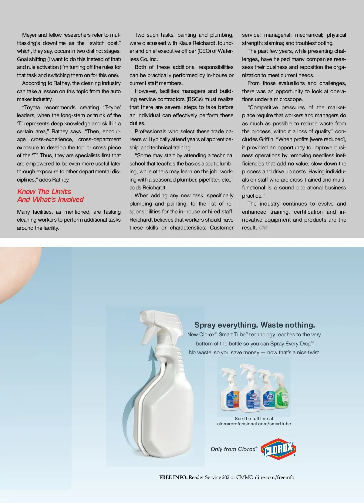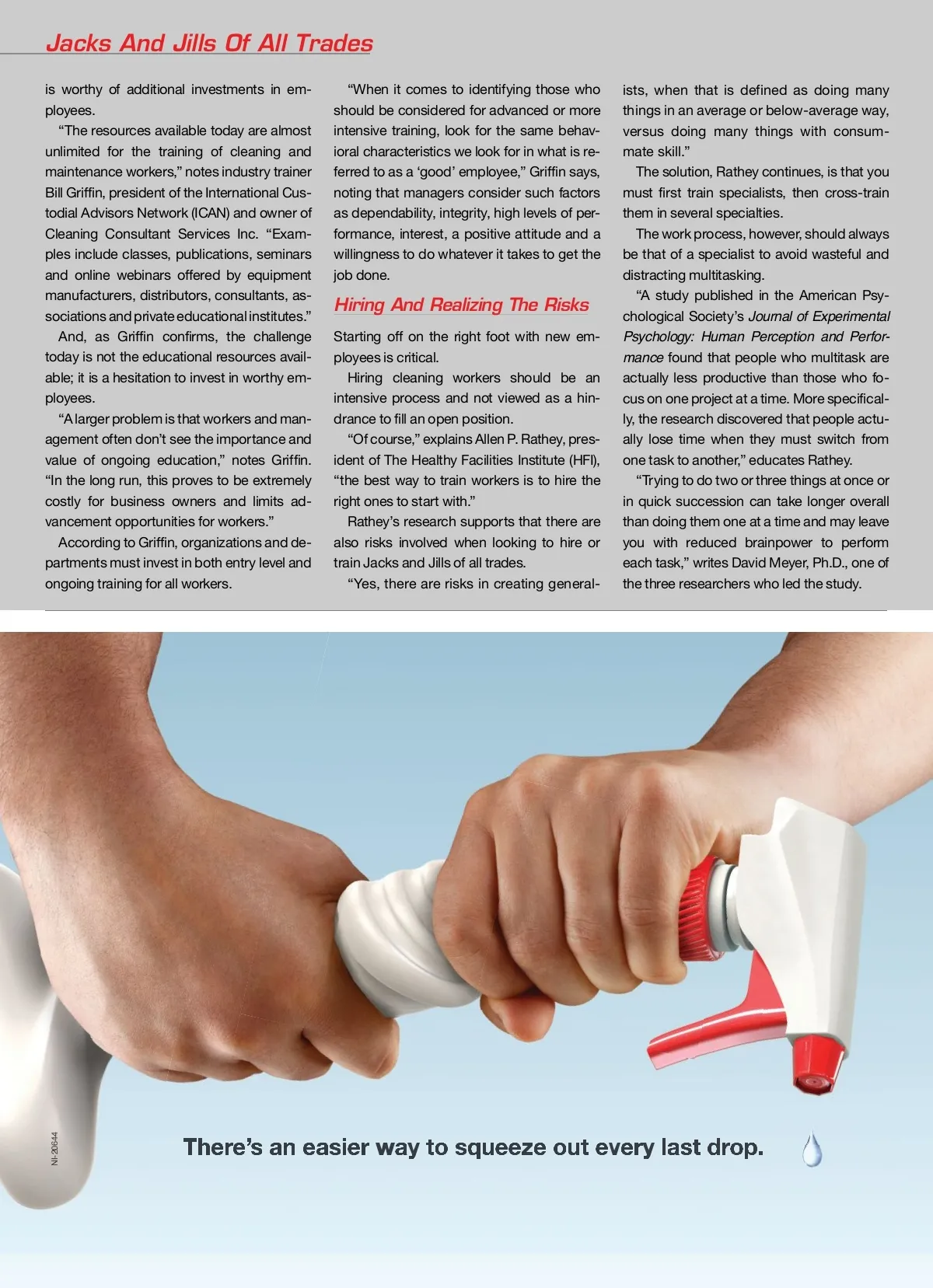 Jacks And Jills Of All Trades is worthy of additional investments in em-ployees. “The resources available today are almost unlimited for the training of cleaning and maintenance workers,” notes industry trainer Bill Griffin, president of the International Cus-todial Advisors Network (ICAN) and owner of Cleaning Consultant Services Inc. “Exam-ples include classes, publications, seminars and online webinars offered by equipment manufacturers, distributors, consultants, as-sociations and private educational institutes.” And, as Griffin confirms, the challenge today is not the educational resources avail-able; it is a hesitation to invest in worthy em-ployees. “A larger problem is that workers and man-agement often don’t see the importance and value of ongoing education,” notes Griffin. “In the long run, this proves to be extremely costly for business owners and limits ad-vancement opportunities for workers.” According to Griffin, organizations and de-partments must invest in both entry level and ongoing training for all workers. “When it comes to identifying those who should be considered for advanced or more intensive training, look for the same behav-ioral characteristics we look for in what is re-ferred to as a ‘good’ employee,” Griffin says, noting that managers consider such factors as dependability, integrity, high levels of per-formance, interest, a positive attitude and a willingness to do whatever it takes to get the job done. ists, when that is defined as doing many things in an average or below-average way, versus doing many things with consum-mate skill.” The solution, Rathey continues, is that you must first train specialists, then cross-train them in several specialties. The work process, however, should always be that of a specialist to avoid wasteful and distracting multitasking. “A study published in the American Psy-chological Society’s Journal of Experimental Psychology: Human Perception and Perfor-mance found that people who multitask are actually less productive than those who fo-cus on one project at a time. More specifical-ly, the research discovered that people actu-ally lose time when they must switch from one task to another,” educates Rathey. “Trying to do two or three things at once or in quick succession can take longer overall than doing them one at a time and may leave you with reduced brainpower to perform each task,” writes David Meyer, Ph.D., one of the three researchers who led the study. Hiring And Realizing The Risks Starting off on the right foot with new em-ployees is critical. Hiring cleaning workers should be an intensive process and not viewed as a hin-drance to fill an open position. “Of course,” explains Allen P. Rathey, pres-ident of The Healthy Facilities Institute (HFI), “the best way to train workers is to hire the right ones to start with.” Rathey’s research supports that there are also risks involved when looking to hire or train Jacks and Jills of all trades. “Yes, there are risks in creating general-NI-2 NI-2 064 0 644 44