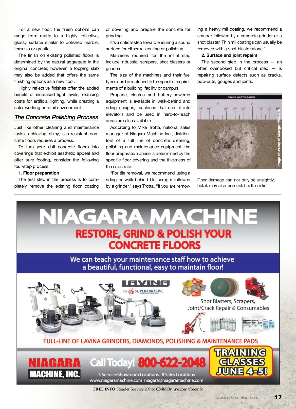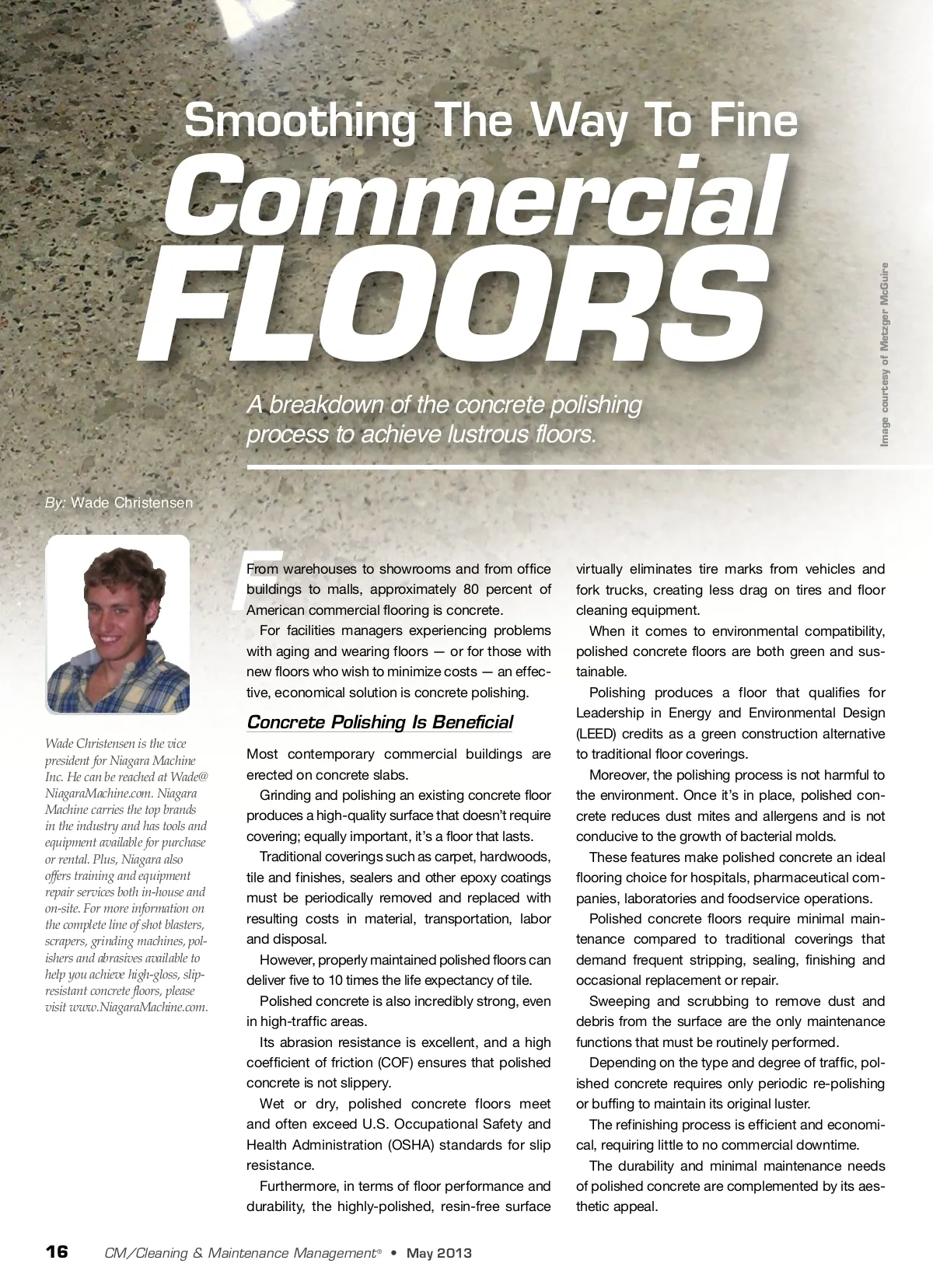 Smoothing The Way To Fine Commercial A breakdown of the concrete polishing process to achieve lustrous floors. By: Wade Christensen Image courtesy of Metzger McGuire FLOORS F Wade Christensen is the vice president for Niagara Machine Inc. He can be reached at Wade@ NiagaraMachine.com. Niagara Machine carries the top brands in the industry and has tools and equipment available for purchase or rental. Plus, Niagara also offers training and equipment repair services both in-house and on-site. For more information on the complete line of shot blasters, scrapers, grinding machines, pol-ishers and abrasives available to help you achieve high-gloss, slip-resistant concrete floors, please visit www.NiagaraMachine.com. From warehouses to showrooms and from office buildings to malls, approximately 80 percent of American commercial flooring is concrete. For facilities managers experiencing problems with aging and wearing floors — or for those with new floors who wish to minimize costs — an effec-tive, economical solution is concrete polishing. Concrete Polishing Is Beneficial Most contemporary commercial buildings are erected on concrete slabs. Grinding and polishing an existing concrete floor produces a high-quality surface that doesn’t require covering; equally important, it’s a floor that lasts. Traditional coverings such as carpet, hardwoods, tile and finishes, sealers and other epoxy coatings must be periodically removed and replaced with resulting costs in material, transportation, labor and disposal. However, properly maintained polished floors can deliver five to 10 times the life expectancy of tile. Polished concrete is also incredibly strong, even in high-traffic areas. Its abrasion resistance is excellent, and a high coefficient of friction (COF) ensures that polished concrete is not slippery. Wet or dry, polished concrete floors meet and often exceed U.S. Occupational Safety and Health Administration (OSHA) standards for slip resistance. Furthermore, in terms of floor performance and durability, the highly-polished, resin-free surface virtually eliminates tire marks from vehicles and fork trucks, creating less drag on tires and floor cleaning equipment. When it comes to environmental compatibility, polished concrete floors are both green and sus-tainable. Polishing produces a floor that qualifies for Leadership in Energy and Environmental Design (LEED) credits as a green construction alternative to traditional floor coverings. Moreover, the polishing process is not harmful to the environment. Once it’s in place, polished con-crete reduces dust mites and allergens and is not conducive to the growth of bacterial molds. These features make polished concrete an ideal flooring choice for hospitals, pharmaceutical com-panies, laboratories and foodservice operations. Polished concrete floors require minimal main-tenance compared to traditional coverings that demand frequent stripping, sealing, finishing and occasional replacement or repair. Sweeping and scrubbing to remove dust and debris from the surface are the only maintenance functions that must be routinely performed. Depending on the type and degree of traffic, pol-ished concrete requires only periodic re-polishing or buffing to maintain its original luster. The refinishing process is efficient and economi-cal, requiring little to no commercial downtime. The durability and minimal maintenance needs of polished concrete are complemented by its aes-thetic appeal. 16 CM/Cleaning & Maintenance Management ® • May 2013