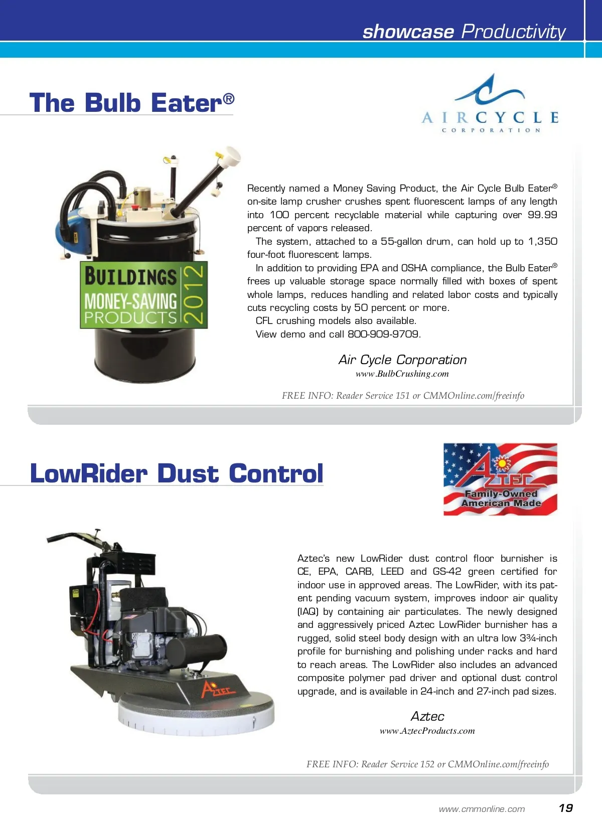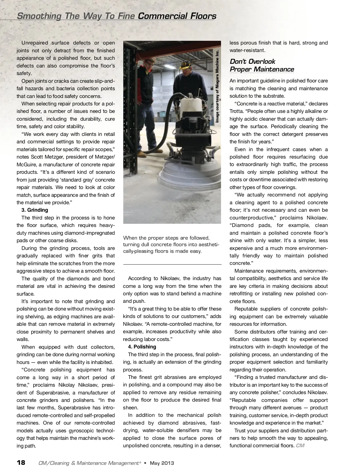 Smoothing The Way To Fine Commercial Floors Unrepaired surface defects or open joints not only detract from the finished appearance of a polished floor, but such defects can also compromise the floor’s safety. Open joints or cracks can create slip-and-fall hazards and bacteria collection points that can lead to food safety concerns. When selecting repair products for a pol-ished floor, a number of issues need to be considered, including the durability, cure time, safety and color stability. “We work every day with clients in retail and commercial settings to provide repair materials tailored for specific repair scopes,” notes Scott Metzger, president of Metzger/ McGuire, a manufacturer of concrete repair products. “It’s a different kind of scenario from just providing ‘standard gray’ concrete repair materials. We need to look at color match, surface appearance and the finish of the material we provide.” 3. Grinding The third step in the process is to hone the floor surface, which requires heavy-duty machines using diamond-impregnated pads or other coarse disks. During the grinding process, tools are gradually replaced with finer grits that help eliminate the scratches from the more aggressive steps to achieve a smooth floor. The quality of the diamonds and bond material are vital in achieving the desired surface. It’s important to note that grinding and polishing can be done without moving exist-ing shelving, as edging machines are avail-able that can remove material in extremely close proximity to permanent shelves and walls. When equipped with dust collectors, grinding can be done during normal working hours — even while the facility is inhabited. “Concrete polishing equipment has come a long way in a short period of time,” proclaims Nikolay Nikolaev, presi-dent of Superabrasive, a manufacturer of concrete grinders and polishers. “In the last few months, Superabrasive has intro-duced remote-controlled and self-propelled machines. One of our remote-controlled models actually uses gyroscopic technol-ogy that helps maintain the machine’s work-ing path. less porous finish that is hard, strong and water-resistant. Image courtesy of Niagara Machine Inc. Don’t Overlook Proper Maintenance An important guideline in polished floor care is matching the cleaning and maintenance solution to the substrate. “Concrete is a reactive material,” declares Trotta. “People often use a highly alkaline or highly acidic cleaner that can actually dam-age the surface. Periodically cleaning the floor with the correct detergent preserves the finish for years.” Even in the infrequent cases when a polished floor requires resurfacing due to extraordinarily high traffic, the process entails only simple polishing without the costs or downtime associated with restoring other types of floor coverings. “We actually recommend not applying a cleaning agent to a polished concrete floor; it’s not necessary and can even be counterproductive,” proclaims Nikolaev. “Diamond pads, for example, clean and maintain a polished concrete floor’s shine with only water. It’s a simpler, less expensive and a much more environmen-tally friendly way to maintain polished concrete.” Maintenance requirements, environmen-tal compatibility, aesthetics and service life are key criteria in making decisions about retrofitting or installing new polished con-crete floors. Reputable suppliers of concrete polish-ing equipment can be extremely valuable resources for information. Some distributors offer training and cer-tification classes taught by experienced instructors with in-depth knowledge of the polishing process, an understanding of the proper equipment selection and familiarity regarding their operation. “Finding a trusted manufacturer and dis-tributor is an important key to the success of any concrete polisher,” concludes Nikolaev. “Reputable companies offer support through many different avenues — product training, customer service, in-depth product knowledge and experience in the market.” Trust your suppliers and distribution part-ners to help smooth the way to appealing, functional commercial floors. CM When the proper steps are followed, turning dull concrete floors into aestheti-cally-pleasing floors is made easy. According to Nikolaev, the industry has come a long way from the time when the only option was to stand behind a machine and push. “It’s a great thing to be able to offer these kinds of solutions to our customers,” adds Nikolaev. “A remote-controlled machine, for example, increases productivity while also reducing labor costs.” 4. Polishing The third step in the process, final polish-ing, is actually an extension of the grinding process. The finest grit abrasives are employed in polishing, and a compound may also be applied to remove any residue remaining on the floor to produce the desired final sheen. In addition to the mechanical polish achieved by diamond abrasives, fast-drying, water-soluble densifiers may be applied to close the surface pores of unpolished concrete, resulting in a denser, 18 CM/Cleaning & Maintenance Management ® • May 2013