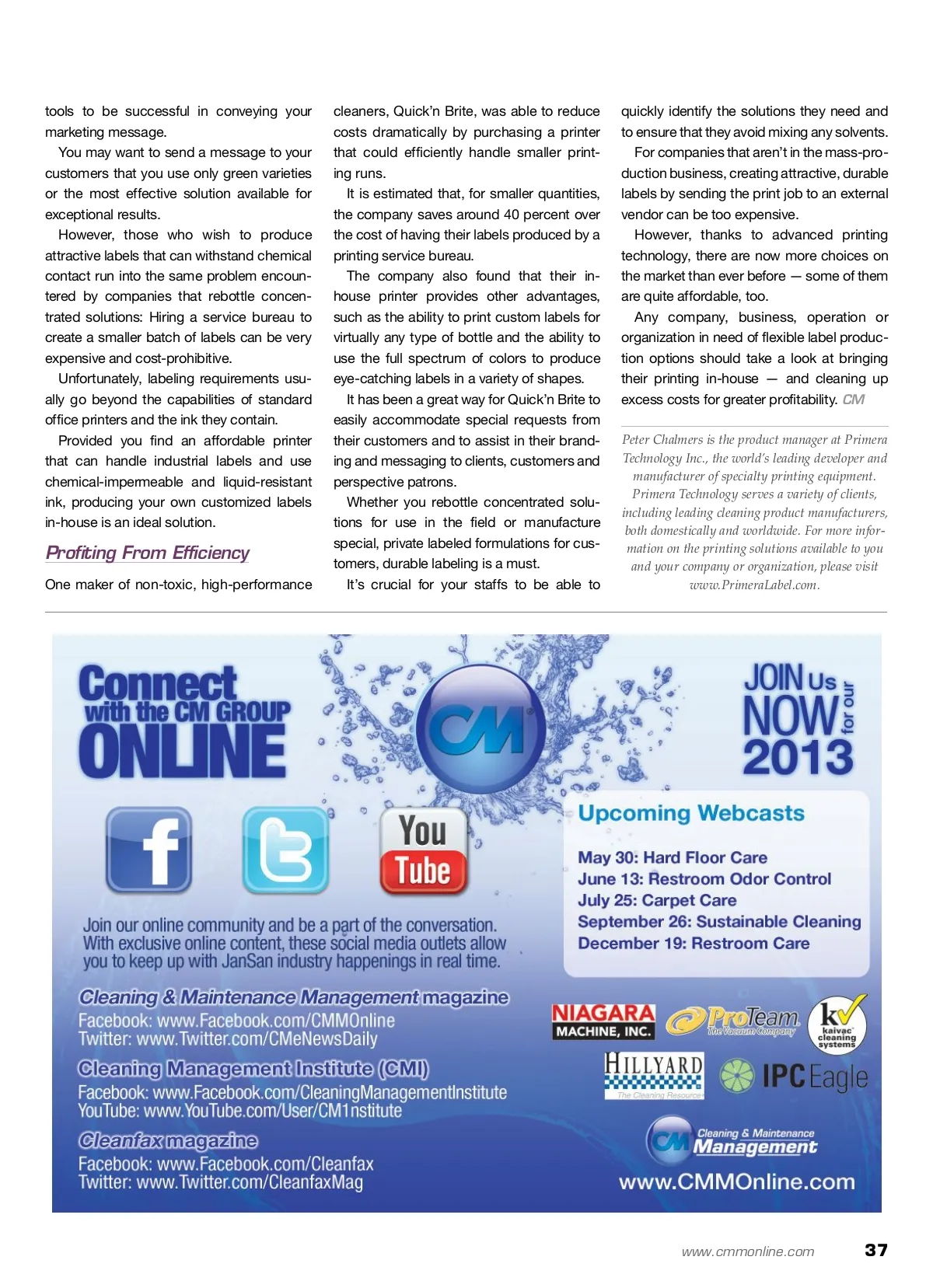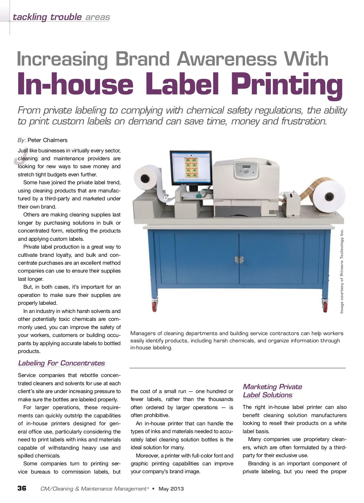 tackling trouble areas Increasing Brand Awareness With In-house Label Printing From private labeling to complying with chemical safety regulations, the ability to print custom labels on demand can save time, money and frustration. By: Peter Chalmers J Just like businesses in virtually every sector, cleaning and maintenance providers are looking for new ways to save money and stretch tight budgets even further. Some have joined the private label trend, using cleaning products that are manufac-tured by a third-party and marketed under their own brand. Others are making cleaning supplies last longer by purchasing solutions in bulk or concentrated form, rebottling the products and applying custom labels. Private label production is a great way to cultivate brand loyalty, and bulk and con-centrate purchases are an excellent method companies can use to ensure their supplies last longer. But, in both cases, it’s important for an operation to make sure their supplies are properly labeled. In an industry in which harsh solvents and other potentially toxic chemicals are com-monly used, you can improve the safety of your workers, customers or building occu-pants by applying accurate labels to bottled products. Managers of cleaning departments and building service contractors can help workers easily identify products, including harsh chemicals, and organize information through in-house labeling. Labeling For Concentrates Service companies that rebottle concen-trated cleaners and solvents for use at each client’s site are under increasing pressure to make sure the bottles are labeled properly. For larger operations, these require-ments can quickly outstrip the capabilities of in-house printers designed for gen-eral office use, particularly considering the need to print labels with inks and materials capable of withstanding heavy use and spilled chemicals. Some companies turn to printing ser-vice bureaus to commission labels, but the cost of a small run — one hundred or fewer labels, rather than the thousands often ordered by larger operations — is often prohibitive. An in-house printer that can handle the types of inks and materials needed to accu-rately label cleaning solution bottles is the ideal solution for many. Moreover, a printer with full-color font and graphic printing capabilities can improve your company’s brand image. Marketing Private Label Solutions The right in-house label printer can also benefit cleaning solution manufacturers looking to resell their products on a white label basis. Many companies use proprietary clean-ers, which are often formulated by a third-party for their exclusive use. Branding is an important component of private labeling, but you need the proper 36 CM/Cleaning & Maintenance Management ® • May 2013 Image courtesy of Primera Technology Inc.