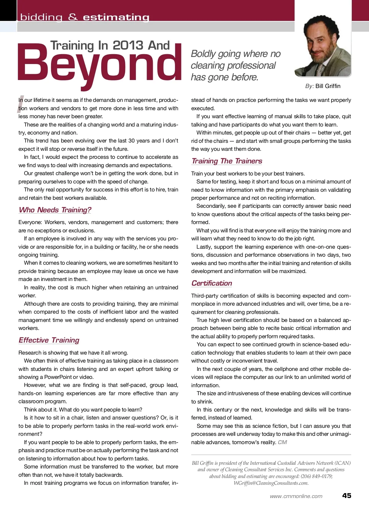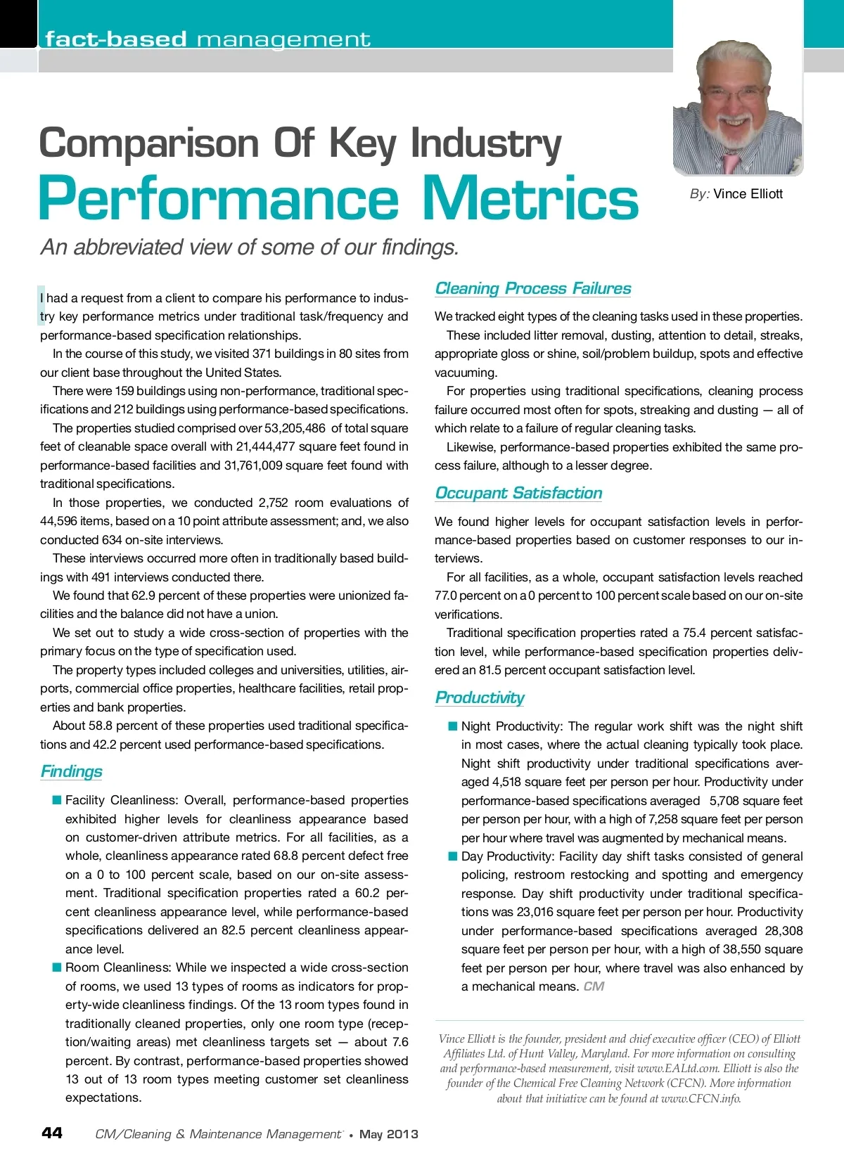 fact-based management Comparison Of Key Industry Performance Metrics An abbreviated view of some of our findings. By: Vince Elliott I I had a request from a client to compare his performance to indus-try key performance metrics under traditional task/frequency and performance-based specification relationships. In the course of this study, we visited 371 buildings in 80 sites from our client base throughout the United States. There were 159 buildings using non-performance, traditional spec-ifications and 212 buildings using performance-based specifications. The properties studied comprised over 53,205,486 of total square feet of cleanable space overall with 21,444,477 square feet found in performance-based facilities and 31,761,009 square feet found with traditional specifications. In those properties, we conducted 2,752 room evaluations of 44,596 items, based on a 10 point attribute assessment; and, we also conducted 634 on-site interviews. These interviews occurred more often in traditionally based build-ings with 491 interviews conducted there. We found that 62.9 percent of these properties were unionized fa-cilities and the balance did not have a union. We set out to study a wide cross-section of properties with the primary focus on the type of specification used. The property types included colleges and universities, utilities, air-ports, commercial office properties, healthcare facilities, retail prop-erties and bank properties. About 58.8 percent of these properties used traditional specifica-tions and 42.2 percent used performance-based specifications. Cleaning Process Failures We tracked eight types of the cleaning tasks used in these properties. These included litter removal, dusting, attention to detail, streaks, appropriate gloss or shine, soil/problem buildup, spots and effective vacuuming. For properties using traditional specifications, cleaning process failure occurred most often for spots, streaking and dusting — all of which relate to a failure of regular cleaning tasks. Likewise, performance-based properties exhibited the same pro-cess failure, although to a lesser degree. Occupant Satisfaction We found higher levels for occupant satisfaction levels in perfor-mance-based properties based on customer responses to our in-terviews. For all facilities, as a whole, occupant satisfaction levels reached 77.0 percent on a 0 percent to 100 percent scale based on our on-site verifications. Traditional specification properties rated a 75.4 percent satisfac-tion level, while performance-based specification properties deliv-ered an 81.5 percent occupant satisfaction level. Productivity ■ Night Productivity: The regular work shift was the night shift in most cases, where the actual cleaning typically took place. Night shift productivity under traditional specifications aver-aged 4,518 square feet per person per hour. Productivity under performance-based specifications averaged 5,708 square feet per person per hour, with a high of 7,258 square feet per person per hour where travel was augmented by mechanical means. ■ Day Productivity: Facility day shift tasks consisted of general policing, restroom restocking and spotting and emergency response. Day shift productivity under traditional specifica-tions was 23,016 square feet per person per hour. Productivity under performance-based specifications averaged 28,308 square feet per person per hour, with a high of 38,550 square feet per person per hour, where travel was also enhanced by a mechanical means. CM Findings ■ Facility Cleanliness: Overall, performance-based properties exhibited higher levels for cleanliness appearance based on customer-driven attribute metrics. For all facilities, as a whole, cleanliness appearance rated 68.8 percent defect free on a 0 to 100 percent scale, based on our on-site assess-ment. Traditional specification properties rated a 60.2 per-cent cleanliness appearance level, while performance-based specifications delivered an 82.5 percent cleanliness appear-ance level. ■ Room Cleanliness: While we inspected a wide cross-section of rooms, we used 13 types of rooms as indicators for prop-erty-wide cleanliness findings. Of the 13 room types found in traditionally cleaned properties, only one room type (recep-tion/waiting areas) met cleanliness targets set — about 7.6 percent. By contrast, performance-based properties showed 13 out of 13 room types meeting customer set cleanliness expectations. Vince Elliott is the founder, president and chief executive officer (CEO) of Elliott Affiliates Ltd. of Hunt Valley, Maryland. For more information on consulting and performance-based measurement, visit www.EALtd.com. Elliott is also the founder of the Chemical Free Cleaning Network (CFCN). More information about that initiative can be found at www.CFCN.info. 44 CM/Cleaning & Maintenance Management ® • May 2013