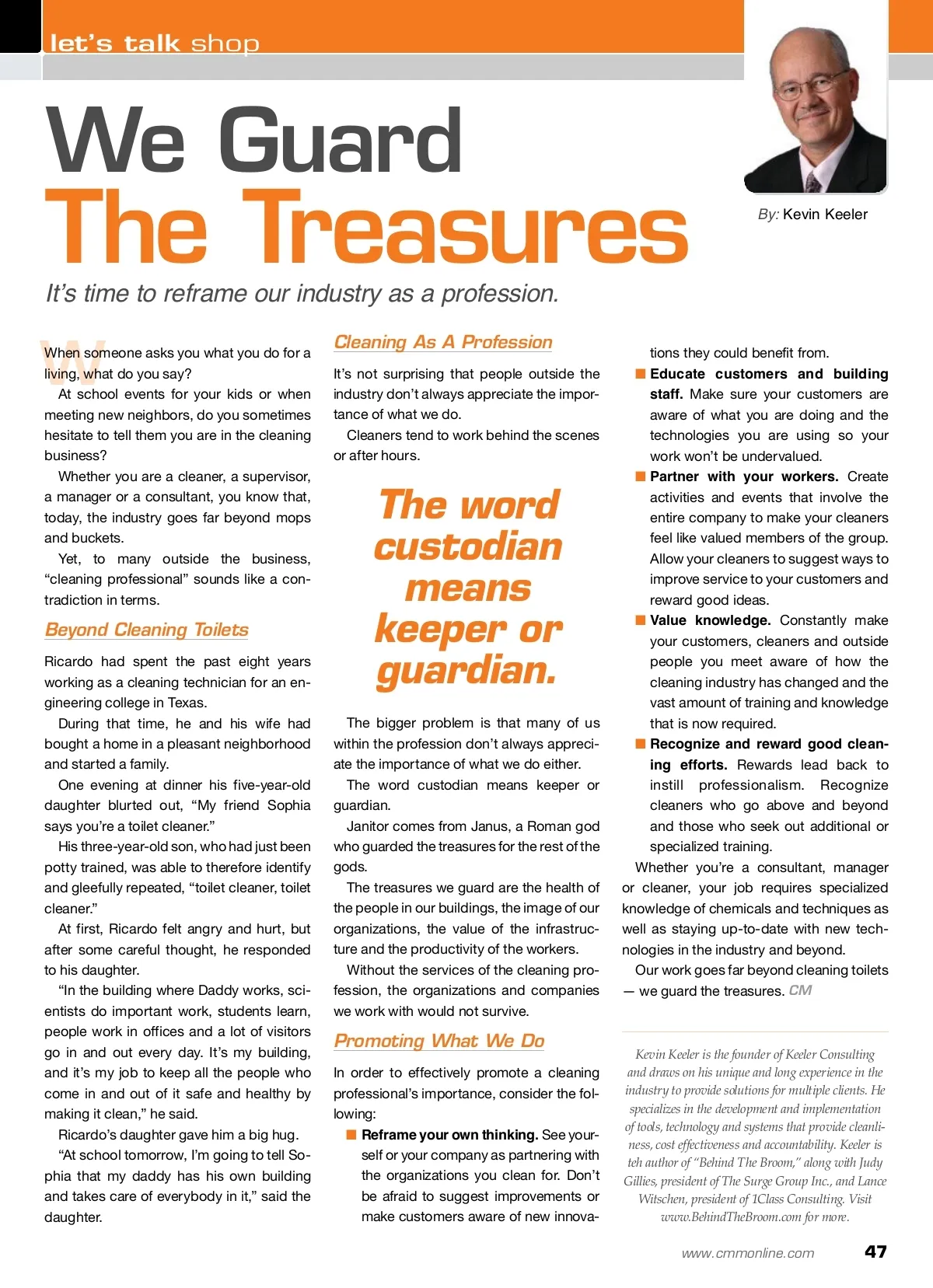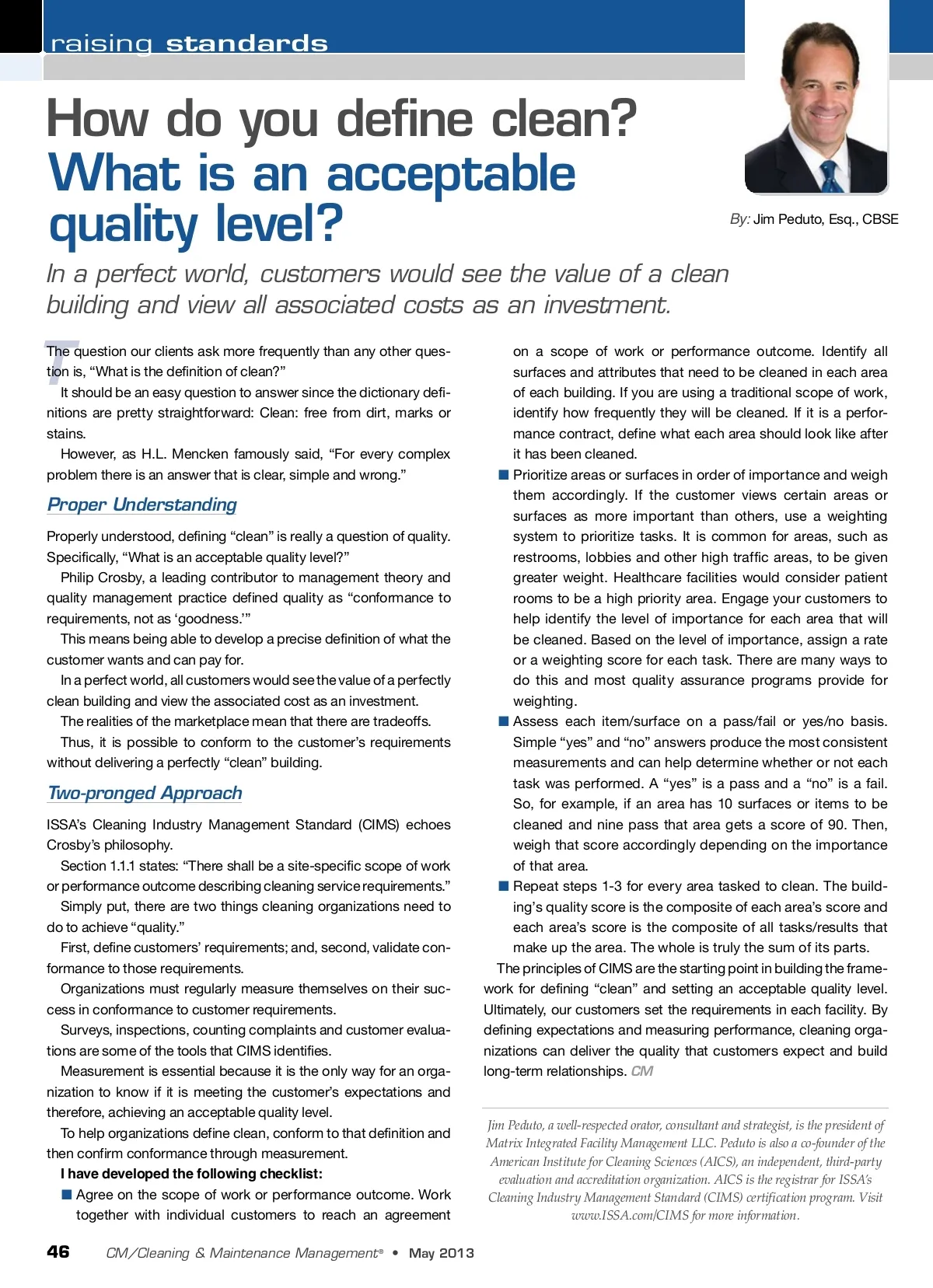 raising standards How do you define clean? What is an acceptable quality level? In a perfect world, customers would see the value of a clean building and view all associated costs as an investment. By: Jim Peduto, Esq., CBSE T The question our clients ask more frequently than any other ques-tion is, “What is the definition of clean?” It should be an easy question to answer since the dictionary defi-nitions are pretty straightforward: Clean: free from dirt, marks or stains. However, as H.L. Mencken famously said, “For every complex problem there is an answer that is clear, simple and wrong.” Proper Understanding Properly understood, defining “clean” is really a question of quality. Specifically, “What is an acceptable quality level?” Philip Crosby, a leading contributor to management theory and quality management practice defined quality as “conformance to requirements, not as ‘goodness.’” This means being able to develop a precise definition of what the customer wants and can pay for. In a perfect world, all customers would see the value of a perfectly clean building and view the associated cost as an investment. The realities of the marketplace mean that there are tradeoffs. Thus, it is possible to conform to the customer’s requirements without delivering a perfectly “clean” building. Two-pronged Approach ISSA’s Cleaning Industry Management Standard (CIMS) echoes Crosby’s philosophy. Section 1.1.1 states: “There shall be a site-specific scope of work or performance outcome describing cleaning service requirements.” Simply put, there are two things cleaning organizations need to do to achieve “quality.” First, define customers’ requirements; and, second, validate con-formance to those requirements. Organizations must regularly measure themselves on their suc-cess in conformance to customer requirements. Surveys, inspections, counting complaints and customer evalua-tions are some of the tools that CIMS identifies. Measurement is essential because it is the only way for an orga-nization to know if it is meeting the customer’s expectations and therefore, achieving an acceptable quality level. To help organizations define clean, conform to that definition and then confirm conformance through measurement. I have developed the following checklist: ■ Agree on the scope of work or performance outcome. Work together with individual customers to reach an agreement on a scope of work or performance outcome. Identify all surfaces and attributes that need to be cleaned in each area of each building. If you are using a traditional scope of work, identify how frequently they will be cleaned. If it is a perfor-mance contract, define what each area should look like after it has been cleaned. ■ Prioritize areas or surfaces in order of importance and weigh them accordingly. If the customer views certain areas or surfaces as more important than others, use a weighting system to prioritize tasks. It is common for areas, such as restrooms, lobbies and other high traffic areas, to be given greater weight. Healthcare facilities would consider patient rooms to be a high priority area. Engage your customers to help identify the level of importance for each area that will be cleaned. Based on the level of importance, assign a rate or a weighting score for each task. There are many ways to do this and most quality assurance programs provide for weighting. ■ Assess each item/surface on a pass/fail or yes/no basis. Simple “yes” and “no” answers produce the most consistent measurements and can help determine whether or not each task was performed. A “yes” is a pass and a “no” is a fail. So, for example, if an area has 10 surfaces or items to be cleaned and nine pass that area gets a score of 90. Then, weigh that score accordingly depending on the importance of that area. ■ Repeat steps 1-3 for every area tasked to clean. The build-ing’s quality score is the composite of each area’s score and each area’s score is the composite of all tasks/results that make up the area. The whole is truly the sum of its parts. The principles of CIMS are the starting point in building the frame-work for defining “clean” and setting an acceptable quality level. Ultimately, our customers set the requirements in each facility. By defining expectations and measuring performance, cleaning orga-nizations can deliver the quality that customers expect and build long-term relationships. CM Jim Peduto, a well-respected orator, consultant and strategist, is the president of Matrix Integrated Facility Management LLC. Peduto is also a co-founder of the American Institute for Cleaning Sciences (AICS), an independent, third-party evaluation and accreditation organization. AICS is the registrar for ISSA’s Cleaning Industry Management Standard (CIMS) certification program. Visit www.ISSA.com/CIMS for more information. 46 CM/Cleaning & Maintenance Management ® • May 2013
