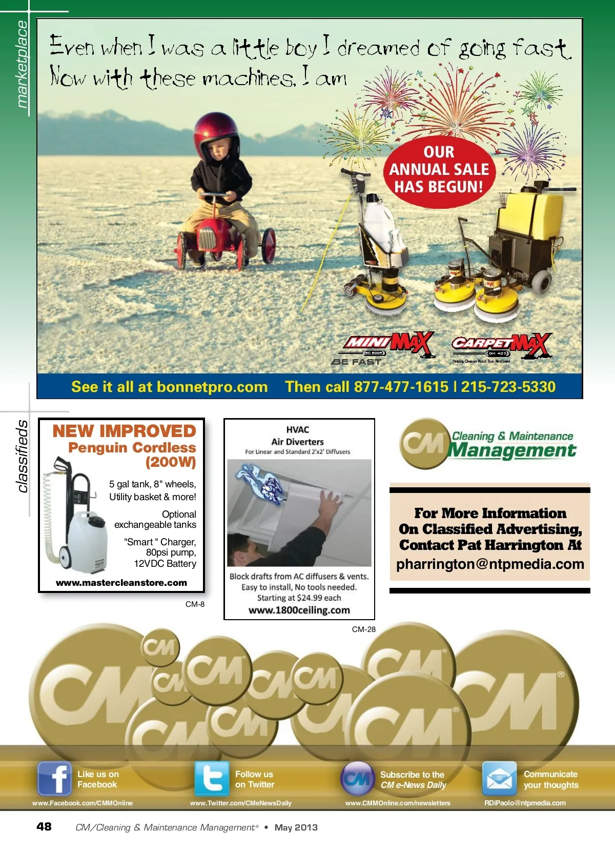 AM marketplace Page 1 OUR ANNUAL SALE HAS BEGUN! See it all at bonnetpro.com classifieds Then call 877-477-1615 | 215-723-5330 NEW IMPROVED Penguin Cordless (200W) 5 gal tank, 8" wheels, Utility basket & more! Optional exchangeable tanks "Smart " Charger, 80psi pump, 12VDC Battery www.mastercleanstore.com0 CM-8 For More Information On Classified Advertising, Contact Pat Harrington At [email protected] CM-28 Like us on Facebook www.Facebook.com/CMMOnline Follow us on Twitter www.Twitter.com/CMeNewsDaily Subscribe to the CM e-News Daily www.CMMOnline.com/newsletters Communicate your thoughts [email protected] 48 CM/Cleaning & Maintenance Management ® • May 2013
