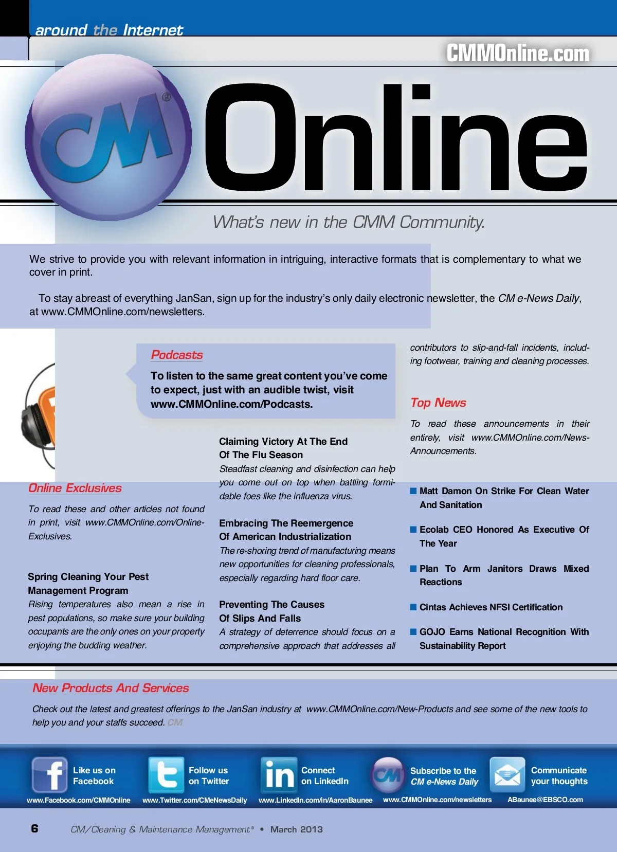 around the Internet CMMOnline.com Online What’s new in the CMM Community. We strive to provide you with relevant information in intriguing, interactive formats that is complementary to what we cover in print. To stay abreast of everything JanSan, sign up for the industry’s only daily electronic newsletter, the CM e-News Daily , at www.CMMOnline.com/newsletters. contributors to slip-and-fall incidents, includ-ing footwear, training and cleaning processes. Podcasts To listen to the same great content you’ve come to expect, just with an audible twist, visit www.CMMOnline.com/Podcasts. Top News To read these announcements in their entirely, visit www.CMMOnline.com/News-Announcements. ■ Matt Damon On Strike For Clean Water And Sanitation ■ Ecolab CEO Honored As Executive Of The Year ■ Plan To Arm Janitors Draws Mixed Reactions ■ Cintas Achieves NFSI Certification ■ GOJO Earns National Recognition With Sustainability Report Claiming Victory At The End Of The Flu Season Online Exclusives To read these and other articles not found in print, visit www.CMMOnline.com/Online-Exclusives. Steadfast cleaning and disinfection can help you come out on top when battling formi-dable foes like the influenza virus. Embracing The Reemergence Of American Industrialization The re-shoring trend of manufacturing means new opportunities for cleaning professionals, especially regarding hard floor care. Spring Cleaning Your Pest Management Program Rising temperatures also mean a rise in pest populations, so make sure your building occupants are the only ones on your property enjoying the budding weather. Preventing The Causes Of Slips And Falls A strategy of deterrence should focus on a comprehensive approach that addresses all New Products And Services Check out the latest and greatest offerings to the JanSan industry at www.CMMOnline.com/New-Products and see some of the new tools to help you and your staffs succeed. CM Like us on Facebook www.Facebook.com/CMMOnline Follow us on Twitter www.Twitter.com/CMeNewsDaily Connect on LinkedIn www.LinkedIn.com/in/AaronBaunee Subscribe to the CM e-News Daily www.CMMOnline.com/newsletters Communicate your thoughts [email protected] 6 CM/Cleaning & Maintenance Management ® • March 2013