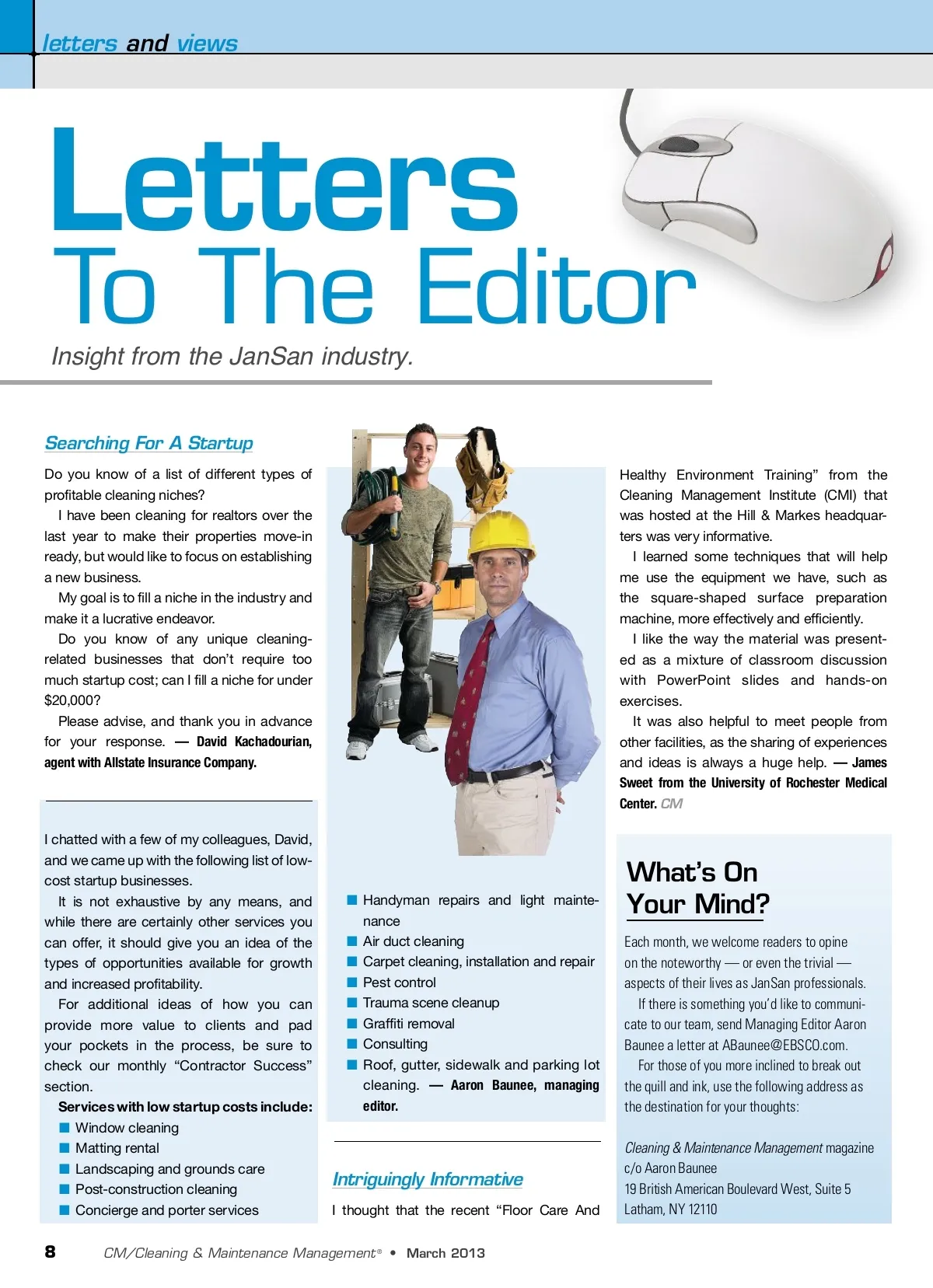 letters and views Letters To The Editor Insight from the JanSan industry. Searching For A Startup Do you know of a list of different types of profitable cleaning niches? I have been cleaning for realtors over the last year to make their properties move-in ready, but would like to focus on establishing a new business. My goal is to fill a niche in the industry and make it a lucrative endeavor. Do you know of any unique cleaning-related businesses that don’t require too much startup cost; can I fill a niche for under $20,000? Please advise, and thank you in advance for your response. — David Kachadourian, agent with Allstate Insurance Company. Healthy Environment Training” from the Cleaning Management Institute (CMI) that was hosted at the Hill & Markes headquar-ters was very informative. I learned some techniques that will help me use the equipment we have, such as the square-shaped surface preparation machine, more effectively and efficiently. I like the way the material was present-ed as a mixture of classroom discussion with PowerPoint slides and hands-on exercises. It was also helpful to meet people from other facilities, as the sharing of experiences and ideas is always a huge help. — James Sweet from the University of Rochester Medical Center. CM I chatted with a few of my colleagues, David, and we came up with the following list of low-cost startup businesses. It is not exhaustive by any means, and while there are certainly other services you can offer, it should give you an idea of the types of opportunities available for growth and increased profitability. For additional ideas of how you can provide more value to clients and pad your pockets in the process, be sure to check our monthly “Contractor Success” section. Services with low startup costs include: ■ Window cleaning ■ Matting rental ■ Landscaping and grounds care ■ Post-construction cleaning ■ Concierge and porter services ■ Handyman repairs and light mainte-nance ■ Air duct cleaning ■ Carpet cleaning, installation and repair ■ Pest control ■ Trauma scene cleanup ■ Graffiti removal ■ Consulting ■ Roof, gutter, sidewalk and parking lot cleaning. — Aaron Baunee, managing editor. What’s On Your Mind? Each month, we welcome readers to opine on the noteworthy — or even the trivial — aspects of their lives as JanSan professionals. If there is something you’d like to communi-cate to our team, send Managing Editor Aaron Baunee a letter at [email protected]. For those of you more inclined to break out the quill and ink, use the following address as the destination for your thoughts: Cleaning & Maintenance Management magazine c/o Aaron Baunee 19 British American Boulevard West, Suite 5 Latham, NY 12110 Intriguingly Informative I thought that the recent “Floor Care And 8 CM/Cleaning & Maintenance Management ® • March 2013