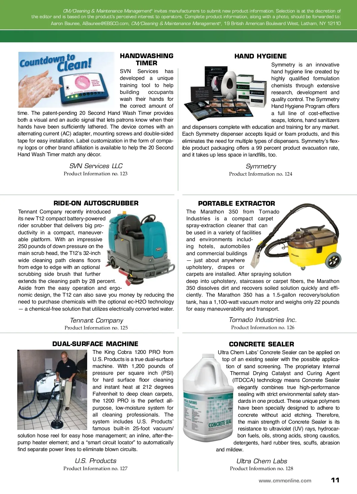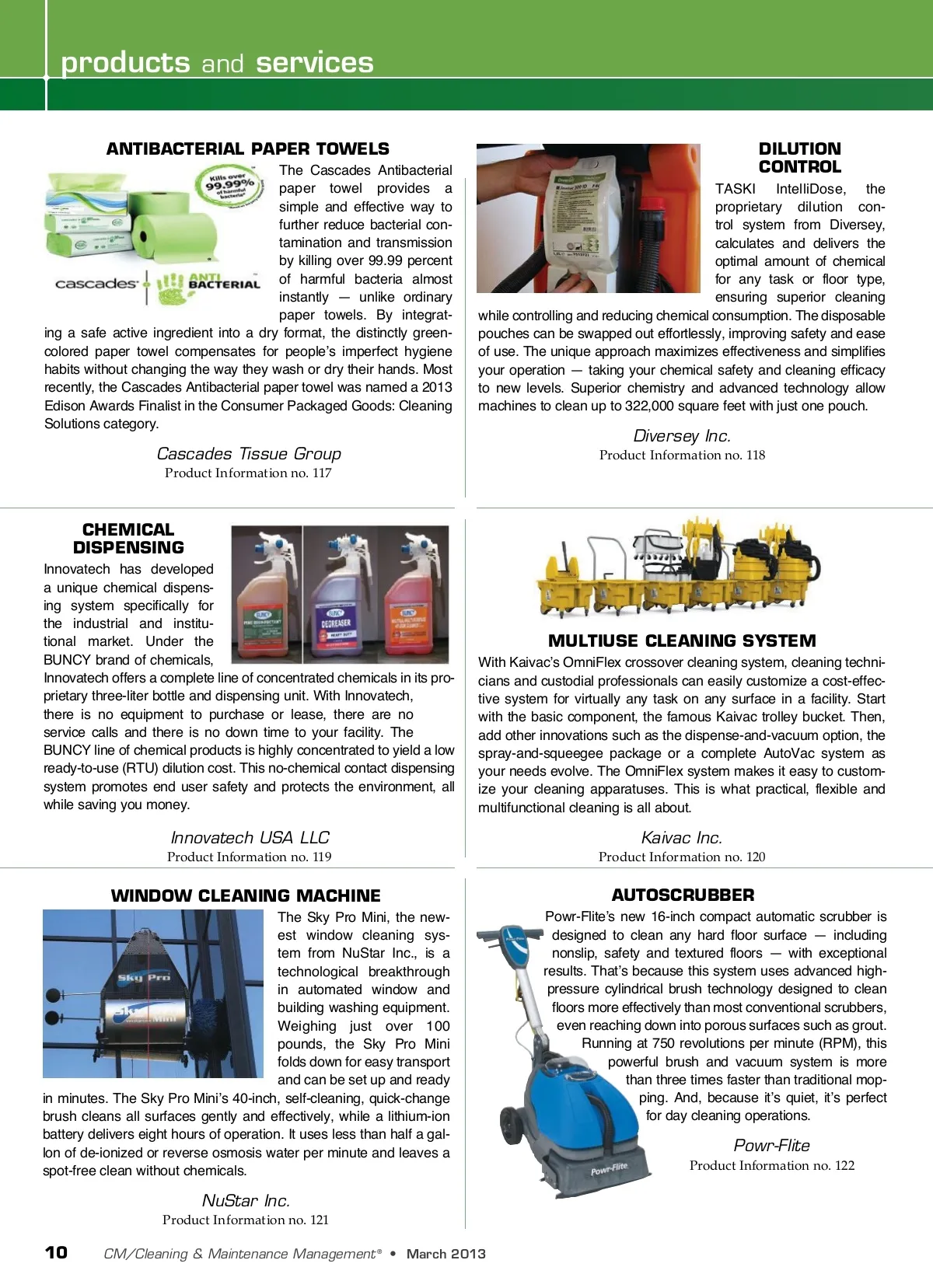 products and services ANTIBACTERIAL PAPER TOWELS The Cascades Antibacterial paper towel provides a simple and effective way to further reduce bacterial con-tamination and transmission by killing over 99.99 percent of harmful bacteria almost instantly — unlike ordinary paper towels. By integrat-ing a safe active ingredient into a dry format, the distinctly green-colored paper towel compensates for people’s imperfect hygiene habits without changing the way they wash or dry their hands. Most recently, the Cascades Antibacterial paper towel was named a 2013 Edison Awards Finalist in the Consumer Packaged Goods: Cleaning Solutions category. DILUTION CONTROL TASKI IntelliDose, the proprietary dilution con-trol system from Diversey, calculates and delivers the optimal amount of chemical for any task or floor type, ensuring superior cleaning while controlling and reducing chemical consumption. The disposable pouches can be swapped out effortlessly, improving safety and ease of use. The unique approach maximizes effectiveness and simplifies your operation — taking your chemical safety and cleaning efficacy to new levels. Superior chemistry and advanced technology allow machines to clean up to 322,000 square feet with just one pouch. Diversey Inc. Product Information no. 118 Cascades Tissue Group Product Information no. 117 CHEMICAL DISPENSING Innovatech has developed a unique chemical dispens-ing system specifically for the industrial and institu-tional market. Under the BUNCY brand of chemicals, Innovatech offers a complete line of concentrated chemicals in its pro-prietary three-liter bottle and dispensing unit. With Innovatech, there is no equipment to purchase or lease, there are no service calls and there is no down time to your facility. The BUNCY line of chemical products is highly concentrated to yield a low ready-to-use (RTU) dilution cost. This no-chemical contact dispensing system promotes end user safety and protects the environment, all while saving you money. With Kaivac’s OmniFlex crossover cleaning system, cleaning techni -cians and custodial professionals can easily customize a cost-effec-tive system for virtually any task on any surface in a facility. Start with the basic component, the famous Kaivac trolley bucket. Then, add other innovations such as the dispense-and-vacuum option, the spray-and-squeegee package or a complete AutoVac system as your needs evolve. The OmniFlex system makes it easy to custom -ize your cleaning apparatuses. This is what practical, flexible and multifunctional cleaning is all about. MULTIUSE CLEANING SYSTEM Innovatech USA LLC Product Information no. 119 Kaivac Inc. Product Information no. 120 WINDOW CLEANING MACHINE The Sky Pro Mini, the new-est window cleaning sys-tem from NuStar Inc., is a technological breakthrough in automated window and building washing equipment. Weighing just over 100 pounds, the Sky Pro Mini folds down for easy transport and can be set up and ready in minutes. The Sky Pro Mini’s 40-inch, self-cleaning, quick-change brush cleans all surfaces gently and effectively, while a lithium-ion battery delivers eight hours of operation. It uses less than half a gal-lon of de-ionized or reverse osmosis water per minute and leaves a spot-free clean without chemicals. Powr-Flite’s new 16-inch compact automatic scrubber is designed to clean any hard floor surface — including nonslip, safety and textured floors — with exceptional results. That’s because this system uses advanced high-pressure cylindrical brush technology designed to clean floors more effectively than most conventional scrubbers, even reaching down into porous surfaces such as grout. Running at 750 revolutions per minute (RPM), this powerful brush and vacuum system is more than three times faster than traditional mop-ping. And, because it’s quiet, it’s perfect for day cleaning operations. AUTOSCRUBBER Powr-Flite Product Information no. 122 NuStar Inc. Product Information no. 121 10 CM/Cleaning & Maintenance Management ® • March 2013