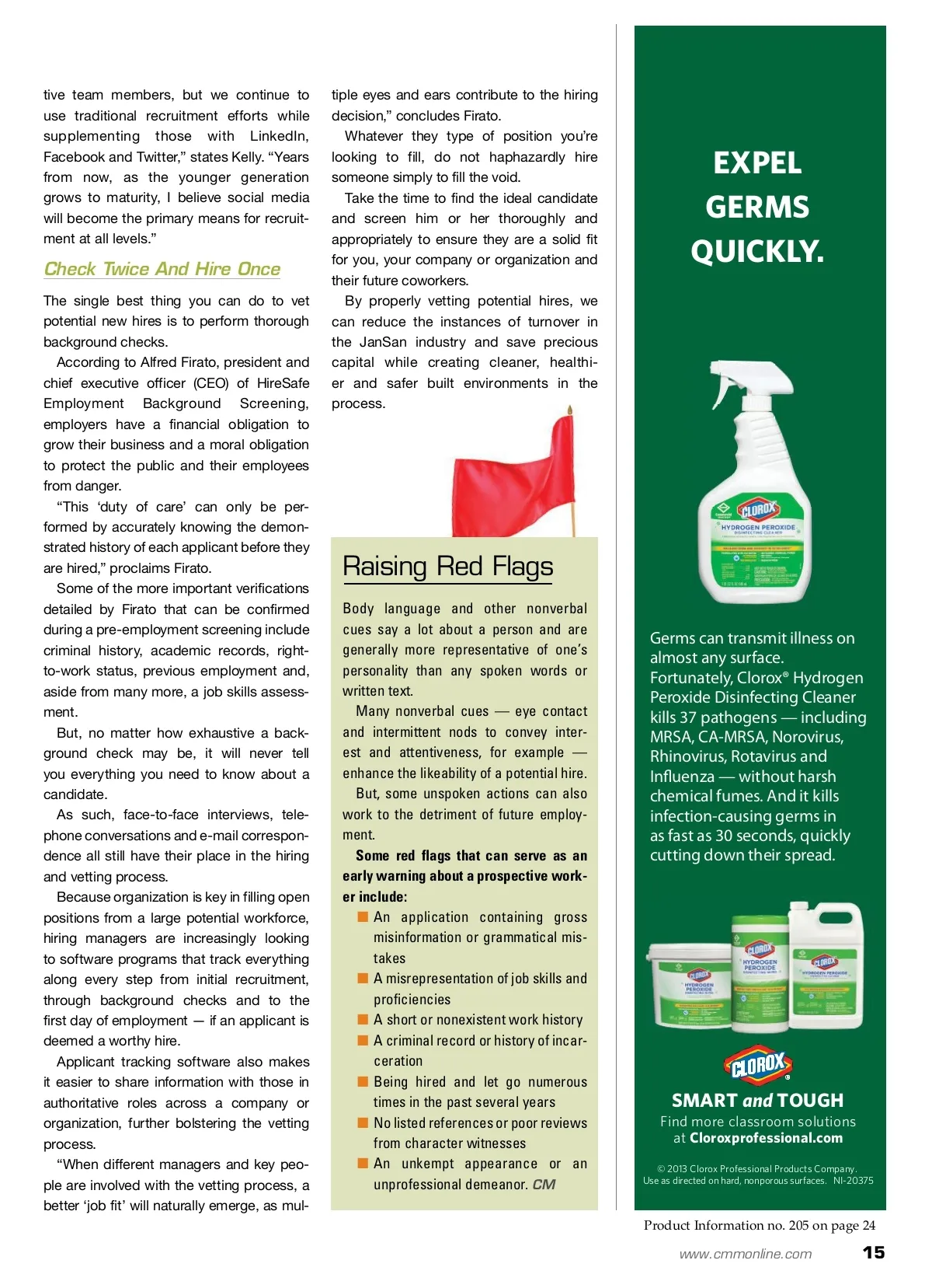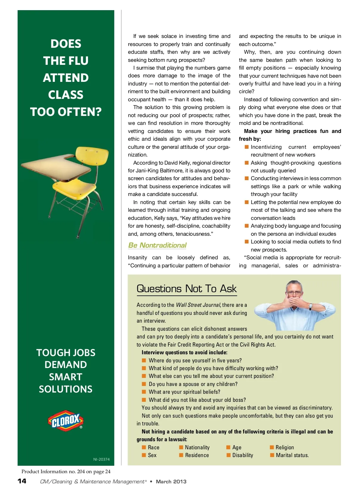 DOES THE FLU ATTEND CLASS TOO OFTEN? If we seek solace in investing time and resources to properly train and continually educate staffs, then why are we actively seeking bottom rung prospects? I surmise that playing the numbers game does more damage to the image of the industry — not to mention the potential det-riment to the built environment and building occupant health — than it does help. The solution to this growing problem is not reducing our pool of prospects; rather, we can find resolution in more thoroughly vetting candidates to ensure their work ethic and ideals align with your corporate culture or the general attitude of your orga-nization. According to David Kelly, regional director for Jani-King Baltimore, it is always good to screen candidates for attitudes and behav-iors that business experience indicates will make a candidate successful. In noting that certain key skills can be learned through initial training and ongoing education, Kelly says, “Key attitudes we hire for are honesty, self-discipline, coachability and, among others, tenaciousness.” Be Nontraditional Insanity can be loosely defined as, “Continuing a particular pattern of behavior and expecting the results to be unique in each outcome.” Why, then, are you continuing down the same beaten path when looking to fill empty positions — especially knowing that your current techniques have not been overly fruitful and have lead you in a hiring circle? Instead of following convention and sim-ply doing what everyone else does or that which you have done in the past, break the mold and be nontraditional. Make your hiring practices fun and fresh by: ■ Incentivizing current employees’ recruitment of new workers ■ Asking thought-provoking questions not usually queried ■ Conducting interviews in less common settings like a park or while walking through your facility ■ Letting the potential new employee do most of the talking and see where the conversation leads ■ Analyzing body language and focusing on the persona an individual exudes ■ Looking to social media outlets to find new prospects. “Social media is appropriate for recruit-ing managerial, sales or administra-Questions Not To Ask According to the Wall Street Journal , there are a handful of questions you should never ask during an interview. These questions can elicit dishonest answers and can pry too deeply into a candidate’s personal life, and you certainly do not want to violate the Fair Credit Reporting Act or the Civil Rights Act. Interview questions to avoid include: ■ Where do you see yourself in five years? ■ What kind of people do you have difficulty working with? ■ What else can you tell me about your current position? ■ Do you have a spouse or any children? ■ What are your spiritual beliefs? ■ What did you not like about your old boss? You should always try and avoid any inquiries that can be viewed as discriminatory. Not only can such questions make people uncomfortable, but they can also get you in trouble. Not hiring a candidate based on any of the following criteria is illegal and can be grounds for a lawsuit: ■ Race ■ Nationality ■ Age ■ Religion ■ Sex ■ Residence ■ Disability ■ Marital status. TOUGH JOBS DEMAND SMART SOLUTIONS NI-20374 Product Information no. 204 on page 24 14 CM/Cleaning & Maintenance Management ® • March 2013