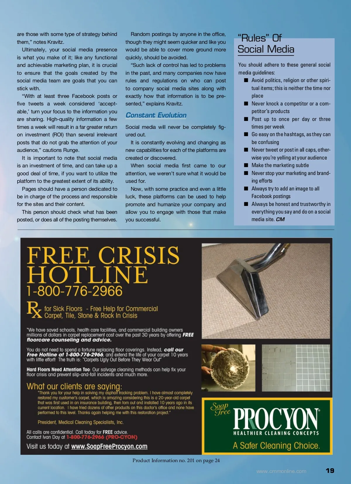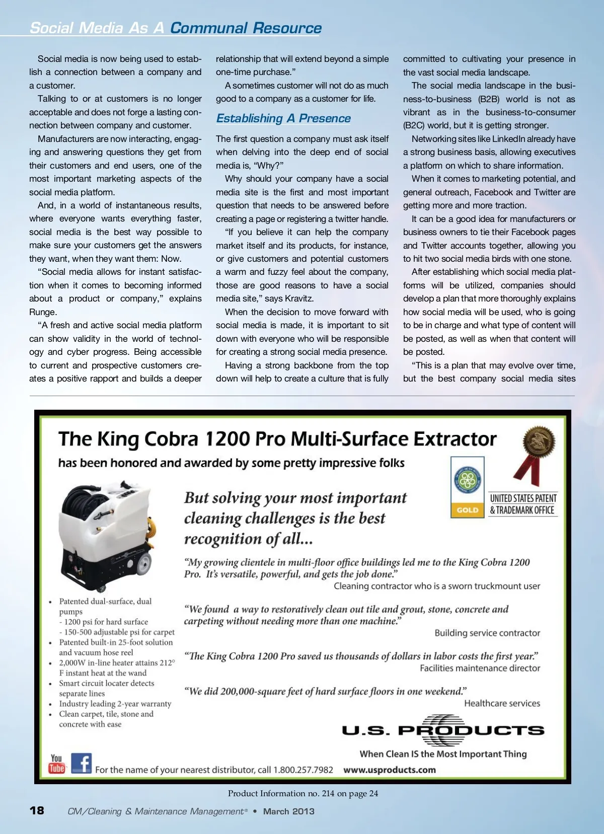 Social Media As A Communal Resource Social media is now being used to estab-lish a connection between a company and a customer. Talking to or at customers is no longer acceptable and does not forge a lasting con-nection between company and customer. Manufacturers are now interacting, engag-ing and answering questions they get from their customers and end users, one of the most important marketing aspects of the social media platform. And, in a world of instantaneous results, where everyone wants everything faster, social media is the best way possible to make sure your customers get the answers they want, when they want them: Now. “Social media allows for instant satisfac-tion when it comes to becoming informed about a product or company,” explains Runge. “A fresh and active social media platform can show validity in the world of technol-ogy and cyber progress. Being accessible to current and prospective customers cre-ates a positive rapport and builds a deeper relationship that will extend beyond a simple one-time purchase.” A sometimes customer will not do as much good to a company as a customer for life. committed to cultivating your presence in the vast social media landscape. The social media landscape in the busi-ness-to-business (B2B) world is not as vibrant as in the business-to-consumer (B2C) world, but it is getting stronger. Networking sites like LinkedIn already have a strong business basis, allowing executives a platform on which to share information. When it comes to marketing potential, and general outreach, Facebook and Twitter are getting more and more traction. It can be a good idea for manufacturers or business owners to tie their Facebook pages and Twitter accounts together, allowing you to hit two social media birds with one stone. After establishing which social media plat-forms will be utilized, companies should develop a plan that more thoroughly explains how social media will be used, who is going to be in charge and what type of content will be posted, as well as when that content will be posted. “This is a plan that may evolve over time, but the best company social media sites Establishing A Presence The first question a company must ask itself when delving into the deep end of social media is, “Why?” Why should your company have a social media site is the first and most important question that needs to be answered before creating a page or registering a twitter handle. “If you believe it can help the company market itself and its products, for instance, or give customers and potential customers a warm and fuzzy feel about the company, those are good reasons to have a social media site,” says Kravitz. When the decision to move forward with social media is made, it is important to sit down with everyone who will be responsible for creating a strong social media presence. Having a strong backbone from the top down will help to create a culture that is fully Product Information no. 214 on page 24 18 CM/Cleaning & Maintenance Management ® • March 2013