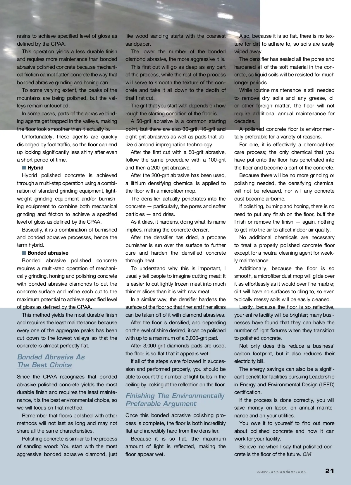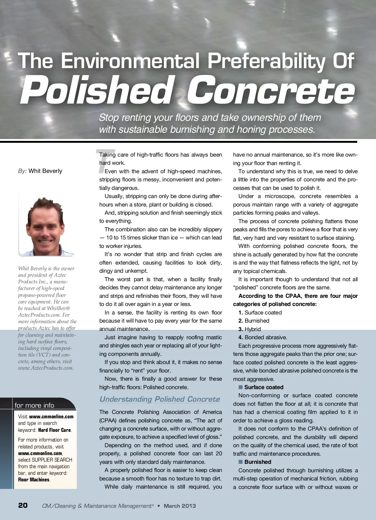 The Environmental Preferability Of Polished Concrete Stop renting your floors and take ownership of them with sustainable burnishing and honing processes. By: Whit Beverly T Whit Beverly is the owner and president of Aztec Products Inc., a manu-facturer of high-speed propane-powered floor care equipment. He can be reached at WhitBev@ AztecProducts.com. For more information about the products Aztec has to offer for cleaning and maintain-ing hard surface floors, including vinyl composi-tion tile (VCT) and con-crete, among others, visit www.AztecProducts.com. Taking care of high-traffic floors has always been hard work. Even with the advent of high-speed machines, stripping floors is messy, inconvenient and poten-tially dangerous. Usually, stripping can only be done during after-hours when a store, plant or building is closed. And, stripping solution and finish seemingly stick to everything. The combination also can be incredibly slippery — 10 to 15 times slicker than ice — which can lead to worker injuries. It’s no wonder that strip and finish cycles are often extended, causing facilities to look dirty, dingy and unkempt. The worst part is that, when a facility finally decides they cannot delay maintenance any longer and strips and refinishes their floors, they will have to do it all over again in a year or less. In a sense, the facility is renting its own floor because it will have to pay every year for the same annual maintenance. Just imagine having to reapply roofing mastic and shingles each year or replacing all of your light-ing components annually. If you stop and think about it, it makes no sense financially to “rent” your floor. Now, there is finally a good answer for these high-traffic floors: Polished concrete. for more info Visit www.cmmonline.com and type in search keyword: Hard Floor Care . For more information on related products, visit www.cmmonline.com , select SUPPLIER SEARCH from the main navigation bar, and enter keyword: Floor Machines . Understanding Polished Concrete The Concrete Polishing Association of America (CPAA) defines polishing concrete as, “The act of changing a concrete surface, with or without aggre-gate exposure, to achieve a specified level of gloss.” Depending on the method used, and if done properly, a polished concrete floor can last 20 years with only standard daily maintenance. A properly polished floor is easier to keep clean because a smooth floor has no texture to trap dirt. While daily maintenance is still required, you have no annual maintenance, so it’s more like own-ing your floor than renting it. To understand why this is true, we need to delve a little into the properties of concrete and the pro-cesses that can be used to polish it. Under a microscope, concrete resembles a porous maintain range with a variety of aggregate particles forming peaks and valleys. The process of concrete polishing flattens those peaks and fills the pores to achieve a floor that is very flat, very hard and very resistant to surface staining. With conforming polished concrete floors, the shine is actually generated by how flat the concrete is and the way that flatness reflects the light, not by any topical chemicals. It is important though to understand that not all “polished” concrete floors are the same. According to the CPAA, there are four major categories of polished concrete: 1. Surface coated 2. Burnished 3. Hybrid 4. Bonded abrasive. Each progressive process more aggressively flat-tens those aggregate peaks than the prior one; sur-face coated polished concrete is the least aggres-sive, while bonded abrasive polished concrete is the most aggressive. ■ Surface coated Non-conforming or surface coated concrete does not flatten the floor at all; it is concrete that has had a chemical coating film applied to it in order to achieve a gloss reading. It does not conform to the CPAA’s definition of polished concrete, and the durability will depend on the quality of the chemical used, the rate of foot traffic and maintenance procedures. ■ Burnished Concrete polished through burnishing utilizes a multi-step operation of mechanical friction, rubbing a concrete floor surface with or without waxes or 20 CM/Cleaning & Maintenance Management ® • March 2013
