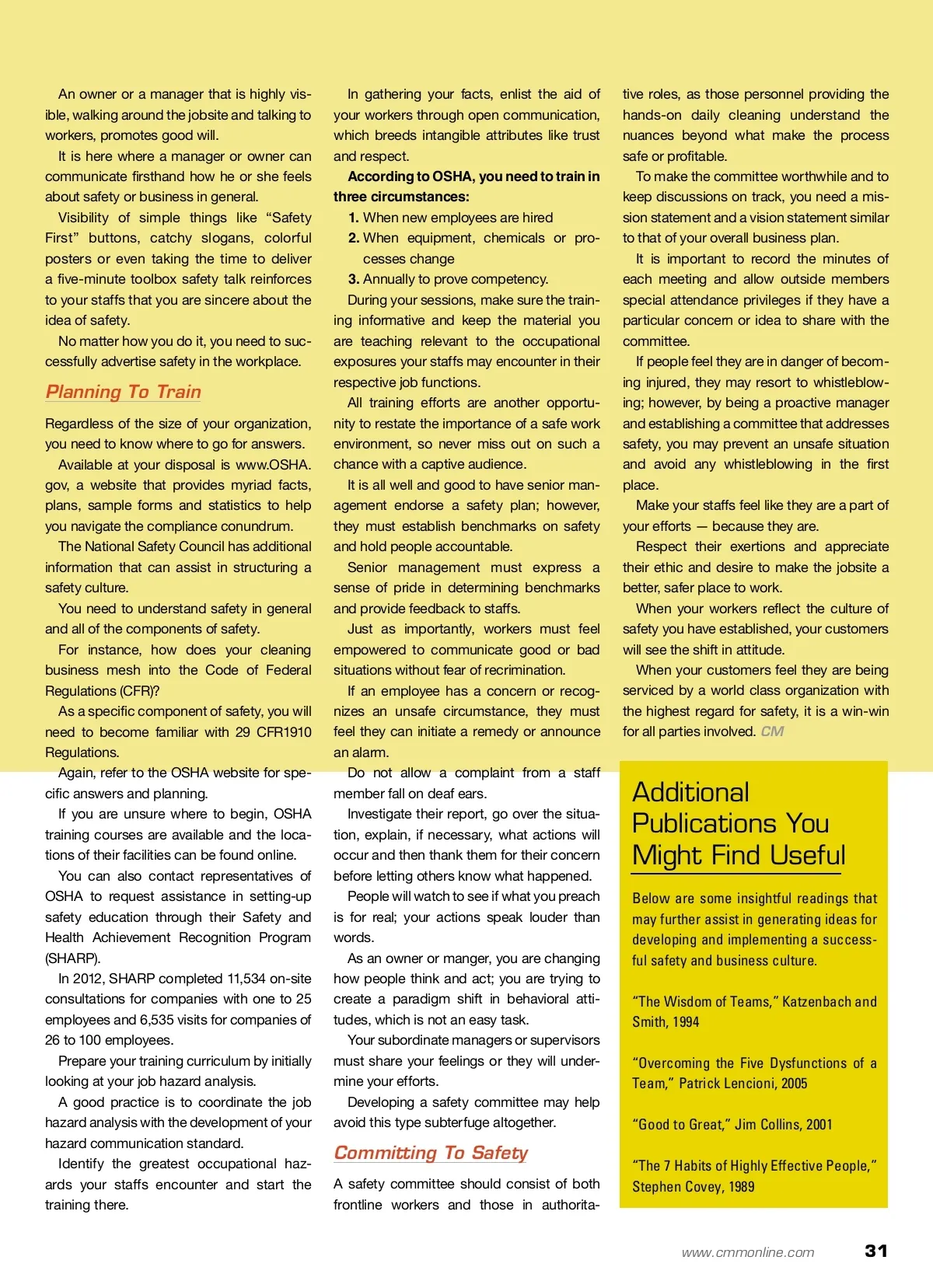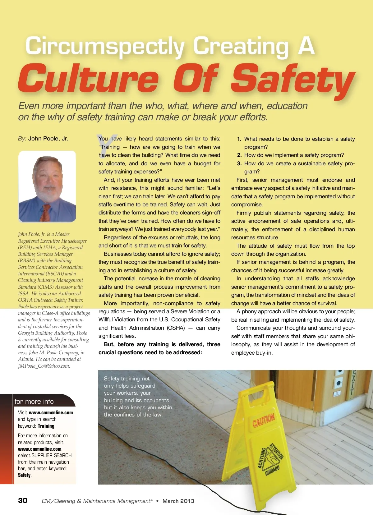 Circumspectly Creating A Culture Of Safety Even more important than the who, what, where and when, education on the why of safety training can make or break your efforts. By: John Poole, Jr. Y John Poole, Jr. is a Master Registered Executive Housekeeper (REH) with IEHA, a Registered Building Services Manager (RBSM) with the Building Services Contractor Association International (BSCAI) and a Cleaning Industry Management Standard (CIMS) Assessor with ISSA. He is also an Authorized OSHA Outreach Safety Trainer. Poole has experience as a project manager in Class-A office buildings and is the former the superinten-dent of custodial services for the Georgia Building Authority. Poole is currently available for consulting and training through his busi-ness, John M. Poole Company, in Atlanta. He can be contacted at [email protected]. You have likely heard statements similar to this: “Training — how are we going to train when we have to clean the building? What time do we need to allocate, and do we even have a budget for safety training expenses?” And, if your training efforts have ever been met with resistance, this might sound familiar: “Let’s clean first; we can train later. We can’t afford to pay staffs overtime to be trained. Safety can wait. Just distribute the forms and have the cleaners sign-off that they’ve been trained. How often do we have to train anyways? We just trained everybody last year.” Regardless of the excuses or rebuttals, the long and short of it is that we must train for safety. Businesses today cannot afford to ignore safety; they must recognize the true benefit of safety train-ing and in establishing a culture of safety. The potential increase in the morale of cleaning staffs and the overall process improvement from safety training has been proven beneficial. More importantly, non-compliance to safety regulations — being served a Severe Violation or a Willful Violation from the U.S. Occupational Safety and Health Administration (OSHA) — can carry significant fees. But, before any training is delivered, three crucial questions need to be addressed: 1. What needs to be done to establish a safety program? 2. How do we implement a safety program? 3. How do we create a sustainable safety pro-gram? First, senior management must endorse and embrace every aspect of a safety initiative and man-date that a safety program be implemented without compromise. Firmly publish statements regarding safety, the active endorsement of safe operations and, ulti-mately, the enforcement of a disciplined human resources structure. The attitude of safety must flow from the top down through the organization. If senior management is behind a program, the chances of it being successful increase greatly. In understanding that all staffs acknowledge senior management’s commitment to a safety pro-gram, the transformation of mindset and the ideas of change will have a better chance of survival. A phony approach will be obvious to your people; be real in selling and implementing the idea of safety. Communicate your thoughts and surround your-self with staff members that share your same phi-losophy, as they will assist in the development of employee buy-in. for more info Visit www.cmmonline.com and type in search keyword: Training . For more information on related products, visit www.cmmonline.com , select SUPPLIER SEARCH from the main navigation bar, and enter keyword: Safety . Safety training not only helps safeguard your workers, your building and its occupants, but it also keeps you within the confines of the law. 30 CM/Cleaning & Maintenance Management ® • March 2013