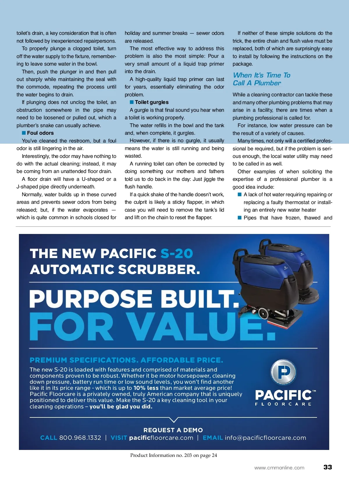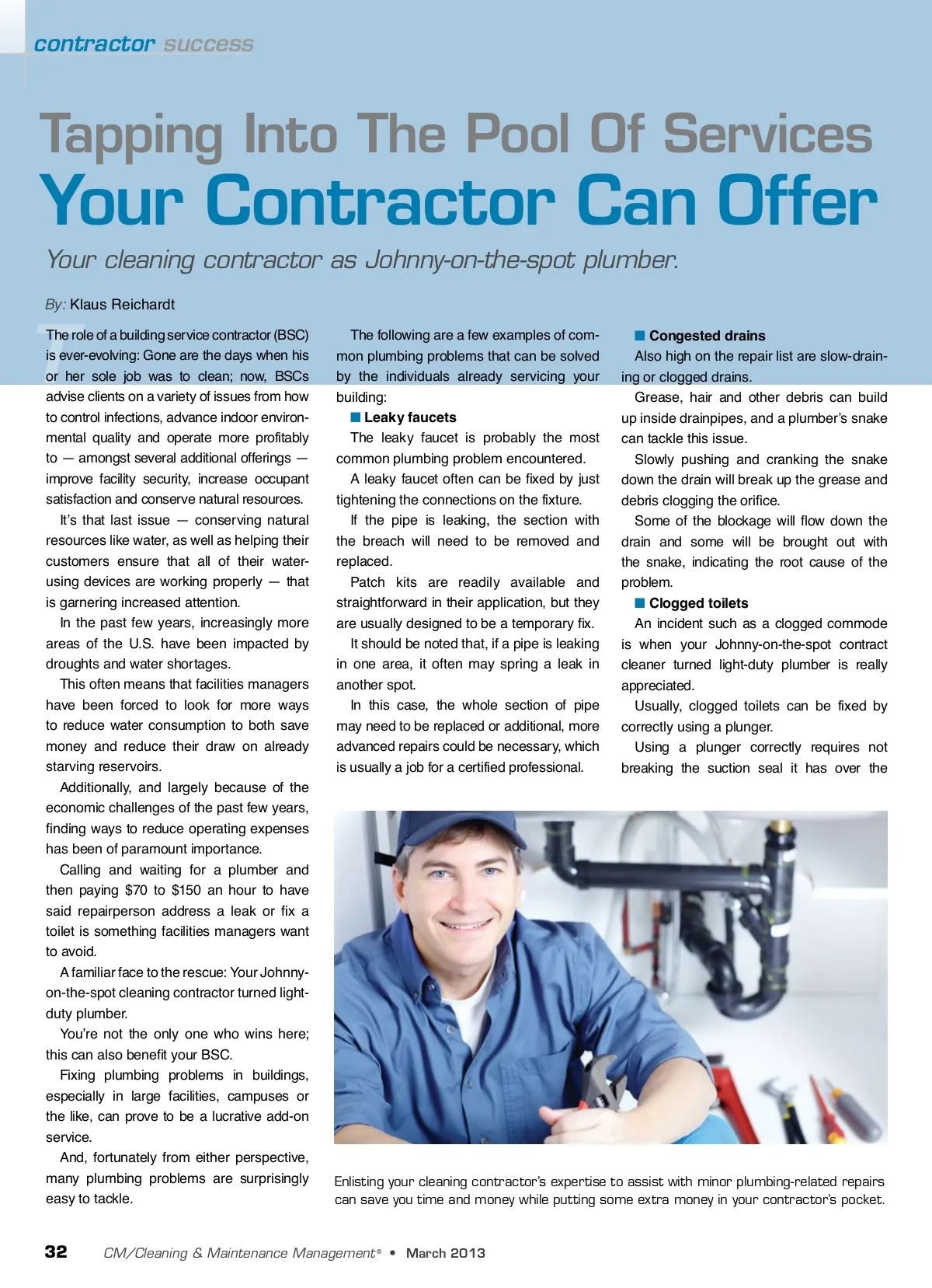 contractor success Tapping Into The Pool Of Services Your Contractor Can Offer Your cleaning contractor as Johnny-on-the-spot plumber. By: Klaus Reichardt T The role of a building service contractor (BSC) is ever-evolving: Gone are the days when his or her sole job was to clean; now, BSCs advise clients on a variety of issues from how to control infections, advance indoor environ-mental quality and operate more profitably to — amongst several additional offerings — improve facility security, increase occupant satisfaction and conserve natural resources. It’s that last issue — conserving natural resources like water, as well as helping their customers ensure that all of their water-using devices are working properly — that is garnering increased attention. In the past few years, increasingly more areas of the U.S. have been impacted by droughts and water shortages. This often means that facilities managers have been forced to look for more ways to reduce water consumption to both save money and reduce their draw on already starving reservoirs. Additionally, and largely because of the economic challenges of the past few years, finding ways to reduce operating expenses has been of paramount importance. Calling and waiting for a plumber and then paying $70 to $150 an hour to have said repairperson address a leak or fix a toilet is something facilities managers want to avoid. A familiar face to the rescue: Your Johnny-on-the-spot cleaning contractor turned light-duty plumber. You’re not the only one who wins here; this can also benefit your BSC. Fixing plumbing problems in buildings, especially in large facilities, campuses or the like, can prove to be a lucrative add-on service. And, fortunately from either perspective, many plumbing problems are surprisingly easy to tackle. The following are a few examples of com-mon plumbing problems that can be solved by the individuals already servicing your building: ■ Leaky faucets The leaky faucet is probably the most common plumbing problem encountered. A leaky faucet often can be fixed by just tightening the connections on the fixture. If the pipe is leaking, the section with the breach will need to be removed and replaced. Patch kits are readily available and straightforward in their application, but they are usually designed to be a temporary fix. It should be noted that, if a pipe is leaking in one area, it often may spring a leak in another spot. In this case, the whole section of pipe may need to be replaced or additional, more advanced repairs could be necessary, which is usually a job for a certified professional. ■ Congested drains Also high on the repair list are slow-drain-ing or clogged drains. Grease, hair and other debris can build up inside drainpipes, and a plumber’s snake can tackle this issue. Slowly pushing and cranking the snake down the drain will break up the grease and debris clogging the orifice. Some of the blockage will flow down the drain and some will be brought out with the snake, indicating the root cause of the problem. ■ Clogged toilets An incident such as a clogged commode is when your Johnny-on-the-spot contract cleaner turned light-duty plumber is really appreciated. Usually, clogged toilets can be fixed by correctly using a plunger. Using a plunger correctly requires not breaking the suction seal it has over the Enlisting your cleaning contractor’s expertise to assist with minor plumbing-related repairs can save you time and money while putting some extra money in your contractor’s pocket. 32 CM/Cleaning & Maintenance Management ® • March 2013