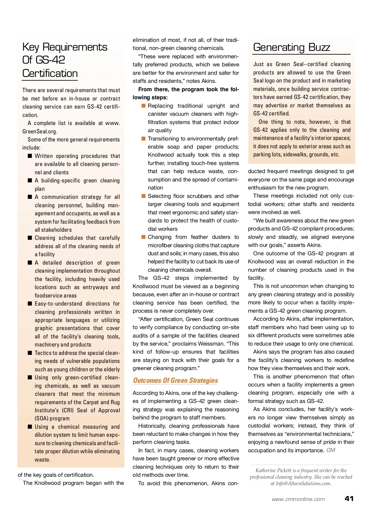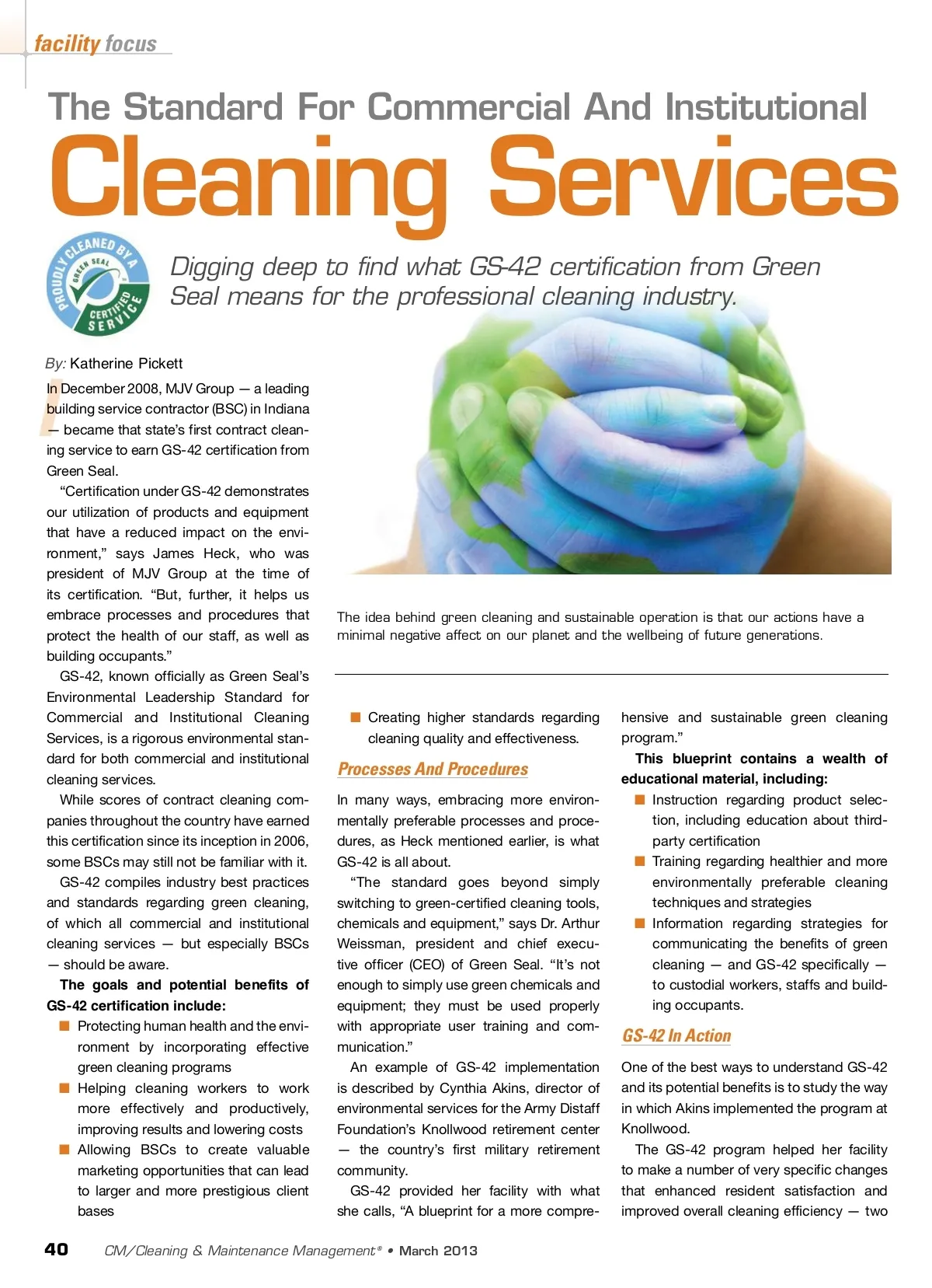 facility focus The Standard For Commercial And Institutional Cleaning Services Digging deep to find what GS-42 certification from Green Seal means for the professional cleaning industry. By: Katherine Pickett I In December 2008, MJV Group — a leading building service contractor (BSC) in Indiana — became that state’s first contract clean-ing service to earn GS-42 certification from Green Seal. “Certification under GS-42 demonstrates our utilization of products and equipment that have a reduced impact on the envi-ronment,” says James Heck, who was president of MJV Group at the time of its certification. “But, further, it helps us embrace processes and procedures that protect the health of our staff, as well as building occupants.” GS-42, known officially as Green Seal’s Environmental Leadership Standard for Commercial and Institutional Cleaning Services, is a rigorous environmental stan-dard for both commercial and institutional cleaning services. While scores of contract cleaning com-panies throughout the country have earned this certification since its inception in 2006, some BSCs may still not be familiar with it. GS-42 compiles industry best practices and standards regarding green cleaning, of which all commercial and institutional cleaning services — but especially BSCs — should be aware. The goals and potential benefits of GS-42 certification include: ■ Protecting human health and the envi-ronment by incorporating effective green cleaning programs ■ Helping cleaning workers to work more effectively and productively, improving results and lowering costs ■ Allowing BSCs to create valuable marketing opportunities that can lead to larger and more prestigious client bases The idea behind green cleaning and sustainable operation is that our actions have a minimal negative affect on our planet and the wellbeing of future generations. ■ Creating higher standards regarding cleaning quality and effectiveness. Processes And Procedures In many ways, embracing more environ-mentally preferable processes and proce-dures, as Heck mentioned earlier, is what GS-42 is all about. “The standard goes beyond simply switching to green-certified cleaning tools, chemicals and equipment,” says Dr. Arthur Weissman, president and chief execu-tive officer (CEO) of Green Seal. “It’s not enough to simply use green chemicals and equipment; they must be used properly with appropriate user training and com-munication.” An example of GS-42 implementation is described by Cynthia Akins, director of environmental services for the Army Distaff Foundation’s Knollwood retirement center — the country’s first military retirement community. GS-42 provided her facility with what she calls, “A blueprint for a more compre-hensive and sustainable green cleaning program.” This blueprint contains a wealth of educational material, including: ■ Instruction regarding product selec-tion, including education about third-party certification ■ Training regarding healthier and more environmentally preferable cleaning techniques and strategies ■ Information regarding strategies for communicating the benefits of green cleaning — and GS-42 specifically — to custodial workers, staffs and build-ing occupants. GS-42 In Action One of the best ways to understand GS-42 and its potential benefits is to study the way in which Akins implemented the program at Knollwood. The GS-42 program helped her facility to make a number of very specific changes that enhanced resident satisfaction and improved overall cleaning efficiency — two 40 CM/Cleaning & Maintenance Management ® • March 2013