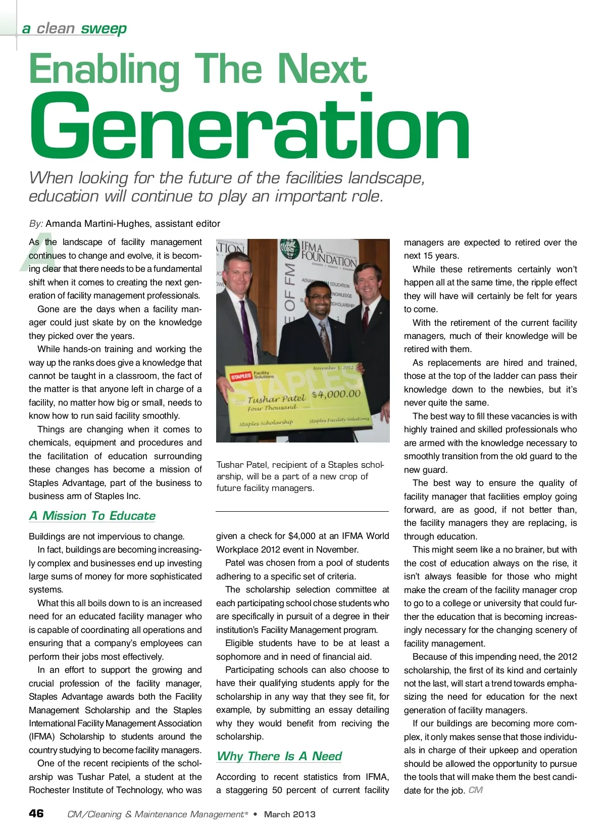 a clean sweep Enabling The Next When looking for the future of the facilities landscape, education will continue to play an important role. By: Amanda Martini-Hughes, assistant editor Generation As the landscape of facility management continues to change and evolve, it is becom-ing clear that there needs to be a fundamental shift when it comes to creating the next gen-eration of facility management professionals. Gone are the days when a facility man-ager could just skate by on the knowledge they picked over the years. While hands-on training and working the way up the ranks does give a knowledge that cannot be taught in a classroom, the fact of the matter is that anyone left in charge of a facility, no matter how big or small, needs to know how to run said facility smoothly. Things are changing when it comes to chemicals, equipment and procedures and the facilitation of education surrounding these changes has become a mission of Staples Advantage, part of the business to business arm of Staples Inc. managers are expected to retired over the next 15 years. While these retirements certainly won’t happen all at the same time, the ripple effect they will have will certainly be felt for years to come. With the retirement of the current facility managers, much of their knowledge will be retired with them. As replacements are hired and trained, those at the top of the ladder can pass their knowledge down to the newbies, but it’s never quite the same. The best way to fill these vacancies is with highly trained and skilled professionals who are armed with the knowledge necessary to smoothly transition from the old guard to the new guard. The best way to ensure the quality of facility manager that facilities employ going forward, are as good, if not better than, the facility managers they are replacing, is through education. This might seem like a no brainer, but with the cost of education always on the rise, it isn’t always feasible for those who might make the cream of the facility manager crop to go to a college or university that could fur-ther the education that is becoming increas-ingly necessary for the changing scenery of facility management. Because of this impending need, the 2012 scholarship, the first of its kind and certainly not the last, will start a trend towards empha-sizing the need for education for the next generation of facility managers. If our buildings are becoming more com-plex, it only makes sense that those individu-als in charge of their upkeep and operation should be allowed the opportunity to pursue the tools that will make them the best candi-date for the job. CM A Tushar Patel, recipient of a Staples schol-arship, will be a part of a new crop of future facility managers. A Mission To Educate Buildings are not impervious to change. In fact, buildings are becoming increasing-ly complex and businesses end up investing large sums of money for more sophisticated systems. What this all boils down to is an increased need for an educated facility manager who is capable of coordinating all operations and ensuring that a company’s employees can perform their jobs most effectively. In an effort to support the growing and crucial profession of the facility manager, Staples Advantage awards both the Facility Management Scholarship and the Staples International Facility Management Association (IFMA) Scholarship to students around the country studying to become facility managers. One of the recent recipients of the schol-arship was Tushar Patel, a student at the Rochester Institute of Technology, who was given a check for $4,000 at an IFMA World Workplace 2012 event in November. Patel was chosen from a pool of students adhering to a specific set of criteria. The scholarship selection committee at each participating school chose students who are specifically in pursuit of a degree in their institution’s Facility Management program. Eligible students have to be at least a sophomore and in need of financial aid. Participating schools can also choose to have their qualifying students apply for the scholarship in any way that they see fit, for example, by submitting an essay detailing why they would benefit from reciving the scholarship. Why There Is A Need According to recent statistics from IFMA, a staggering 50 percent of current facility 46 CM/Cleaning & Maintenance Management ® • March 2013