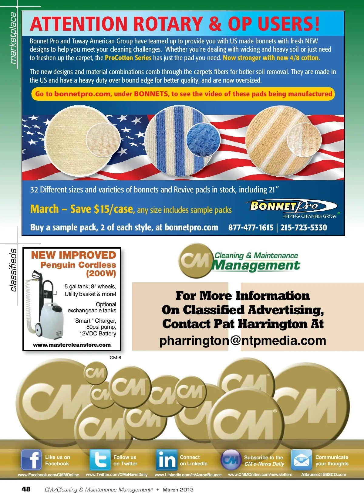 marketplace AM ATTENTION ROTARY & OP USERS! Bonnet Pro and Tuway American Group have teamed up to provide you with US made bonnets with fresh NEW designs to help you meet your cleaning challenges. Whether you’re dealing with wicking and heavy soil or just need to freshen up the carpet, the ProCotton Series has just the pad you need. Now stronger with new 4/8 cotton. The new designs and material combinations comb through the carpets fi bers for better soil removal. They are made in the US and have a heavy duty over bound edge for better quality, and are now oversized. Go to bonnetpro.com , under BONNETS , to see the video of these pads being manufactured Page 1 32 Different sizes and varieties of bonnets and Revive pads in stock, including 21” March – Save $15/case , any size includes sample packs Buy a sample pack, 2 of each style, at bonnetpro.com classifieds 877-477-1615 | 215-723-5330 NEW IMPROVED Penguin Cordless (200W) 5 gal tank, 8" wheels, Utility basket & more! Optional exchangeable tanks "Smart " Charger, 80psi pump, 12VDC Battery www.mastercleanstore.com0 CM-8 For More Information On Classified Advertising, Contact Pat Harrington At [email protected] Like us on Facebook www.Facebook.com/CMMOnline Follow us on Twitter www.Twitter.com/CMeNewsDaily Connect on LinkedIn www.LinkedIn.com/in/AaronBaunee Subscribe to the CM e-News Daily www.CMMOnline.com/newsletters Communicate your thoughts [email protected] 48 CM/Cleaning & Maintenance Management ® • March 2013