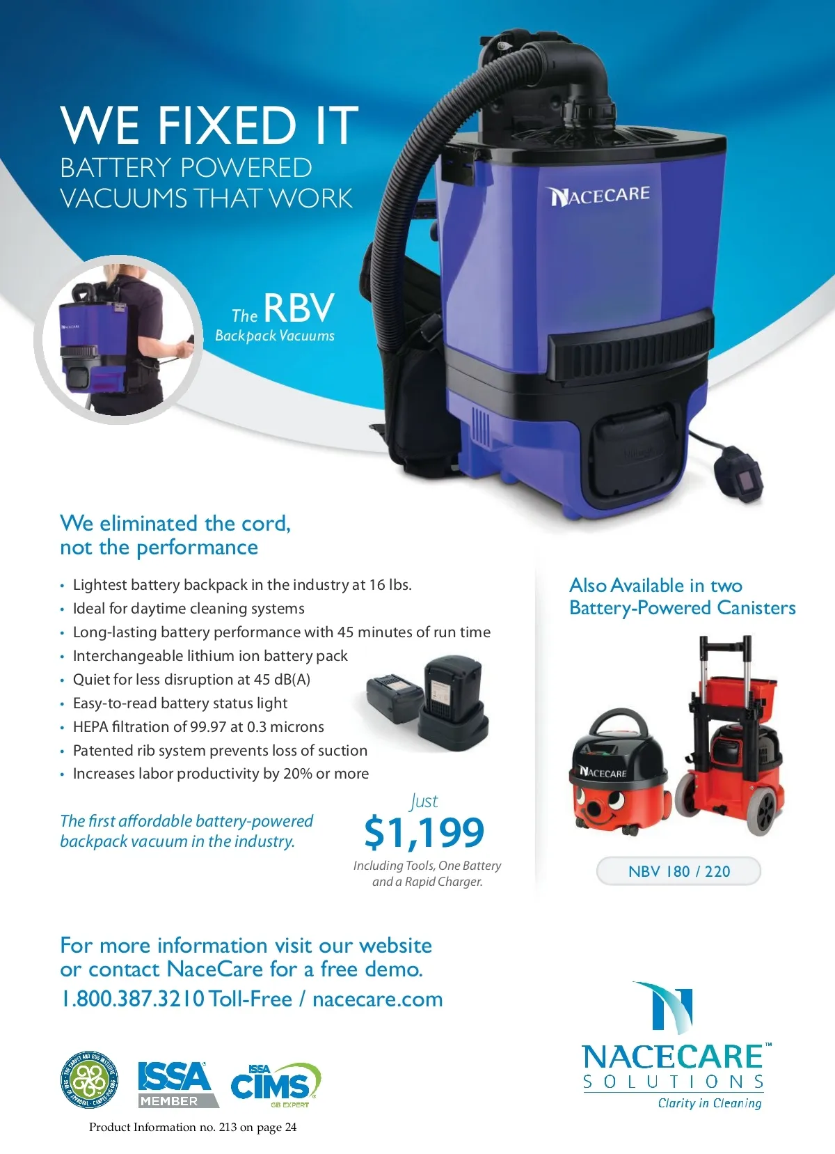 ;)*-<)(-8 &%88)6=43;)6)( :%'99178,%8;36/ 8LI  &EGOTEGO:EGYYQW 6&: ;IIPMQMREXIHXLIGSVH  RSXXLITIVJSVQERGI • • • • • • • • • Lightest battery backpack in the industry at 16 lbs. Ideal for daytime cleaning systems Long-lasting battery performance with 45 minutes of run time Interchangeable lithium ion battery pack Quiet for less disruption at 45 dB(A) Easy-to-read battery status light HEPA fltration of 99.97 at 0.3 microns Patented rib system prevents loss of suction Increases labor productivity by 20% or more %PWS%ZEMPEFPIMRX[S  &EXXIV]4S[IVIH'ERMWXIVW The frst afordable battery-powered backpack vacuum in the industry. .YWX $1,199 Including Tools, One Battery and a Rapid Charger. 2&:c;  *SVQSVIMRJSVQEXMSRZMWMXSYV[IFWMXI SVGSRXEGX2EGI'EVIJSVEJVIIHIQS c;c;b;8SPP*VII REGIGEVIGSQ Product Information no. 213 on page 24