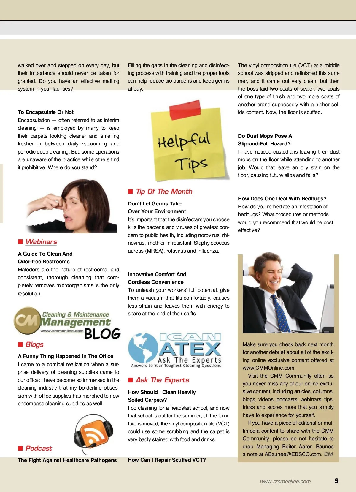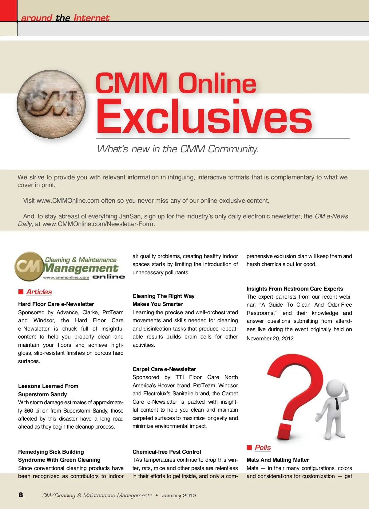 around the Internet CMM Online Exclusives What’s new in the CMM Community. We strive to provide you with relevant information in intriguing, interactive formats that is complementary to what we cover in print. Visit www.CMMOnline.com often so you never miss any of our online exclusive content. And, to stay abreast of everything JanSan, sign up for the industry’s only daily electronic newsletter, the CM e-News Daily , at www.CMMOnline.com/Newsletter-Form. air quality problems, creating healthy indoor spaces starts by limiting the introduction of unnecessary pollutants. prehensive exclusion plan will keep them and harsh chemicals out for good. ■ Articles Hard Floor Care e-Newsletter Sponsored by Advance, Clarke, ProTeam and Windsor, the Hard Floor Care e-Newsletter is chuck full of insightful content to help you properly clean and maintain your floors and achieve high-gloss, slip-resistant finishes on porous hard surfaces. Cleaning The Right Way Makes You Smarter Learning the precise and well-orchestrated movements and skills needed for cleaning and disinfection tasks that produce repeat-able results builds brain cells for other activities. Insights From Restroom Care Experts The expert panelists from our recent webi-nar, “A Guide To Clean And Odor-Free Restrooms,” lend their knowledge and answer questions submitting from attend-ees live during the event originally held on November 20, 2012. Lessons Learned From Superstorm Sandy With storm damage estimates of approximate-ly $60 billion from Superstorm Sandy, those affected by this disaster have a long road ahead as they begin the cleanup process. Carpet Care e-Newsletter Sponsored by TTI Floor Care North America’s Hoover brand, ProTeam, Windsor and Electrolux’s Sanitaire brand, the Carpet Care e-Newsletter is packed with insight-ful content to help you clean and maintain carpeted surfaces to maximize longevity and minimize environmental impact. Remedying Sick Building Syndrome With Green Cleaning Since conventional cleaning products have been recognized as contributors to indoor Chemical-free Pest Control TAs temperatures continue to drop this win-ter, rats, mice and other pests are relentless in their efforts to get inside, and only a com-■ Polls Mats And Matting Matter Mats — in their many configurations, colors and considerations for customization — get 8 CM/Cleaning & Maintenance Management ® • January 2013