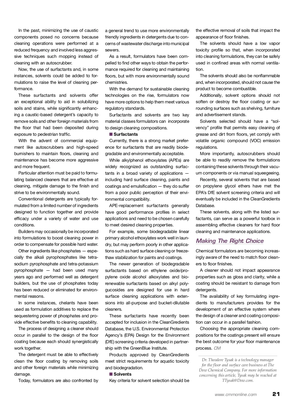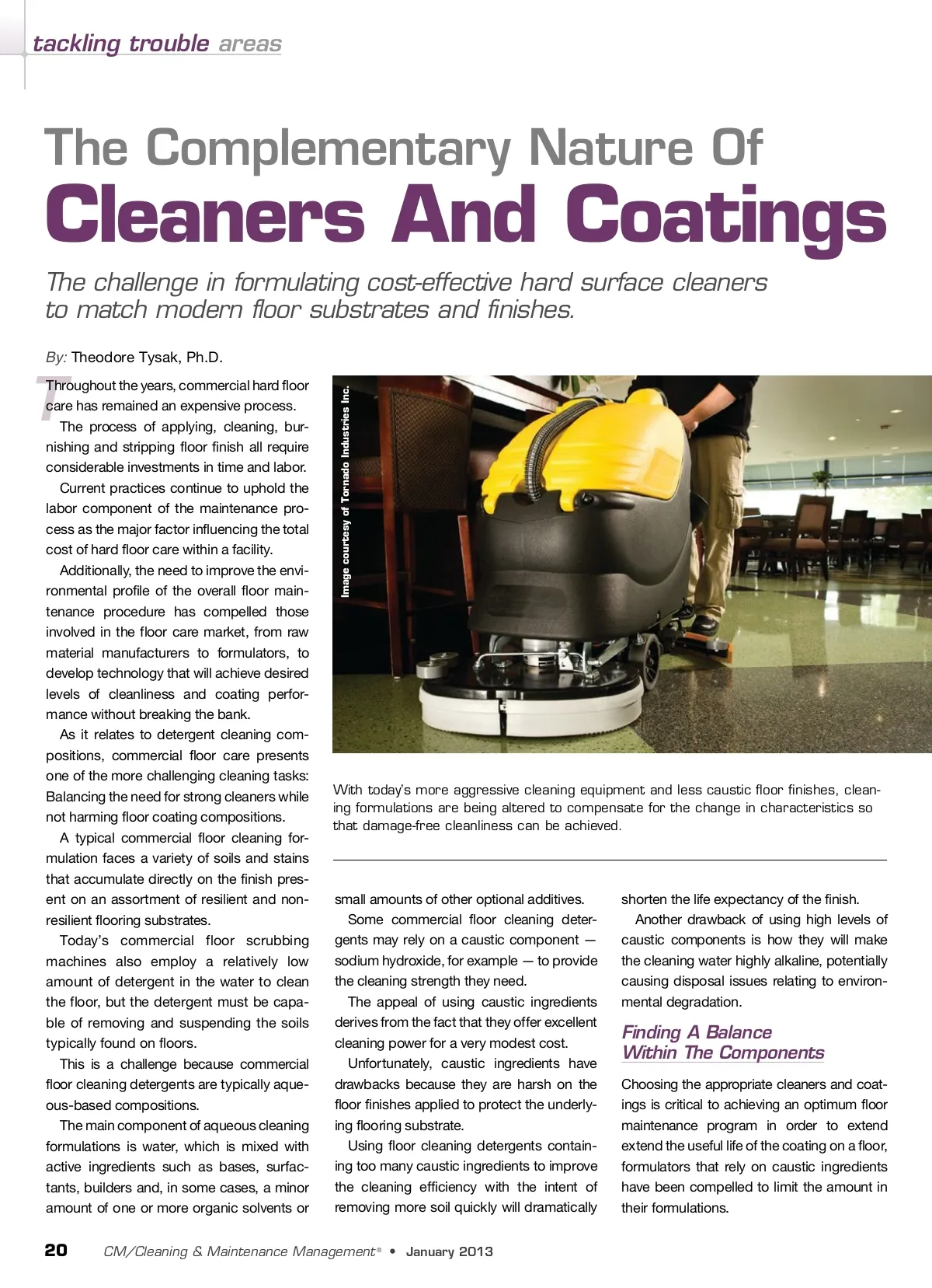 tackling trouble areas The Complementary Nature Of Cleaners And Coatings The challenge in formulating cost-effective hard surface cleaners to match modern floor substrates and finishes. By: Theodore Tysak, Ph.D. Image courtesy of Tornado Industries Inc. T Throughout the years, commercial hard floor care has remained an expensive process. The process of applying, cleaning, bur-nishing and stripping floor finish all require considerable investments in time and labor. Current practices continue to uphold the labor component of the maintenance pro-cess as the major factor influencing the total cost of hard floor care within a facility. Additionally, the need to improve the envi-ronmental profile of the overall floor main-tenance procedure has compelled those involved in the floor care market, from raw material manufacturers to formulators, to develop technology that will achieve desired levels of cleanliness and coating perfor-mance without breaking the bank. As it relates to detergent cleaning com-positions, commercial floor care presents one of the more challenging cleaning tasks: Balancing the need for strong cleaners while not harming floor coating compositions. A typical commercial floor cleaning for-mulation faces a variety of soils and stains that accumulate directly on the finish pres-ent on an assortment of resilient and non-resilient flooring substrates. Today’s commercial floor scrubbing machines also employ a relatively low amount of detergent in the water to clean the floor, but the detergent must be capa-ble of removing and suspending the soils typically found on floors. This is a challenge because commercial floor cleaning detergents are typically aque-ous-based compositions. The main component of aqueous cleaning formulations is water, which is mixed with active ingredients such as bases, surfac-tants, builders and, in some cases, a minor amount of one or more organic solvents or With today’s more aggressive cleaning equipment and less caustic floor finishes, clean-ing formulations are being altered to compensate for the change in characteristics so that damage-free cleanliness can be achieved. small amounts of other optional additives. Some commercial floor cleaning deter-gents may rely on a caustic component — sodium hydroxide, for example — to provide the cleaning strength they need. The appeal of using caustic ingredients derives from the fact that they offer excellent cleaning power for a very modest cost. Unfortunately, caustic ingredients have drawbacks because they are harsh on the floor finishes applied to protect the underly-ing flooring substrate. Using floor cleaning detergents contain-ing too many caustic ingredients to improve the cleaning efficiency with the intent of removing more soil quickly will dramatically shorten the life expectancy of the finish. Another drawback of using high levels of caustic components is how they will make the cleaning water highly alkaline, potentially causing disposal issues relating to environ-mental degradation. Finding A Balance Within The Components Choosing the appropriate cleaners and coat-ings is critical to achieving an optimum floor maintenance program in order to extend extend the useful life of the coating on a floor, formulators that rely on caustic ingredients have been compelled to limit the amount in their formulations. 20 CM/Cleaning & Maintenance Management ® • January 2013