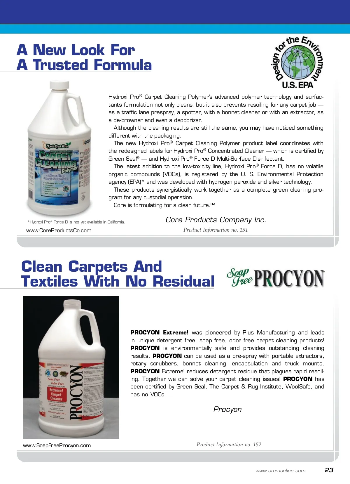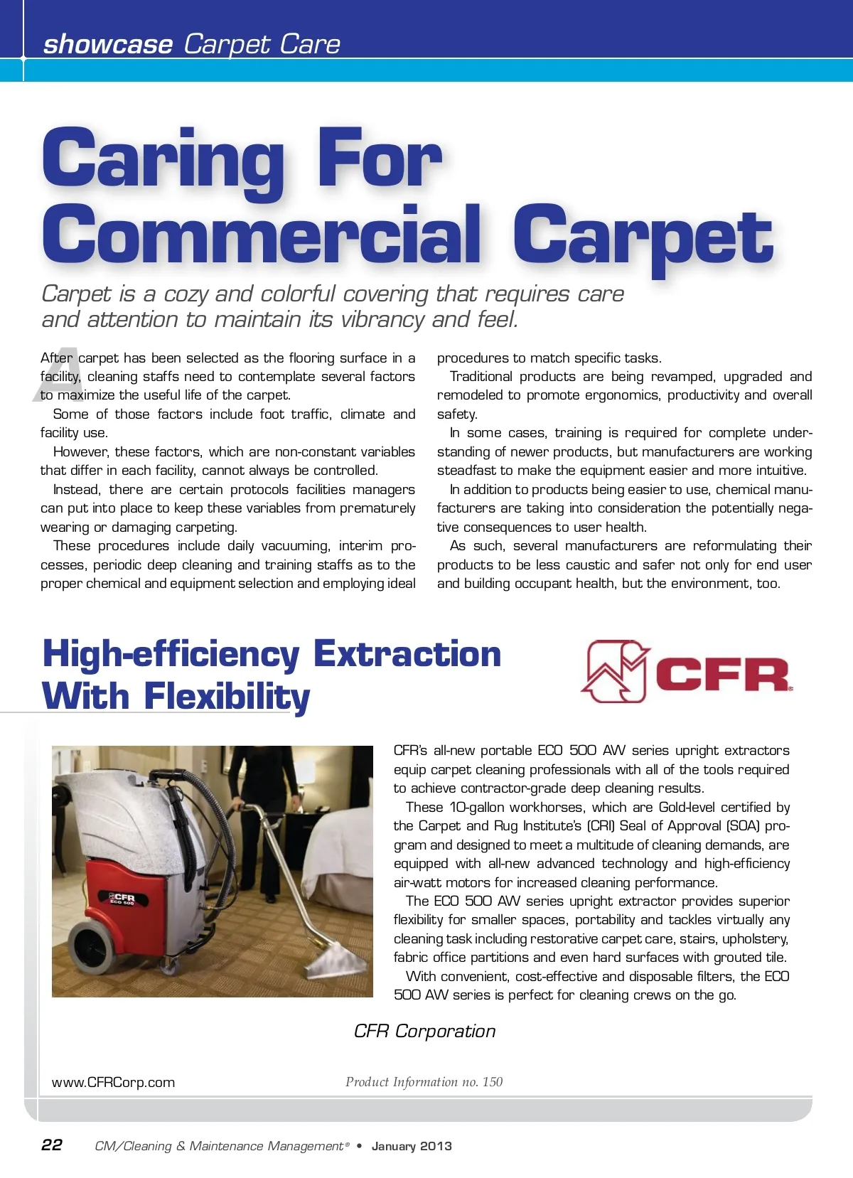 showcase Carpet Care Caring For Commercial Carpet Carpet is a cozy and colorful covering that requires care and attention to maintain its vibrancy and feel. A After carpet has been selected as the flooring surface in a facility, cleaning staffs need to contemplate several factors to maximize the useful life of the carpet. Some of those factors include foot traffic, climate and facility use. However, these factors, which are non-constant variables that differ in each facility, cannot always be controlled. Instead, there are certain protocols facilities managers can put into place to keep these variables from prematurely wearing or damaging carpeting. These procedures include daily vacuuming, interim pro-cesses, periodic deep cleaning and training staffs as to the proper chemical and equipment selection and employing ideal procedures to match specific tasks. Traditional products are being revamped, upgraded and remodeled to promote ergonomics, productivity and overall safety. In some cases, training is required for complete under-standing of newer products, but manufacturers are working steadfast to make the equipment easier and more intuitive. In addition to products being easier to use, chemical manu-facturers are taking into consideration the potentially nega-tive consequences to user health. As such, several manufacturers are reformulating their products to be less caustic and safer not only for end user and building occupant health, but the environment, too. High-efficiency Extraction With Flexibility CFR’s all-new portable ECO 500 AW series upright extractors equip carpet cleaning professionals with all of the tools required to achieve contractor-grade deep cleaning results. These 10-gallon workhorses, which are Gold-level certified by the Carpet and Rug Institute’s (CRI) Seal of Approval (SOA) pro-gram and designed to meet a multitude of cleaning demands, are equipped with all-new advanced technology and high-efficiency air-watt motors for increased cleaning performance. The ECO 500 AW series upright extractor provides superior flexibility for smaller spaces, portability and tackles virtually any cleaning task including restorative carpet care, stairs, upholstery, fabric office partitions and even hard surfaces with grouted tile. With convenient, cost-effective and disposable filters, the ECO 500 AW series is perfect for cleaning crews on the go. CFR Corporation www.CFRCorp.com Product Information no. 150 22 CM/Cleaning & Maintenance Management ® • January2013
