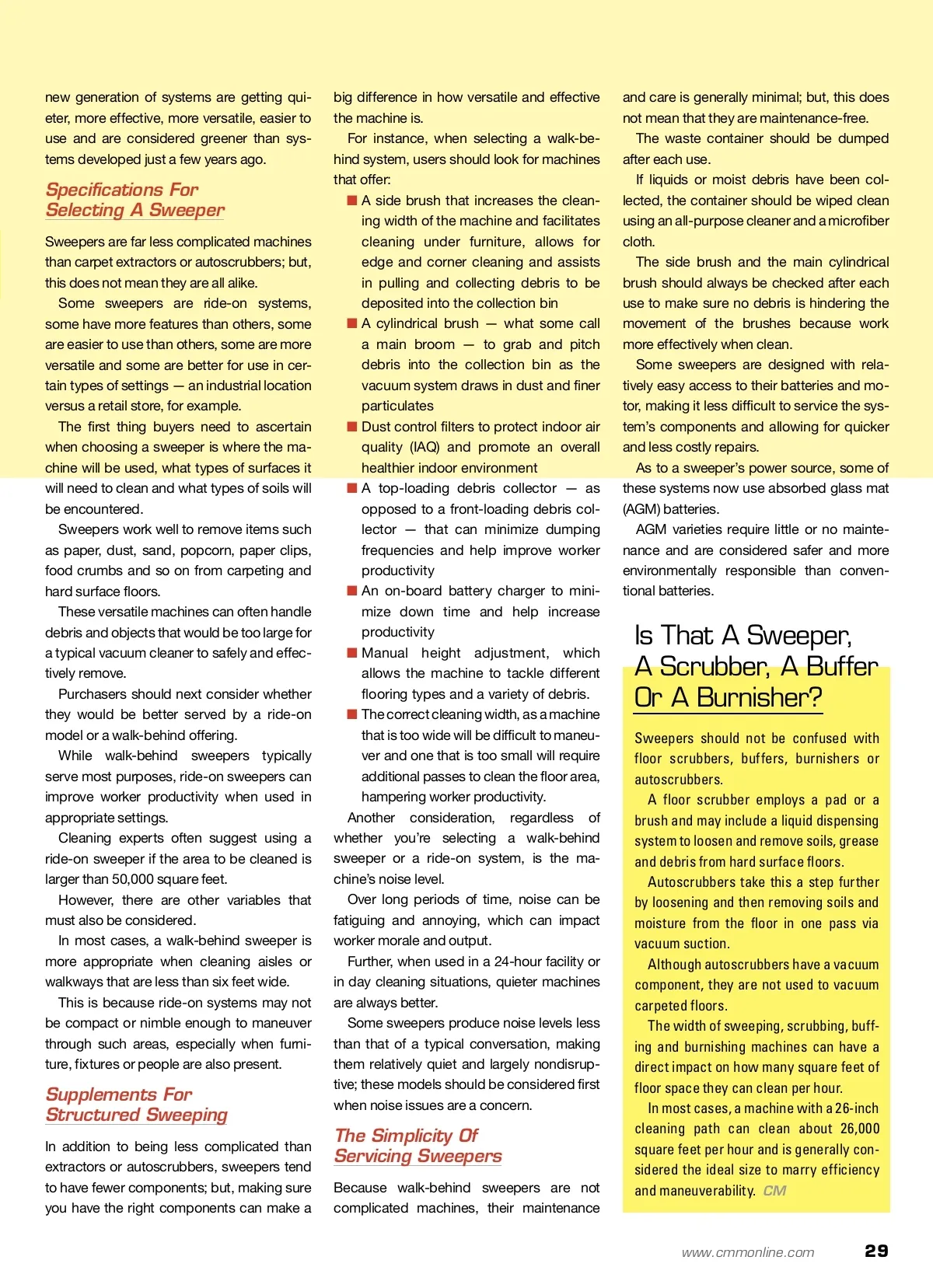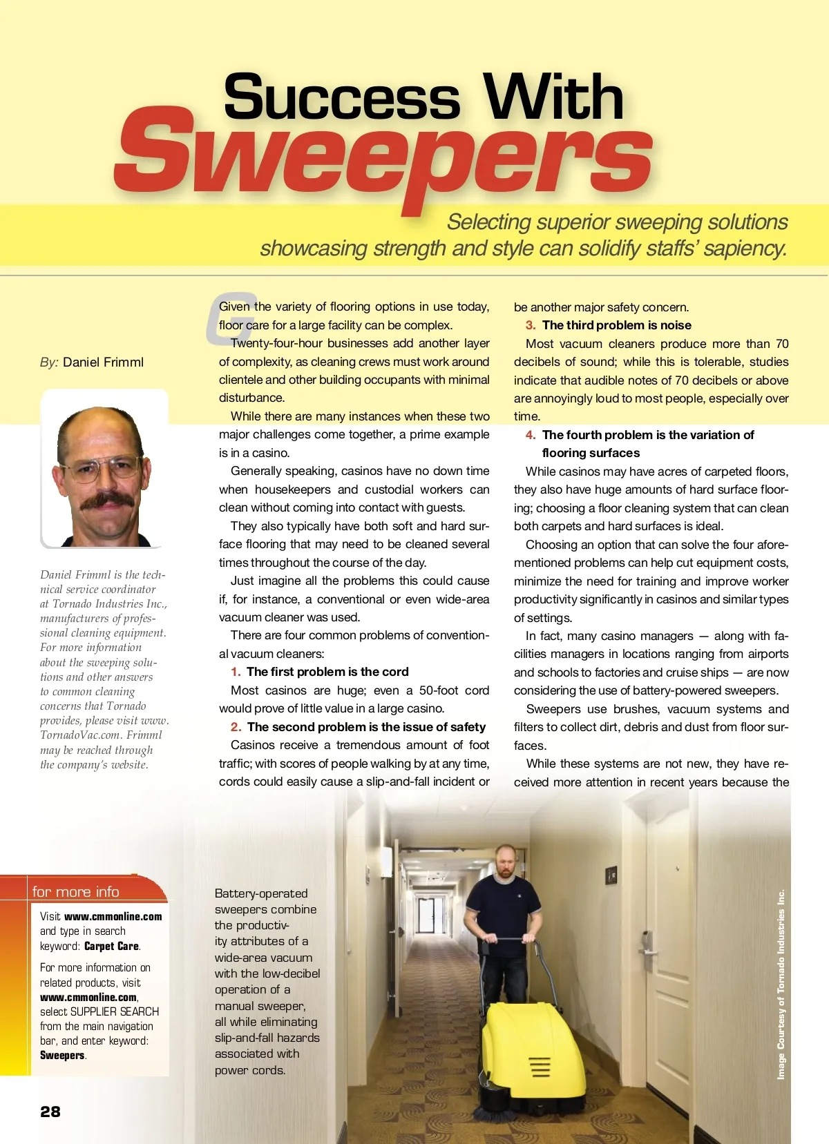 Sweepers Selecting superior sweeping solutions showcasing strength and style can solidify staffs’ sapiency. Success With G By: Daniel Frimml Daniel Frimml is the tech-nical service coordinator at Tornado Industries Inc., manufacturers of profes-sional cleaning equipment. For more information about the sweeping solu-tions and other answers to common cleaning concerns that Tornado provides, please visit www. TornadoVac.com. Frimml may be reached through the company’s website. Given the variety of flooring options in use today, floor care for a large facility can be complex. Twenty-four-hour businesses add another layer of complexity, as cleaning crews must work around clientele and other building occupants with minimal disturbance. While there are many instances when these two major challenges come together, a prime example is in a casino. Generally speaking, casinos have no down time when housekeepers and custodial workers can clean without coming into contact with guests. They also typically have both soft and hard sur-face flooring that may need to be cleaned several times throughout the course of the day. Just imagine all the problems this could cause if, for instance, a conventional or even wide-area vacuum cleaner was used. There are four common problems of convention-al vacuum cleaners: 1. The first problem is the cord Most casinos are huge; even a 50-foot cord would prove of little value in a large casino. 2. The second problem is the issue of safety Casinos receive a tremendous amount of foot traffic; with scores of people walking by at any time, cords could easily cause a slip-and-fall incident or be another major safety concern. 3. The third problem is noise Most vacuum cleaners produce more than 70 decibels of sound; while this is tolerable, studies indicate that audible notes of 70 decibels or above are annoyingly loud to most people, especially over time. 4. The fourth problem is the variation of flooring surfaces While casinos may have acres of carpeted floors, they also have huge amounts of hard surface floor-ing; choosing a floor cleaning system that can clean both carpets and hard surfaces is ideal. Choosing an option that can solve the four afore-mentioned problems can help cut equipment costs, minimize the need for training and improve worker productivity significantly in casinos and similar types of settings. In fact, many casino managers — along with fa-cilities managers in locations ranging from airports and schools to factories and cruise ships — are now considering the use of battery-powered sweepers. Sweepers use brushes, vacuum systems and filters to collect dirt, debris and dust from floor sur-faces. While these systems are not new, they have re-ceived more attention in recent years because the Visit www.cmmonline.com and type in search keyword: Carpet Care . For more information on related products, visit www.cmmonline.com , select SUPPLIER SEARCH from the main navigation bar, and enter keyword: Sweepers . 28 Image Courtesy of Tornado Industries Inc. for more info Battery-operated sweepers combine the productiv-ity attributes of a wide-area vacuum with the low-decibel operation of a manual sweeper, all while eliminating slip-and-fall hazards associated with power cords.