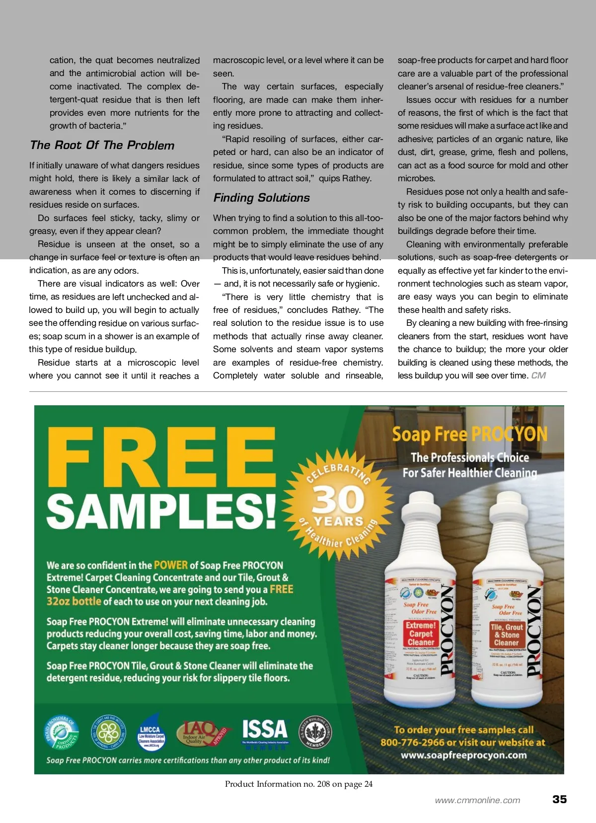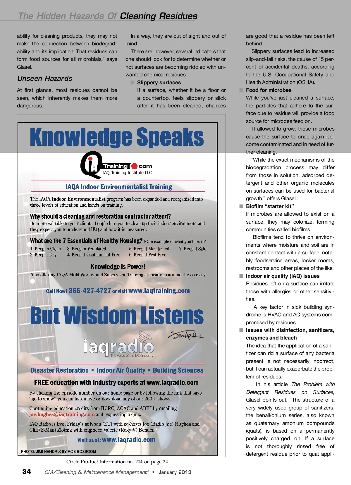 The Hidden Hazards Of Cleaning Residues ability for cleaning products, they may not make the connection between biodegrad-ability and its implication: That residues can form food sources for all microbials,” says Glasel. In a way, they are out of sight and out of mind. There are, however, several indicators that one should look for to determine whether or not surfaces are becoming riddled with un-wanted chemical residues. ■ Slippery surfaces If a surface, whether it be a floor or a countertop, feels slippery or slick after it has been cleaned, chances are good that a residue has been left behind. Slippery surfaces lead to increased slip-and-fall risks, the cause of 15 per-cent of accidental deaths, according to the U.S. Occupational Safety and Health Administration (OSHA). Food for microbes While you’ve just cleaned a surface, the particles that adhere to the sur-face due to residue will provide a food source for microbes feed on. If allowed to grow, those microbes cause the surface to once again be-come contaminated and in need of fur-ther cleaning. “While the exact mechanisms of the biodegradation process may differ from those in solution, adsorbed de-tergent and other organic molecules on surfaces can be used for bacterial growth,” offers Glasel. Biofilm “starter kit” If microbes are allowed to exist on a surface, they may colonize, forming communities called biofilms. Biofilms tend to thrive on environ-ments where moisture and soil are in constant contact with a surface, nota-bly foodservice areas, locker rooms, restrooms and other places of the like. Indoor air quality (IAQ) issues Residues left on a surface can irritate those with allergies or other sensitivi-ties. A key factor in sick building syn-drome is HVAC and AC systems com-promised by residues. Issues with disinfection, sanitizers, enzymes and bleach The idea that the application of a sani-tizer can rid a surface of any bacteria present is not necessarily incorrect, but it can actually exacerbate the prob-lem of residues. In his article The Problem with Detergent Residues on Surfaces, Glasel points out, “The structure of a very widely used group of sanitizers, the benalkonium series, also known as quaternary amonium compounds (quats), is based on a permanently positively charged ion. If a surface is not thoroughly rinsed free of detergent residue prior to quat appli-Unseen Hazards At first glance, most residues cannot be seen, which inherently makes them more dangerous. ■ A Training com IAQ Training Institute LLC ■ ■ ■ The Voice of the IAQ Industry Circle Product Information no. 204 on page 24 34 CM/Cleaning & Maintenance Management ® • January 2013