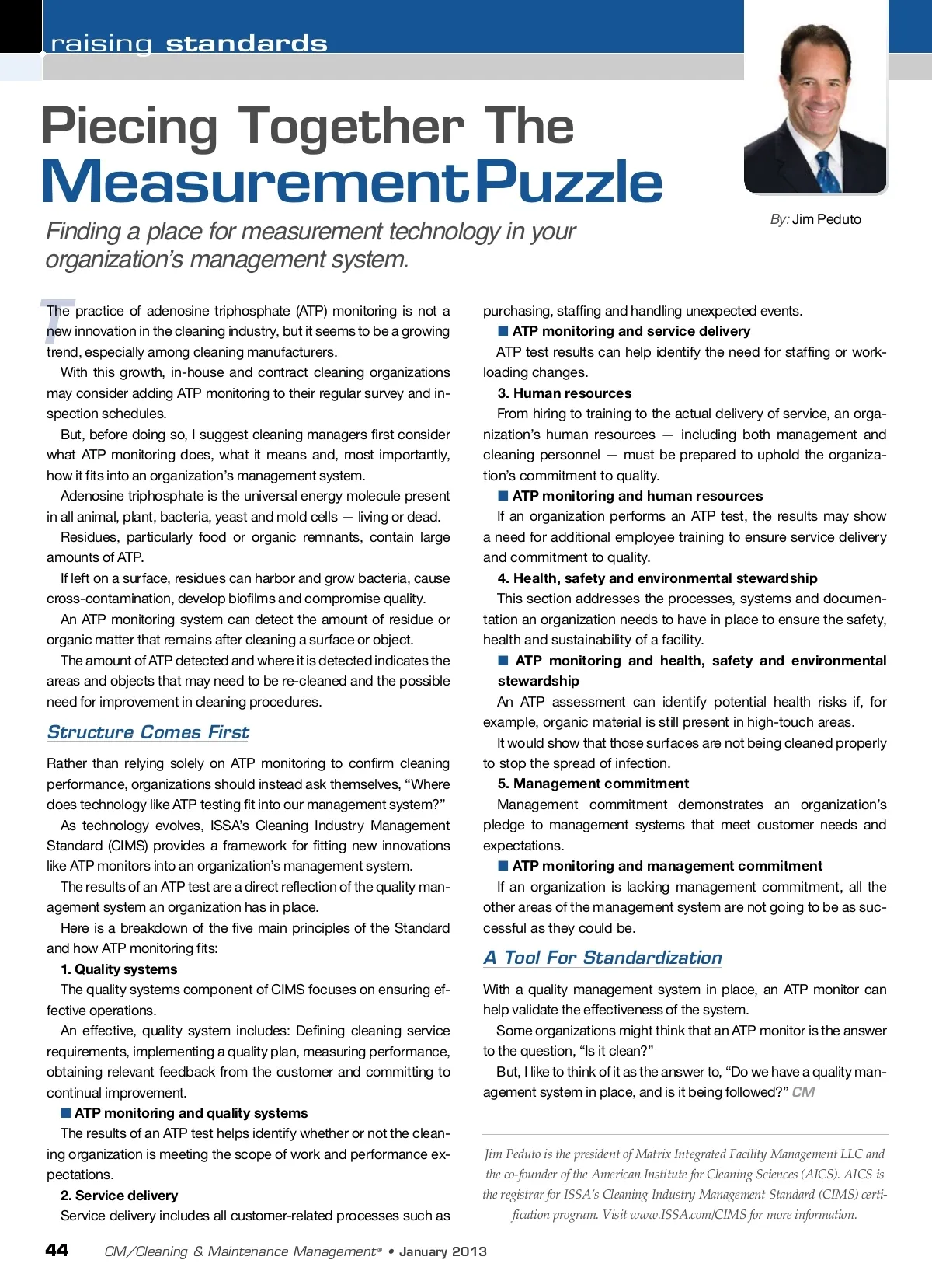 raising standards Piecing Together The Measurement Puzzle Finding a place for measurement technology in your organization’s management system. By: Jim Peduto T The practice of adenosine triphosphate (ATP) monitoring is not a new innovation in the cleaning industry, but it seems to be a growing trend, especially among cleaning manufacturers. With this growth, in-house and contract cleaning organizations may consider adding ATP monitoring to their regular survey and in-spection schedules. But, before doing so, I suggest cleaning managers first consider what ATP monitoring does, what it means and, most importantly, how it fits into an organization’s management system. Adenosine triphosphate is the universal energy molecule present in all animal, plant, bacteria, yeast and mold cells — living or dead. Residues, particularly food or organic remnants, contain large amounts of ATP. If left on a surface, residues can harbor and grow bacteria, cause cross-contamination, develop biofilms and compromise quality. An ATP monitoring system can detect the amount of residue or organic matter that remains after cleaning a surface or object. The amount of ATP detected and where it is detected indicates the areas and objects that may need to be re-cleaned and the possible need for improvement in cleaning procedures. Structure Comes First Rather than relying solely on ATP monitoring to confirm cleaning performance, organizations should instead ask themselves, “Where does technology like ATP testing fit into our management system?” As technology evolves, ISSA’s Cleaning Industry Management Standard (CIMS) provides a framework for fitting new innovations like ATP monitors into an organization’s management system. The results of an ATP test are a direct reflection of the quality man-agement system an organization has in place. Here is a breakdown of the five main principles of the Standard and how ATP monitoring fits: 1. Quality systems The quality systems component of CIMS focuses on ensuring ef-fective operations. An effective, quality system includes: Defining cleaning service requirements, implementing a quality plan, measuring performance, obtaining relevant feedback from the customer and committing to continual improvement. ■ ATP monitoring and quality systems The results of an ATP test helps identify whether or not the clean-ing organization is meeting the scope of work and performance ex-pectations. 2. Service delivery Service delivery includes all customer-related processes such as purchasing, staffing and handling unexpected events. ■ ATP monitoring and service delivery ATP test results can help identify the need for staffing or work-loading changes. 3. Human resources From hiring to training to the actual delivery of service, an orga-nization’s human resources — including both management and cleaning personnel — must be prepared to uphold the organiza-tion’s commitment to quality. ■ ATP monitoring and human resources If an organization performs an ATP test, the results may show a need for additional employee training to ensure service delivery and commitment to quality. 4. Health, safety and environmental stewardship This section addresses the processes, systems and documen-tation an organization needs to have in place to ensure the safety, health and sustainability of a facility. ■ ATP monitoring and health, safety and environmental stewardship An ATP assessment can identify potential health risks if, for example, organic material is still present in high-touch areas. It would show that those surfaces are not being cleaned properly to stop the spread of infection. 5. Management commitment Management commitment demonstrates an organization’s pledge to management systems that meet customer needs and expectations. ■ ATP monitoring and management commitment If an organization is lacking management commitment, all the other areas of the management system are not going to be as suc-cessful as they could be. A Tool For Standardization With a quality management system in place, an ATP monitor can help validate the effectiveness of the system. Some organizations might think that an ATP monitor is the answer to the question, “Is it clean?” But, I like to think of it as the answer to, “Do we have a quality man-agement system in place, and is it being followed?” CM Jim Peduto is the president of Matrix Integrated Facility Management LLC and the co-founder of the American Institute for Cleaning Sciences (AICS). AICS is the registrar for ISSA’s Cleaning Industry Management Standard (CIMS) certi-fication program. Visit www.ISSA.com/CIMS for more information. 44 CM/Cleaning & Maintenance Management ® • January 2013