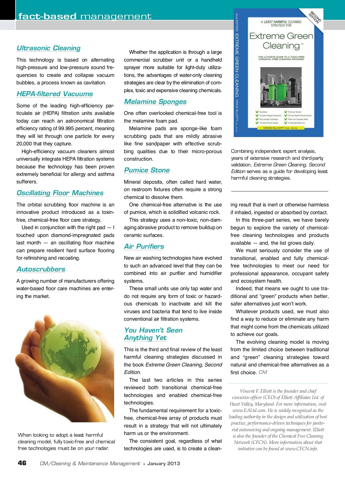 fact-based management Ultrasonic Cleaning This technology is based on alternating high-pressure and low-pressure sound fre-quencies to create and collapse vacuum bubbles, a process known as cavitation. HEPA-filtered Vacuums Some of the leading high-efficiency par-ticulate air (HEPA) filtration units available today can reach an astronomical filtration efficiency rating of 99.995 percent, meaning they will let through one particle for every 20,000 that they capture. High-efficiency vacuum cleaners almost universally integrate HEPA filtration systems because the technology has been proven extremely beneficial for allergy and asthma sufferers. Whether the application is through a large commercial scrubber unit or a handheld sprayer more suitable for light-duty utiliza-tions, the advantages of water-only cleaning strategies are clear by the elimination of com-plex, toxic and expensive cleaning chemicals. Melamine Sponges One often overlooked chemical-free tool is the melamine foam pad. Melamine pads are sponge-like foam scrubbing pads that are mildly abrasive like fine sandpaper with effective scrub-bing qualities due to their micro-porous construction. Pumice Stone Mineral deposits, often called hard water, on restroom fixtures often require a strong chemical to dissolve them. One chemical-free alternative is the use of pumice, which is solidified volcanic rock. This strategy uses a non-toxic, non-dam-aging abrasive product to remove buildup on ceramic surfaces. Combining independent expert analysis, years of extensive research and third-party validation, Extreme Green Cleaning, Second Edition serves as a guide for developing least harmful cleaning strategies. Oscillating Floor Machines The orbital scrubbing floor machine is an innovative product introduced as a toxin-free, chemical-free floor care strategy. Used in conjunction with the right pad — I touched upon diamond-impregnated pads last month — an oscillating floor machine can prepare resilient hard surface flooring for refinishing and recoating. Air Purifiers New air washing technologies have evolved to such an advanced level that they can be combined into air purifier and humidifier systems. These small units use only tap water and do not require any form of toxic or hazard-ous chemicals to inactivate and kill the viruses and bacteria that tend to live inside conventional air filtration systems. Autoscrubbers A growing number of manufacturers offering water-based floor care machines are enter-ing the market. You Haven’t Seen Anything Yet This is the third and final review of the least harmful cleaning strategies discussed in the book Extreme Green Cleaning , Second Edition . The last two articles in this series reviewed both transitional chemical-free technologies and enabled chemical-free technologies. The fundamental requirement for a toxic-free, chemical-free array of products must result in a strategy that will not ultimately harm us or the environment. The consistent goal, regardless of what technologies are used, is to create a clean-ing result that is inert or otherwise harmless if inhaled, ingested or absorbed by contact. In this three-part series, we have barely begun to explore the variety of chemical-free cleaning technologies and products available — and, the list grows daily. We must seriously consider the use of transitional, enabled and fully chemical-free technologies to meet our need for professional appearance, occupant safety and ecosystem health. Indeed, that means we ought to use tra-ditional and “green” products when better, safer alternatives just won’t work. Whatever products used, we must also find a way to reduce or eliminate any harm that might come from the chemicals utilized to achieve our goals. The evolving cleaning model is moving from the limited choice between traditional and “green” cleaning strategies toward natural and chemical-free alternatives as a first choice. CM When looking to adopt a least harmful cleaning model, fully toxic-free and chemical free technologies must be on your radar. Vincent F. Elliott is the founder and chief executive officer (CEO) of Elliott Affiliates Ltd. of Hunt Valley, Maryland. For more information, visit www.EALtd.com. He is widely recognized as the leading authority in the design and utilization of best practice, performance-driven techniques for janito-rial outsourcing and ongoing management. Elliott is also the founder of the Chemical Free Cleaning Network (CFCN). More information about that initiative can be found at www.CFCN.info. 46 CM/Cleaning & Maintenance Management ® • January 2013