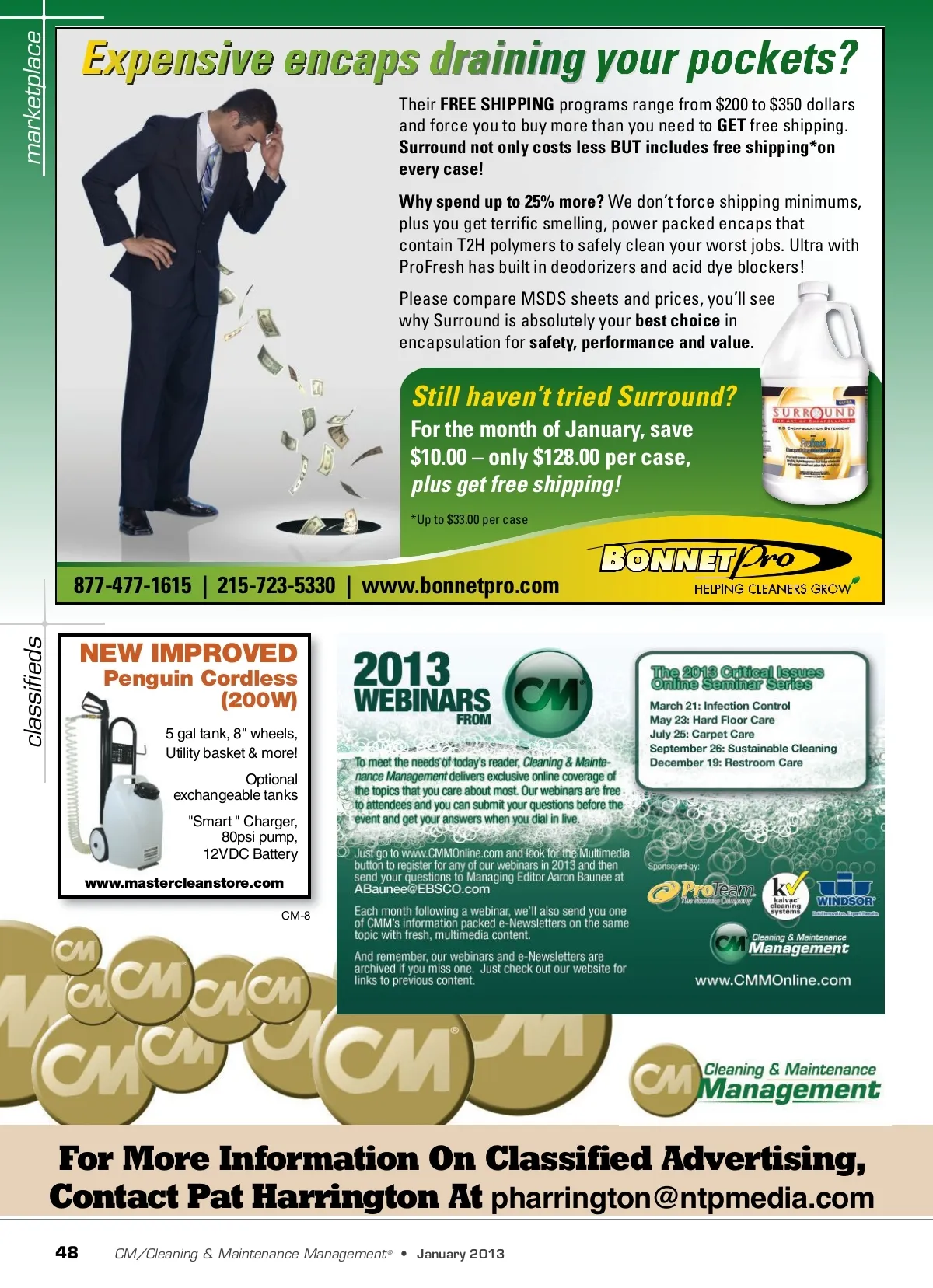 marketplace Their FREE SHIPPING programs range from $200 to $350 dollars and force you to buy more than you need to GET free shipping. Surround not only costs less BUT includes free shipping*on every case! Why spend up to 25% more? We don’t force shipping minimums, plus you get terrific smelling, power packed encaps that contain T2H polymers to safely clean your worst jobs. Ultra with ProFresh has built in deodorizers and acid dye blockers! Please compare MSDS sheets and prices, you’ll see ee why Surround is absolutely your best choice in encapsulation for safety, performance and value. AM Page 1 Still haven’t tried Surround? For the month of January, save $10.00 – only $128.00 per case, plus get free shipping! *Up to $33.00 per case 877-477-1615 | 215-723-5330 | www.bonnetpro.com classifieds NEW IMPROVED Penguin Cordless (200W) 5 gal tank, 8" wheels, Utility basket & more! Optional exchangeable tanks "Smart " Charger, 80psi pump, 12VDC Battery www.mastercleanstore.com0 CM-8 For More Information On Classified Advertising, Contact Pat Harrington At [email protected] 48 CM/Cleaning & Maintenance Management ® • January 2013