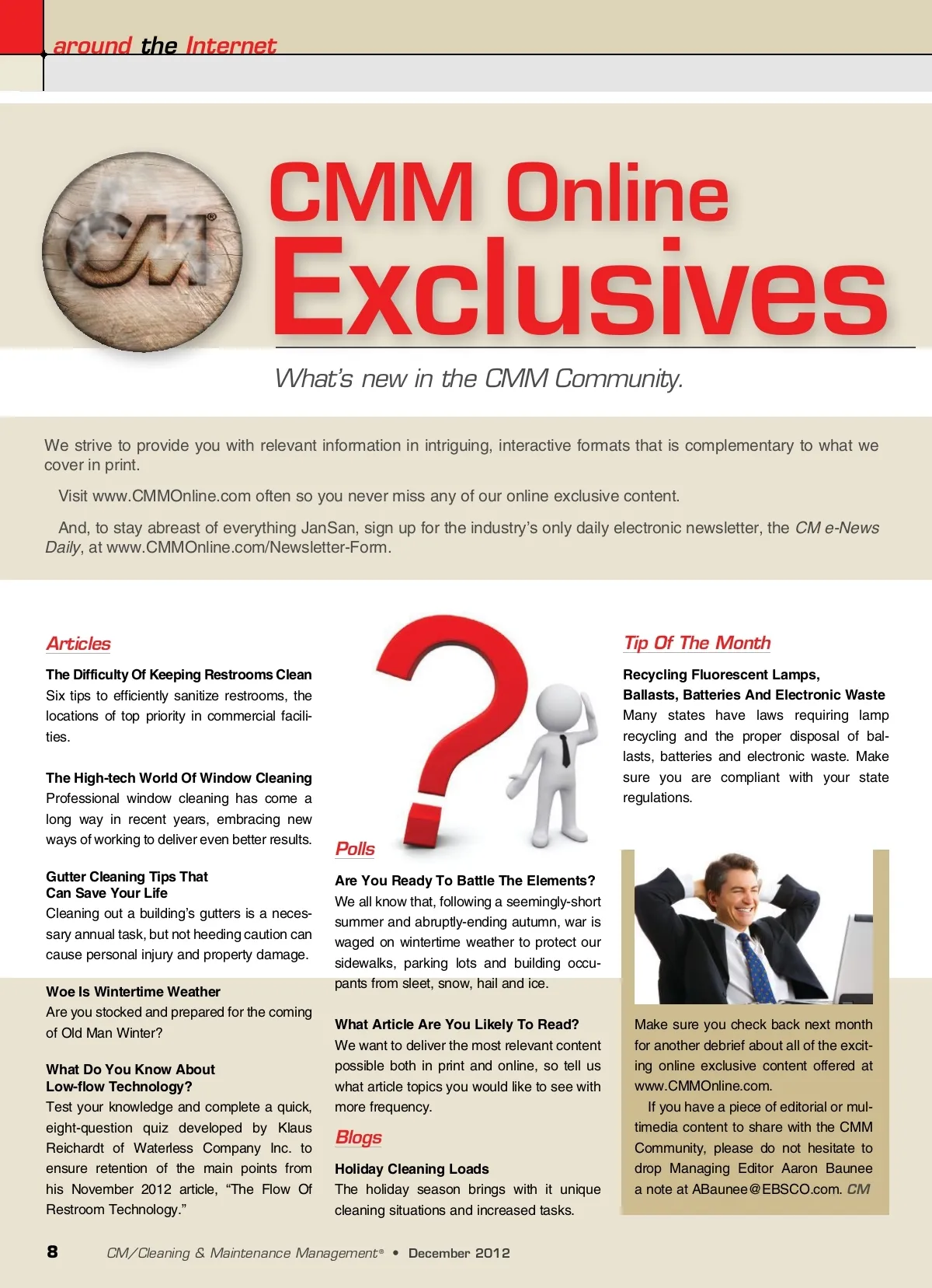 around the Internet CMM Online What’s new in the CMM Community. Exclusives We strive to provide you with relevant information in intriguing, interactive formats that is complementary to what we cover in print. Visit www.CMMOnline.com often so you never miss any of our online exclusive content. And, to stay abreast of everything JanSan, sign up for the industry’s only daily electronic newsletter, the CM e-News Daily , at www.CMMOnline.com/Newsletter-Form. Articles The Difficulty Of Keeping Restrooms Clean Six tips to efficiently sanitize restrooms, the locations of top priority in commercial facili-ties. The High-tech World Of Window Cleaning Professional window cleaning has come a long way in recent years, embracing new ways of working to deliver even better results. Gutter Cleaning Tips That Can Save Your Life Cleaning out a building’s gutters is a neces-sary annual task, but not heeding caution can cause personal injury and property damage. Woe Is Wintertime Weather Are you stocked and prepared for the coming of Old Man Winter? What Do You Know About Low-flow Technology? Test your knowledge and complete a quick, eight-question quiz developed by Klaus Reichardt of Waterless Company Inc. to ensure retention of the main points from his November 2012 article, “The Flow Of Restroom Technology.” Tip Of The Month Recycling Fluorescent Lamps, Ballasts, Batteries And Electronic Waste Many states have laws requiring lamp recycling and the proper disposal of bal-lasts, batteries and electronic waste. Make sure you are compliant with your state regulations. Polls Are You Ready To Battle The Elements? We all know that, following a seemingly-short summer and abruptly-ending autumn, war is waged on wintertime weather to protect our sidewalks, parking lots and building occu-pants from sleet, snow, hail and ice. What Article Are You Likely To Read? We want to deliver the most relevant content possible both in print and online, so tell us what article topics you would like to see with more frequency. Make sure you check back next month for another debrief about all of the excit-ing online exclusive content offered at www.CMMOnline.com. If you have a piece of editorial or mul-timedia content to share with the CMM Community, please do not hesitate to drop Managing Editor Aaron Baunee a note at [email protected]. CM Blogs Holiday Cleaning Loads The holiday season brings with it unique cleaning situations and increased tasks. 8 CM/Cleaning & Maintenance Management ® • December 2012