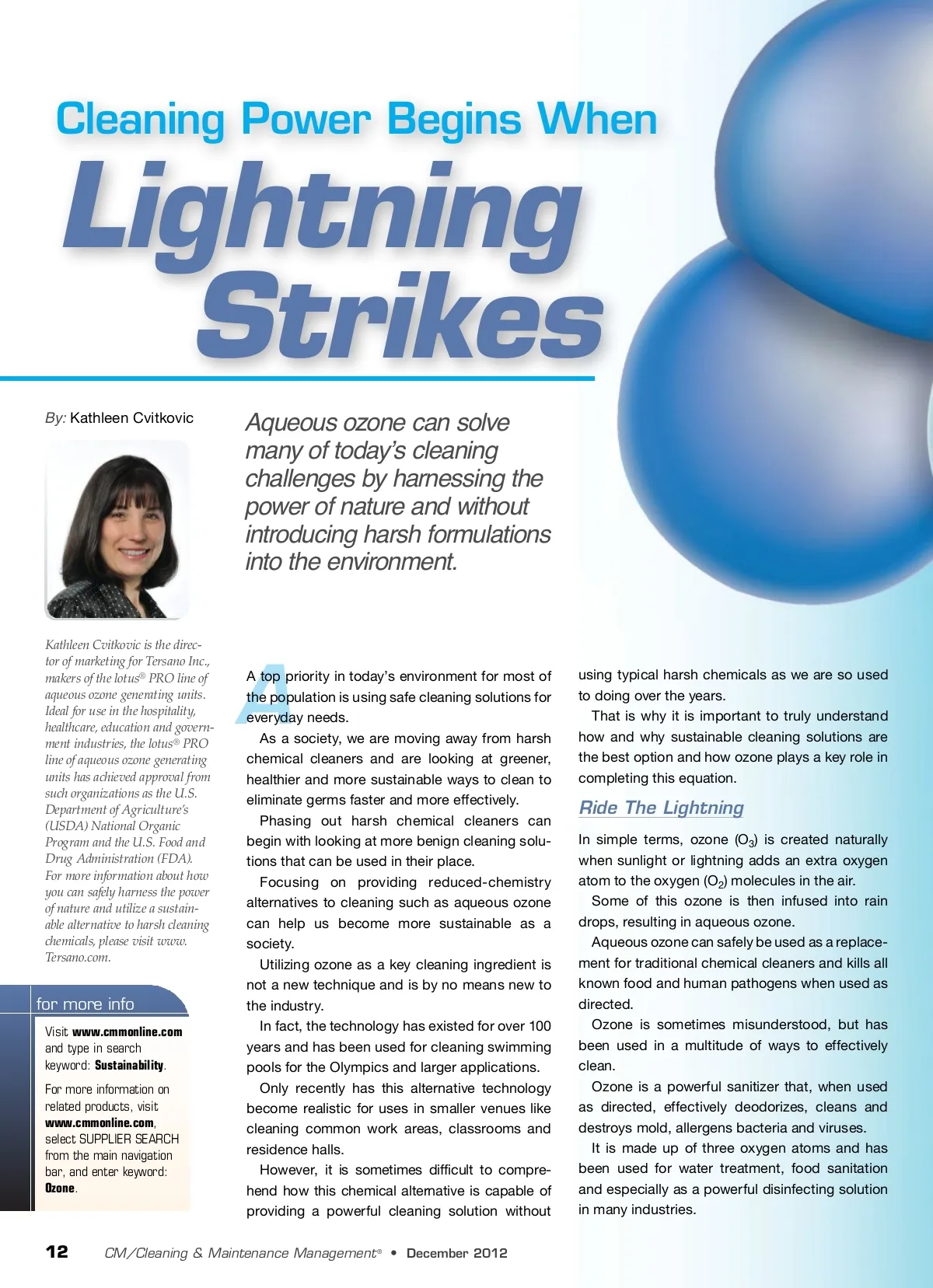Cleaning Power Begins When Lightning Strikes By: Kathleen Cvitkovic Aqueous ozone can solve many of today’s cleaning challenges by harnessing the power of nature and without introducing harsh formulations into the environment. Kathleen Cvitkovic is the direc-tor of marketing for Tersano Inc., makers of the lotus ® PRO line of aqueous ozone generating units. Ideal for use in the hospitality, healthcare, education and govern-ment industries, the lotus ® PRO line of aqueous ozone generating units has achieved approval from such organizations as the U.S. Department of Agriculture’s (USDA) National Organic Program and the U.S. Food and Drug Administration (FDA). For more information about how you can safely harness the power of nature and utilize a sustain-able alternative to harsh cleaning chemicals, please visit www. Tersano.com. A for more info Visit www.cmmonline.com and type in search keyword: Sustainability . For more information on related products, visit www.cmmonline.com , select SUPPLIER SEARCH from the main navigation bar, and enter keyword: Ozone . A top priority in today’s environment for most of the population is using safe cleaning solutions for everyday needs. As a society, we are moving away from harsh chemical cleaners and are looking at greener, healthier and more sustainable ways to clean to eliminate germs faster and more effectively. Phasing out harsh chemical cleaners can begin with looking at more benign cleaning solu-tions that can be used in their place. Focusing on providing reduced-chemistry alternatives to cleaning such as aqueous ozone can help us become more sustainable as a society. Utilizing ozone as a key cleaning ingredient is not a new technique and is by no means new to the industry. In fact, the technology has existed for over 100 years and has been used for cleaning swimming pools for the Olympics and larger applications. Only recently has this alternative technology become realistic for uses in smaller venues like cleaning common work areas, classrooms and residence halls. However, it is sometimes difficult to compre-hend how this chemical alternative is capable of providing a powerful cleaning solution without using typical harsh chemicals as we are so used to doing over the years. That is why it is important to truly understand how and why sustainable cleaning solutions are the best option and how ozone plays a key role in completing this equation. Ride The Lightning In simple terms, ozone (O 3 ) is created naturally when sunlight or lightning adds an extra oxygen atom to the oxygen (O 2 ) molecules in the air. Some of this ozone is then infused into rain drops, resulting in aqueous ozone. Aqueous ozone can safely be used as a replace-ment for traditional chemical cleaners and kills all known food and human pathogens when used as directed. Ozone is sometimes misunderstood, but has been used in a multitude of ways to effectively clean. Ozone is a powerful sanitizer that, when used as directed, effectively deodorizes, cleans and destroys mold, allergens bacteria and viruses. It is made up of three oxygen atoms and has been used for water treatment, food sanitation and especially as a powerful disinfecting solution in many industries. 12 CM/Cleaning & Maintenance Management ® • December 2012