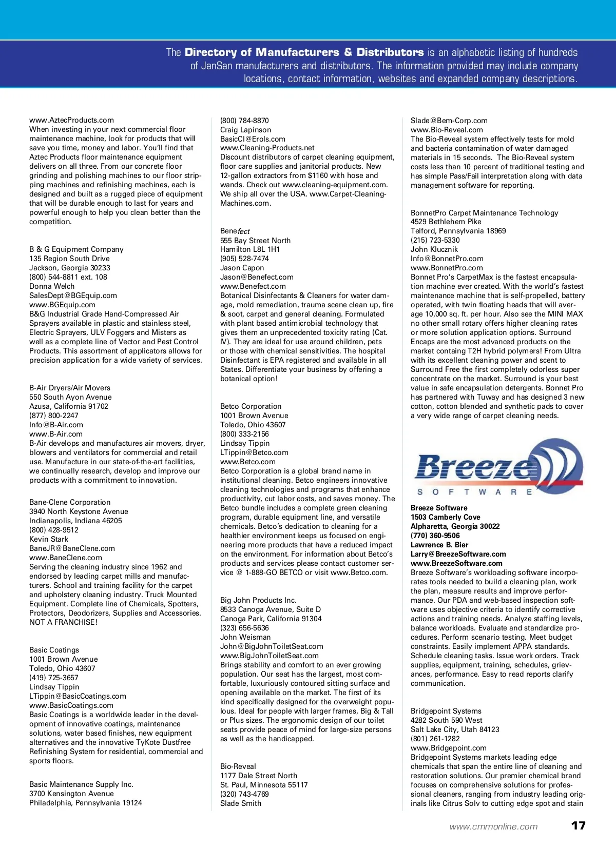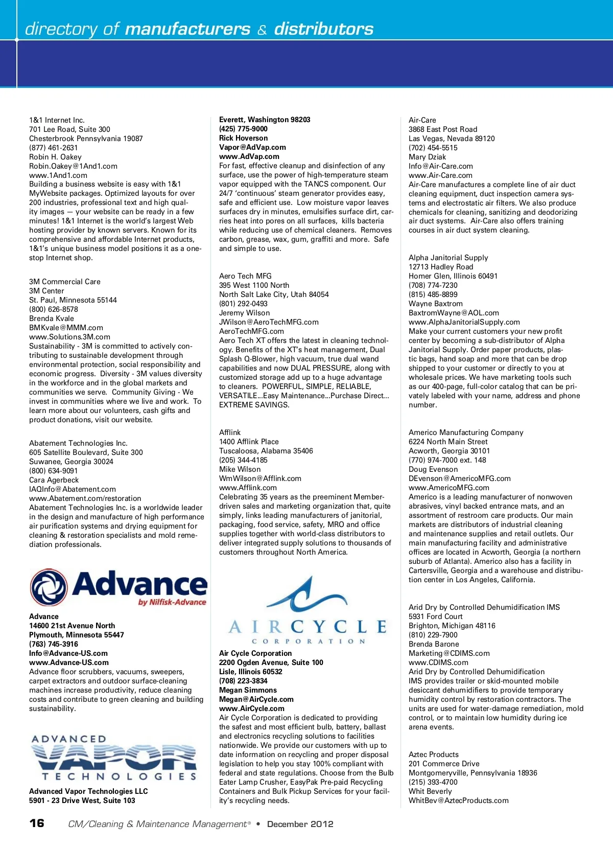 directory of manufacturers & distributors 1&1 Internet Inc. 701 Lee Road, Suite 300 Chesterbrook Pennsylvania 19087 (877) 461-2631 Robin H. Oakey [email protected] www.1And1.com Building a business website is easy with 1&1 MyWebsite packages. Optimized layouts for over 200 industries, professional text and high qual-ity images — your website can be ready in a few minutes! 1&1 Internet is the world’s largest Web hosting provider by known servers. Known for its comprehensive and affordable Internet products, 1&1’s unique business model positions it as a one-stop Internet shop. 3M Commercial Care 3M Center St. Paul, Minnesota 55144 (800) 626-8578 Brenda Kvale [email protected] www.Solutions.3M.com Sustainability -3M is committed to actively con-tributing to sustainable development through environmental protection, social responsibility and economic progress. Diversity -3M values diversity in the workforce and in the global markets and communities we serve. Community Giving -We invest in communities where we live and work. To learn more about our volunteers, cash gifts and product donations, visit our website. Abatement Technologies Inc. 605 Satellite Boulevard, Suite 300 Suwanee, Georgia 30024 (800) 634-9091 Cara Agerbeck [email protected] www.Abatement.com/restoration Abatement Technologies Inc. is a worldwide leader in the design and manufacture of high performance air purification systems and drying equipment for cleaning & restoration specialists and mold reme-diation professionals. Everett, Washington 98203 (425) 775-9000 Rick Hoverson [email protected] www.AdVap.com For fast, effective cleanup and disinfection of any surface, use the power of high-temperature steam vapor equipped with the TANCS component. Our 24/7 ‘continuous’ steam generator provides easy, safe and efficient use. Low moisture vapor leaves surfaces dry in minutes, emulsifies surface dirt, car-ries heat into pores on all surfaces, kills bacteria while reducing use of chemical cleaners. Removes carbon, grease, wax, gum, graffiti and more. Safe and simple to use. Air-Care 3868 East Post Road Las Vegas, Nevada 89120 (702) 454-5515 Mary Dziak [email protected] www.Air-Care.com Air-Care manufactures a complete line of air duct cleaning equipment, duct inspection camera sys-tems and electrostatic air filters. We also produce chemicals for cleaning, sanitizing and deodorizing air duct systems. Air-Care also offers training courses in air duct system cleaning. Aero Tech MFG 395 West 1100 North North Salt Lake City, Utah 84054 (801) 292-0493 Jeremy Wilson [email protected] AeroTechMFG.com Aero Tech XT offers the latest in cleaning technol-ogy. Benefits of the XT’s heat management, Dual Splash Q-Blower, high vacuum, true dual wand capabilities and now DUAL PRESSURE, along with customized storage add up to a huge advantage to cleaners. POWERFUL, SIMPLE, RELIABLE, VERSATILE...Easy Maintenance...Purchase Direct... EXTREME SAVINGS. Alpha Janitorial Supply 12713 Hadley Road Homer Glen, Illinois 60491 (708) 774-7230 (815) 485-8899 Wayne Baxtrom [email protected] www.AlphaJanitorialSupply.com Make your current customers your new profit center by becoming a sub-distributor of Alpha Janitorial Supply. Order paper products, plas-tic bags, hand soap and more that can be drop shipped to your customer or directly to you at wholesale prices. We have marketing tools such as our 400-page, full-color catalog that can be pri-vately labeled with your name, address and phone number. Afflink 1400 Afflink Place Tuscaloosa, Alabama 35406 (205) 344-4185 Mike Wilson [email protected] www.Afflink.com Celebrating 35 years as the preeminent Member-driven sales and marketing organization that, quite simply, links leading manufacturers of janitorial, packaging, food service, safety, MRO and office supplies together with world-class distributors to deliver integrated supply solutions to thousands of customers throughout North America. Americo Manufacturing Company 6224 North Main Street Acworth, Georgia 30101 (770) 974-7000 ext. 148 Doug Evenson [email protected] www.AmericoMFG.com Americo is a leading manufacturer of nonwoven abrasives, vinyl backed entrance mats, and an assortment of restroom care products. Our main markets are distributors of industrial cleaning and maintenance supplies and retail outlets. Our main manufacturing facility and administrative offices are located in Acworth, Georgia (a northern suburb of Atlanta). Americo also has a facility in Cartersville, Georgia and a warehouse and distribu-tion center in Los Angeles, California. Advance 14600 21st Avenue North Plymouth, Minnesota 55447 (763) 745-3916 [email protected] www.Advance-US.com Advance floor scrubbers, vacuums, sweepers, carpet extractors and outdoor surface-cleaning machines increase productivity, reduce cleaning costs and contribute to green cleaning and building sustainability. Advanced Vapor Technologies LLC 5901 -23 Drive West, Suite 103 Air Cycle Corporation 2200 Ogden Avenue, Suite 100 Lisle, Illinois 60532 (708) 223-3834 Megan Simmons [email protected] www.AirCycle.com Air Cycle Corporation is dedicated to providing the safest and most efficient bulb, battery, ballast and electronics recycling solutions to facilities nationwide. We provide our customers with up to date information on recycling and proper disposal legislation to help you stay 100% compliant with federal and state regulations. Choose from the Bulb Eater Lamp Crusher, EasyPak Pre-paid Recycling Containers and Bulk Pickup Services for your facil-ity’s recycling needs. Arid Dry by Controlled Dehumidification IMS 5931 Ford Court Brighton, Michigan 48116 (810) 229-7900 Brenda Barone [email protected] www.CDIMS.com Arid Dry by Controlled Dehumidification IMS provides trailer or skid-mounted mobile desiccant dehumidifiers to provide temporary humidity control by restoration contractors. The units are used for water-damage remediation, mold control, or to maintain low humidity during ice arena events.