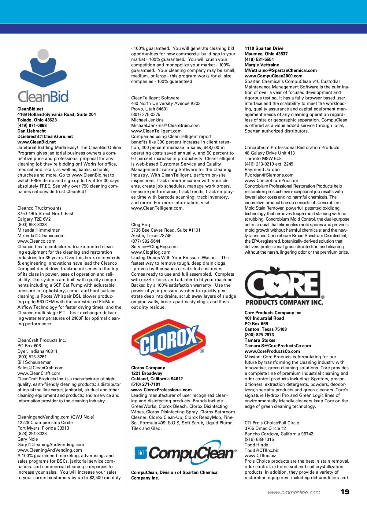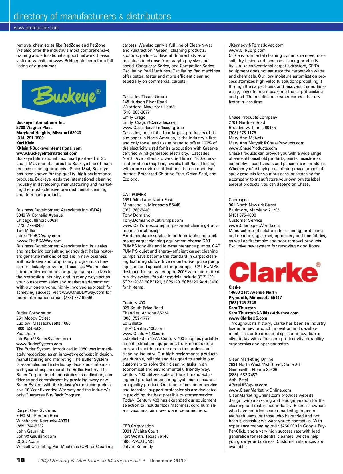 directory of manufacturers www.cmmonline.com removal chemistries like RedZone and PetZone. We also offer the industry’s most comprehensive training and educational support network. Please visit our website at www.Bridgepoint.com for a full listing of our courses. & distributors [email protected] www.CFRCorp.com CFR environmental cleaning systems remove more soil, dry faster, and increase cleaning productiv-ity. Unlike conventional carpet extractors, CFR’s equipment does not saturate the carpet with water and chemicals. Our low-moisture automization pro-cess atomizes high velocity solution; propelling it through the carpet fibers and recovers it simultane-ously, never letting it soak into the carpet backing and pad. The results are cleaner carpets that dry faster in less time. carpets. We also carry a full line of Clean-N-Vac and Abstraction “Green” cleaning products, spotters, pads etc. Several different styles of machines to choose from varying by size and speed. Conqueror Series, and Competitor Series Oscillating Pad Machines. Oscillating Pad machines offer better, faster and more efficient cleaning especially on commercial carpets. Buckeye International Inc. 2700 Wagner Place Maryland Heights, Missouri 63043 (314) 291-1900 Karl Klein [email protected] www.BuckeyeInternational.com Buckeye International Inc., headquartered in St. Louis, MO, manufactures the Buckeye line of main-tenance cleaning products. Since 1844, Buckeye has been known for top-quality, high-performance products. Buckeye leads the international cleaning industry in developing, manufacturing and market-ing the most extensive branded line of cleaning and floor care products. Cascades Tissue Group 148 Hudson River Road Waterford, New York 12188 (518) 880-3677 Emily Crago [email protected] www.Cascades.com/tissuegroup Cascades, one of the four largest producers of tis-sue paper in North America, is the industry’s first and only towel and tissue brand to offset 100% of the electricity used for its production with Green-e certified wind-generated electricity. Cascades North River offers a diversified line of 100% recy-cled products (napkins, towels, bath/facial tissue) with more enviro certifications than competitive brands: Processed Chlorine Free, Green Seal, and Ecologo. Chase Products Company 2701 Gardner Road Broadview, Illinois 60155 (708) 273-1175 Mary Ann Matysik [email protected] www.ChaseProducts.com Chase Products can provide you with a wide range of aerosol household products, paints, insecticides, automotive, bench, craft, and personal care products. Whether you’re buying one of our proven brands of spray products for your business, or searching for a company to manufacture your own private label aerosol products, you can depend on Chase. Business Development Associates Inc. (BDA) 5848 W Cornelia Avenue Chicago, Illinois 60634 (773) 777-9956 Tim Miller [email protected] www.TheBDAWay.com Business Development Associates Inc. is a sales and marketing consulting agency that helps restor-ers generate millions of dollars in new business with exclusive and proprietary programs so they can predictably grow their business. We are also a true implementation company that specializes in the restoration industry, and in many ways act as your outsourced sales and marketing department with our one-on-one, highly involved approach for achieving success. Visit www.theBDAway.com for more information or call (773) 777-9956! CAT PUMPS 1681 94th Lane North East Minneapolis, Minnesota 55449 (763) 780-5440 Tony Domiano [email protected] www.CatPumps.com/pumps-carpet-cleaning-truck-mount-portable.asp For dependable service in both portable and truck mount carpet cleaning equipment choose CAT PUMPS long-life and low-maintenance pumps. CAT PUMP’S quiet and energy-efficient carpet cleaning pumps have become the standard in carpet clean-ing featuring clutch-drive or belt-drive, pulse pump injectors and special hi-temp pumps. CAT PUMPS designed for hot water up to 200F with intermittent run-dry cycles. Popular models include 3CP1120, 5CP2120W, 5CP3120, 5CP5120, 5CP6120 Add .3400 for hi-temp. Chemspec 901 North Newkirk Street Baltimore, Maryland 21205 (410) 675-4800 Customer Service www.ChemspecWorld.com Manufacturer of solutions for cleaning, protecting and deodorizing carpet, upholstery and fine fabrics, as well as fire/smoke and odor-removal products. Exclusive new system for renewing wood floors. Butler Corporation 251 Moody Street Ludlow, Massachusetts 1056 (800) 535-5025 Paul Joao [email protected] www.ButlerSystem.com The Butler System, introduced in 1980 was immedi-ately recognized as an innovative concept in design, manufacturing and marketing. The Butler System is assembled and installed by dedicated craftsman with year of experience at the Butler Factory. The Butler Corporation demonstrates its dedication, con-fidence and commitment by providing every new Butler System with the industry’s most comprehen-sive 10 Year Extended Warranty and the industry’s only Guarantee Buy Back Program. Carpet Care Systems 7980 Mt. Sterling Road Winchester, Kentucky 40391 (859) 744-5332 John Geurkink [email protected] CCSOP.com We sell Oscillating Pad Machines (OP) for Cleaning Century 400 325 South Price Road Chandler, Arizona 85224 (800) 752-1777 Ed Gillette [email protected] www.Century400.com Established in 1977, Century 400 supplies portable carpet extraction equipment, truckmount extrac-tors, and spotting extractors to the professional cleaning industry. Our high-performance products are durable, reliable and designed to enable our customers to solve their cleaning tasks in an economical and environmentally friendly way. Century 400 utilizes state of the art manufactur-ing and product engineering systems to ensure a top quality product. Our team of customer service and technical support professionals are dedicated in providing the best possible customer service. Today, Century 400 has expanded our equipment selection to inc
