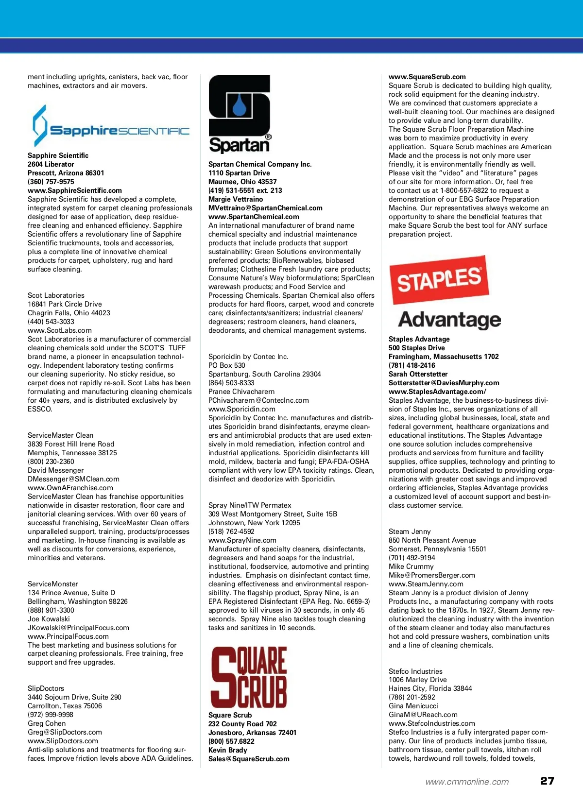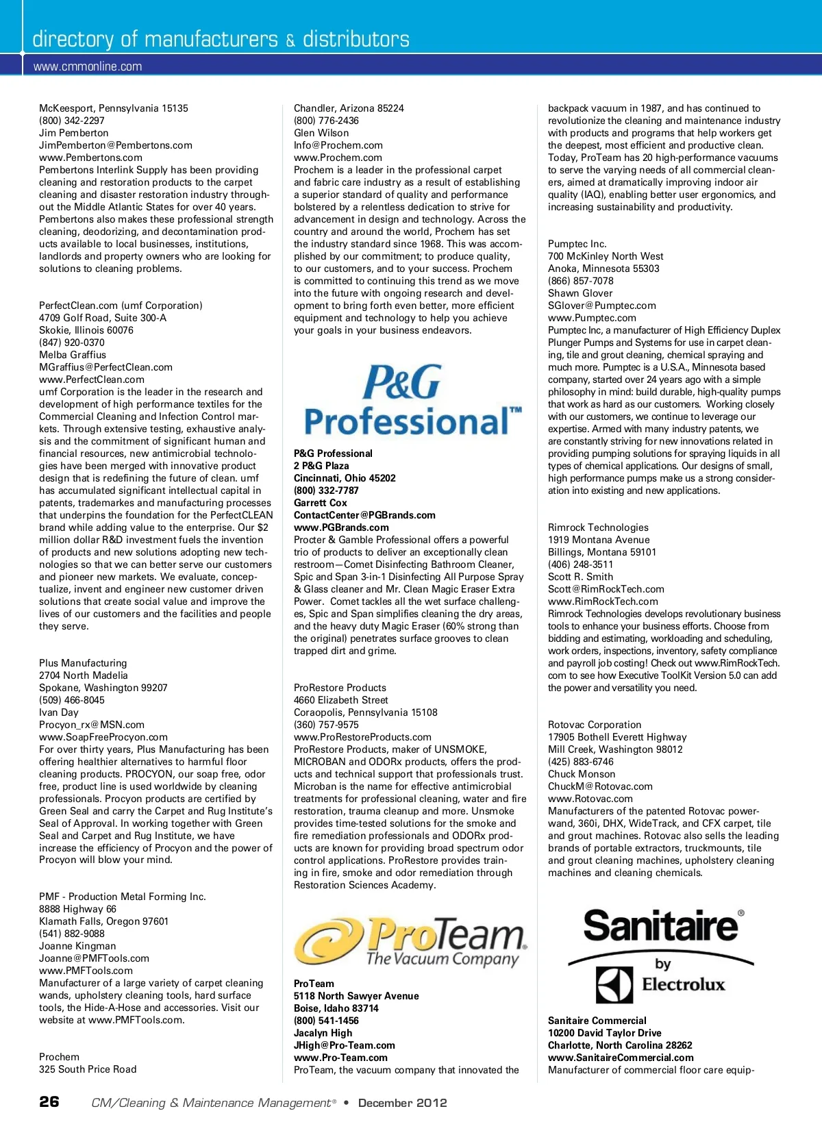 directory of manufacturers www.cmmonline.com McKeesport, Pennsylvania 15135 (800) 342-2297 Jim Pemberton [email protected] www.Pembertons.com Pembertons Interlink Supply has been providing cleaning and restoration products to the carpet cleaning and disaster restoration industry through-out the Middle Atlantic States for over 40 years. Pembertons also makes these professional strength cleaning, deodorizing, and decontamination prod-ucts available to local businesses, institutions, landlords and property owners who are looking for solutions to cleaning problems. & distributors backpack vacuum in 1987, and has continued to revolutionize the cleaning and maintenance industry with products and programs that help workers get the deepest, most efficient and productive clean. Today, ProTeam has 20 high-performance vacuums to serve the varying needs of all commercial clean-ers, aimed at dramatically improving indoor air quality (IAQ), enabling better user ergonomics, and increasing sustainability and productivity. PerfectClean.com (umf Corporation) 4709 Golf Road, Suite 300-A Skokie, Illinois 60076 (847) 920-0370 Melba Graffius [email protected] www.PerfectClean.com umf Corporation is the leader in the research and development of high performance textiles for the Commercial Cleaning and Infection Control mar-kets. Through extensive testing, exhaustive analy-sis and the commitment of significant human and financial resources, new antimicrobial technolo-gies have been merged with innovative product design that is redefining the future of clean. umf has accumulated significant intellectual capital in patents, trademarkes and manufacturing processes that underpins the foundation for the PerfectCLEAN brand while adding value to the enterprise. Our $2 million dollar R&D investment fuels the invention of products and new solutions adopting new tech-nologies so that we can better serve our customers and pioneer new markets. We evaluate, concep-tualize, invent and engineer new customer driven solutions that create social value and improve the lives of our customers and the facilities and people they serve. Chandler, Arizona 85224 (800) 776-2436 Glen Wilson [email protected] www.Prochem.com Prochem is a leader in the professional carpet and fabric care industry as a result of establishing a superior standard of quality and performance bolstered by a relentless dedication to strive for advancement in design and technology. Across the country and around the world, Prochem has set the industry standard since 1968. This was accom-plished by our commitment; to produce quality, to our customers, and to your success. Prochem is committed to continuing this trend as we move into the future with ongoing research and devel-opment to bring forth even better, more efficient equipment and technology to help you achieve your goals in your business endeavors. P&G Professional 2 P&G Plaza Cincinnati, Ohio 45202 (800) 332-7787 Garrett Cox [email protected] www.PGBrands.com Procter & Gamble Professional offers a powerful trio of products to deliver an exceptionally clean restroom—Comet Disinfecting Bathroom Cleaner, Spic and Span 3-in-1 Disinfecting All Purpose Spray & Glass cleaner and Mr. Clean Magic Eraser Extra Power. Comet tackles all the wet surface challeng-es, Spic and Span simplifies cleaning the dry areas, and the heavy duty Magic Eraser (60% strong than the original) penetrates surface grooves to clean trapped dirt and grime. Pumptec Inc. 700 McKinley North West Anoka, Minnesota 55303 (866) 857-7078 Shawn Glover [email protected] www.Pumptec.com Pumptec Inc, a manufacturer of High Efficiency Duplex Plunger Pumps and Systems for use in carpet clean-ing, tile and grout cleaning, chemical spraying and much more. Pumptec is a U.S.A., Minnesota based company, started over 24 years ago with a simple philosophy in mind: build durable, high-quality pumps that work as hard as our customers. Working closely with our customers, we continue to leverage our expertise. Armed with many industry patents, we are constantly striving for new innovations related in providing pumping solutions for spraying liquids in all types of chemical applications. Our designs of small, high performance pumps make us a strong consider-ation into existing and new applications. Plus Manufacturing 2704 North Madelia Spokane, Washington 99207 (509) 466-8045 Ivan Day [email protected] www.SoapFreeProcyon.com For over thirty years, Plus Manufacturing has been offering healthier alternatives to harmful floor cleaning products. PROCYON, our soap free, odor free, product line is used worldwide by cleaning professionals. Procyon products are certified by Green Seal and carry the Carpet and Rug Institute’s Seal of Approval. In working together with Green Seal and Carpet and Rug Institute, we have increase the efficiency of Procyon and the power of Procyon will blow your mind. ProRestore Products 4660 Elizabeth Street Coraopolis, Pennsylvania 15108 (360) 757-9575 www.ProRestoreProducts.com ProRestore Products, maker of UNSMOKE, MICROBAN and ODORx products, offers the prod-ucts and technical support that professionals trust. Microban is the name for effective antimicrobial treatments for professional cleaning, water and fire restoration, trauma cleanup and more. Unsmoke provides time-tested solutions for the smoke and fire remediation professionals and ODORx prod-ucts are known for providing broad spectrum odor control applications. ProRestore provides train-ing in fire, smoke and odor remediation through Restoration Sciences Academy. Rimrock Technologies 1919 Montana Avenue Billings, Montana 59101 (406) 248-3511 Scott R. Smith [email protected] www.RimRockTech.com Rimrock Technologies develops revolutionary business tools to enhance your business efforts. Choose from bidding and estimating, workloading and scheduling, work orders, inspections, inventory, safety compliance and payroll job costing! Check out www.RimRockTech. com to see how Executive ToolK