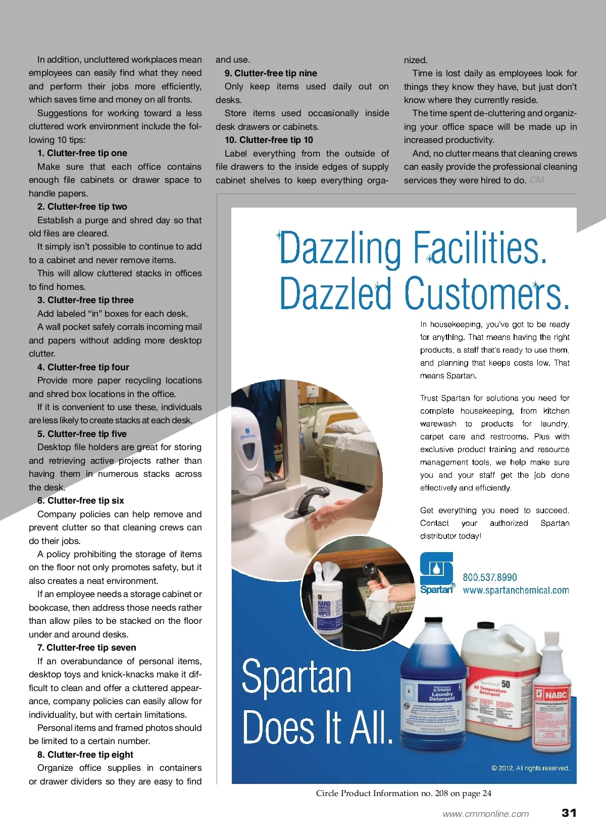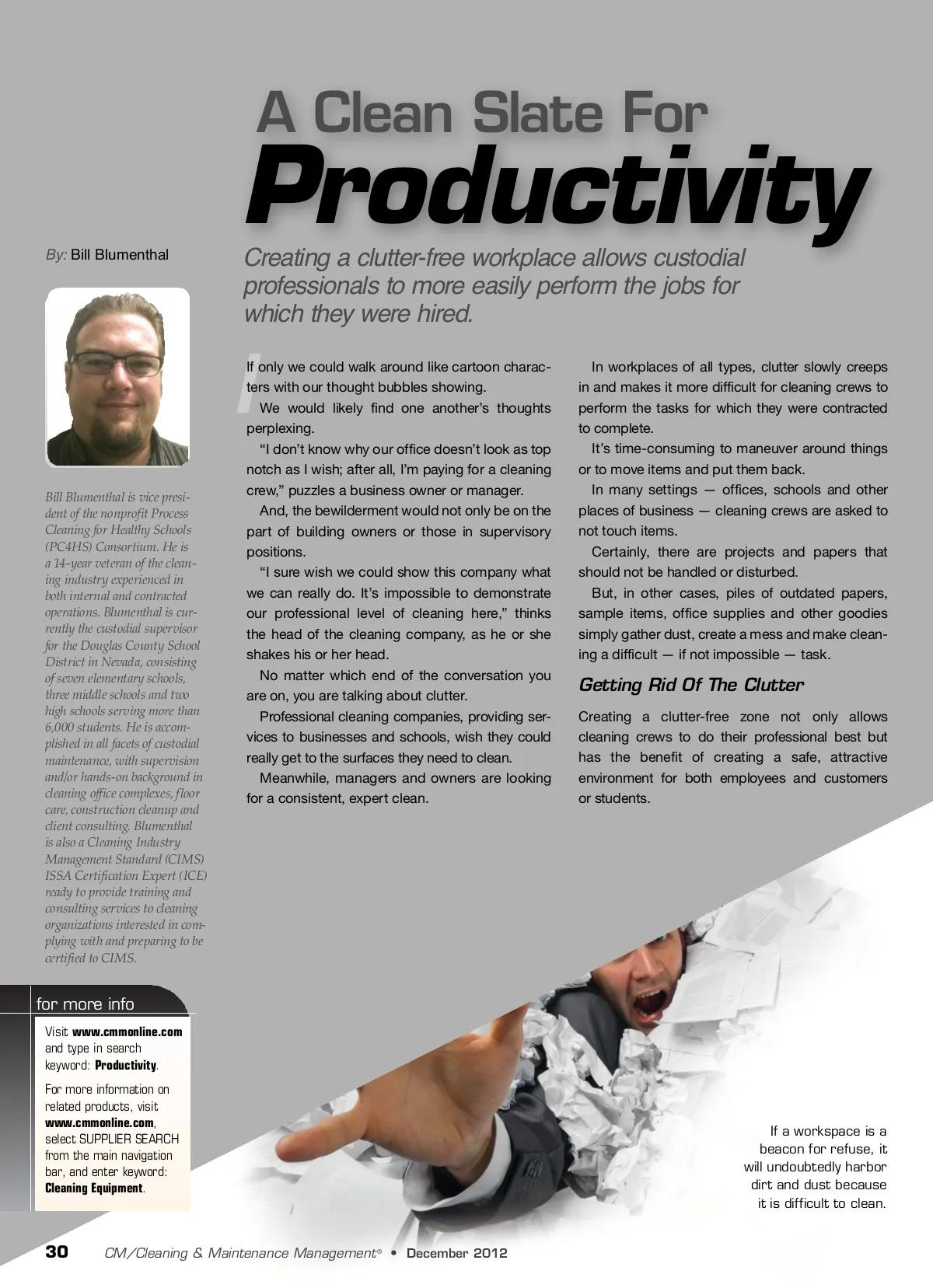 A Clean Slate For Productivity By: Bill Blumenthal Creating a clutter-free workplace allows custodial professionals to more easily perform the jobs for which they were hired. I Bill Blumenthal is vice presi-dent of the nonprofit Process Cleaning for Healthy Schools (PC4HS) Consortium. He is a 14-year veteran of the clean-ing industry experienced in both internal and contracted operations. Blumenthal is cur-rently the custodial supervisor for the Douglas County School District in Nevada, consisting of seven elementary schools, three middle schools and two high schools serving more than 6,000 students. He is accom-plished in all facets of custodial maintenance, with supervision and/or hands-on background in cleaning office complexes, floor care, construction cleanup and client consulting. Blumenthal is also a Cleaning Industry Management Standard (CIMS) ISSA Certification Expert (ICE) ready to provide training and consulting services to cleaning organizations interested in com-plying with and preparing to be certified to CIMS. If only we could walk around like cartoon charac-ters with our thought bubbles showing. We would likely find one another’s thoughts perplexing. “I don’t know why our office doesn’t look as top notch as I wish; after all, I’m paying for a cleaning crew,” puzzles a business owner or manager. And, the bewilderment would not only be on the part of building owners or those in supervisory positions. “I sure wish we could show this company what we can really do. It’s impossible to demonstrate our professional level of cleaning here,” thinks the head of the cleaning company, as he or she shakes his or her head. No matter which end of the conversation you are on, you are talking about clutter. Professional cleaning companies, providing ser-vices to businesses and schools, wish they could really get to the surfaces they need to clean. Meanwhile, managers and owners are looking for a consistent, expert clean. In workplaces of all types, clutter slowly creeps in and makes it more difficult for cleaning crews to perform the tasks for which they were contracted to complete. It’s time-consuming to maneuver around things or to move items and put them back. In many settings — offices, schools and other places of business — cleaning crews are asked to not touch items. Certainly, there are projects and papers that should not be handled or disturbed. But, in other cases, piles of outdated papers, sample items, office supplies and other goodies simply gather dust, create a mess and make clean-ing a difficult — if not impossible — task. Getting Rid Of The Clutter Creating a clutter-free zone not only allows cleaning crews to do their professional best but has the benefit of creating a safe, attractive environment for both employees and customers or students. for more info Visit www.cmmonline.com and type in search keyword: Productivity . For more information on related products, visit www.cmmonline.com , select SUPPLIER SEARCH from the main navigation bar, and enter keyword: Cleaning Equipment . If a workspace is a beacon for refuse, it will undoubtedly harbor dirt and dust because it is difficult to clean. 30 CM/Cleaning & Maintenance Management ® • December 2012
