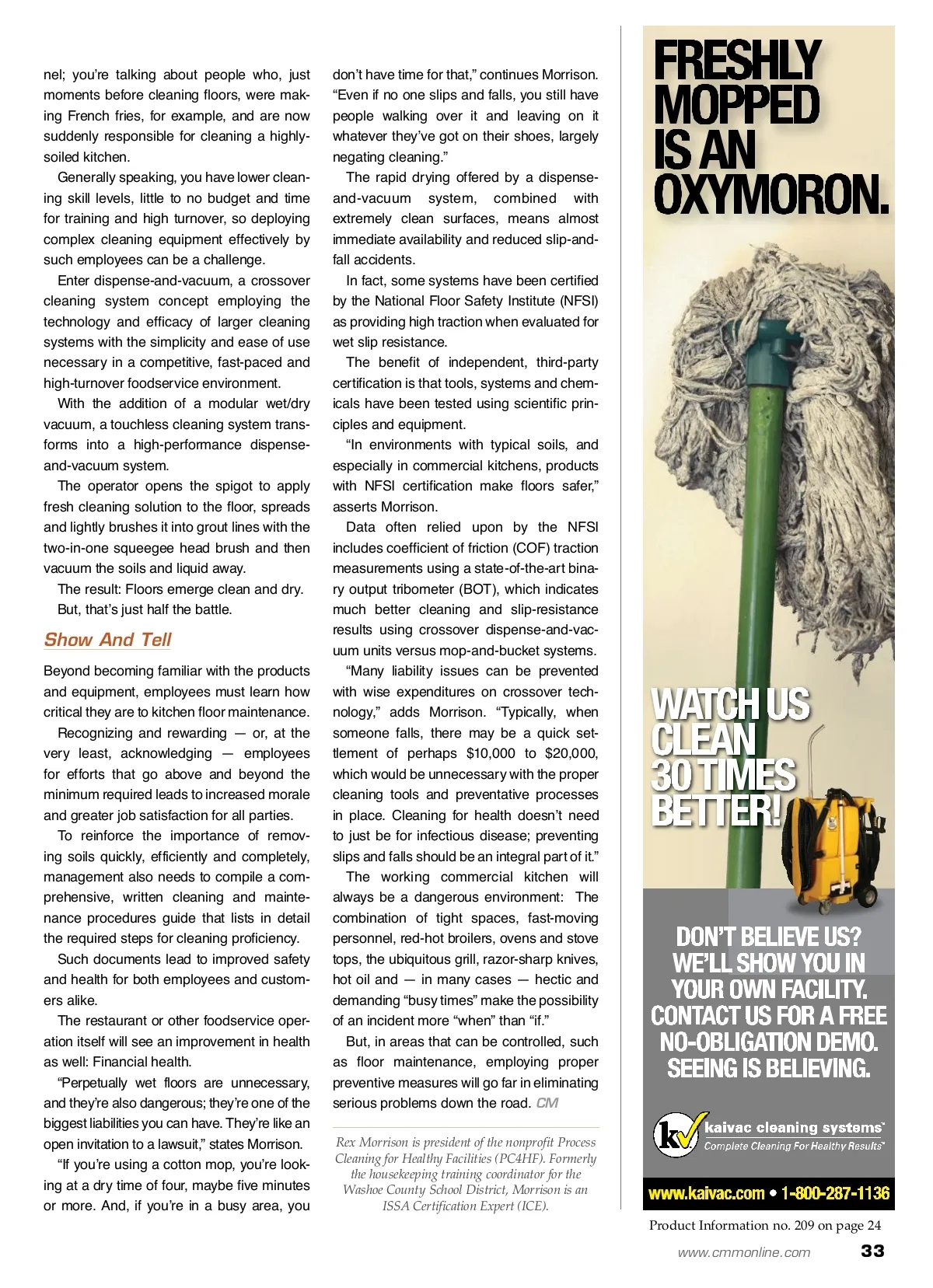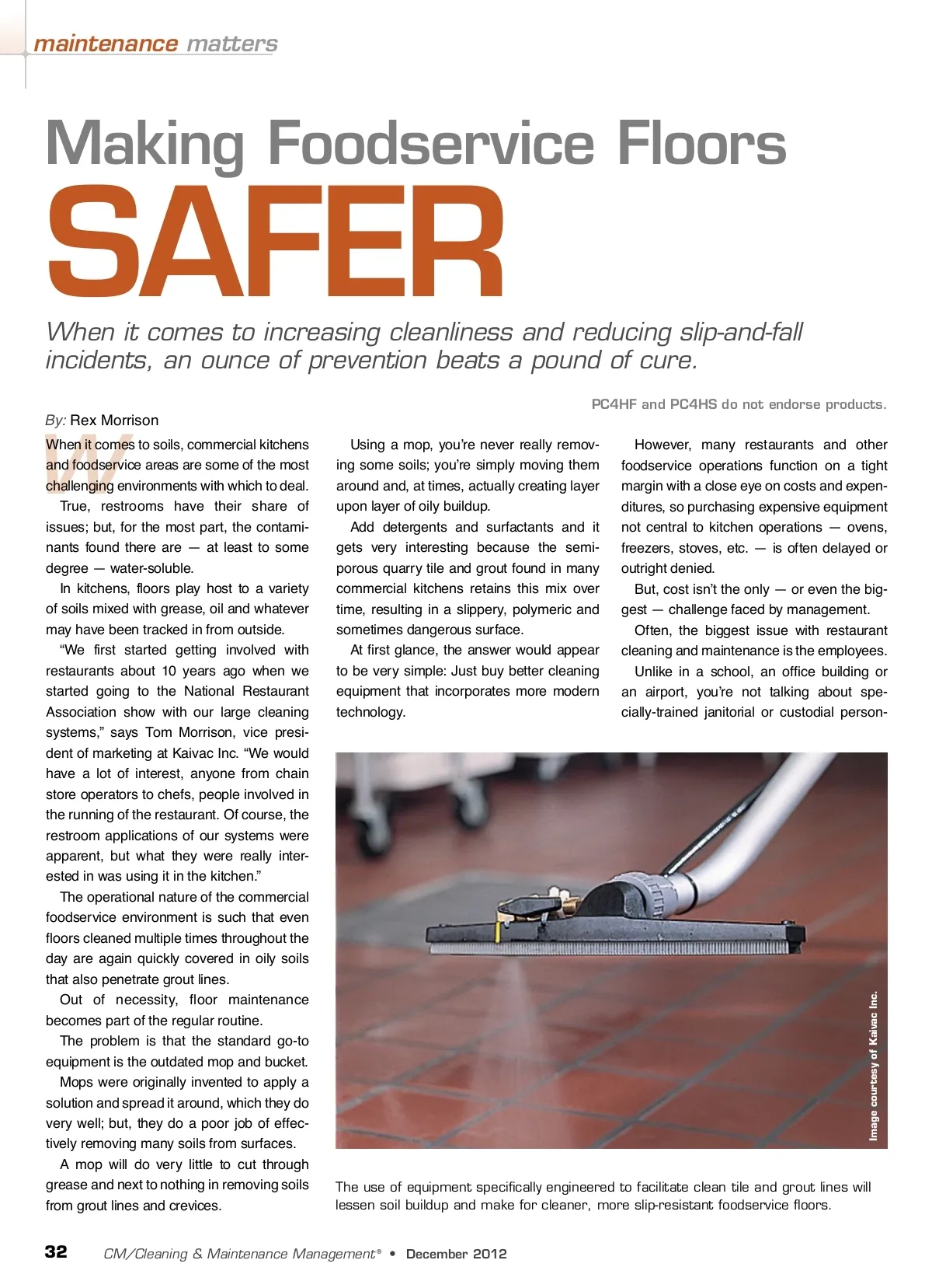 maintenance matters Making Foodservice Floors SAFER By: Rex Morrison When it comes to increasing cleanliness and reducing slip-and-fall incidents, an ounce of prevention beats a pound of cure. PC4HF and PC4HS do not endorse products. W When it comes to soils, commercial kitchens and foodservice areas are some of the most challenging environments with which to deal. True, restrooms have their share of issues; but, for the most part, the contami-nants found there are — at least to some degree — water-soluble. In kitchens, floors play host to a variety of soils mixed with grease, oil and whatever may have been tracked in from outside. “We first started getting involved with restaurants about 10 years ago when we started going to the National Restaurant Association show with our large cleaning systems,” says Tom Morrison, vice presi-dent of marketing at Kaivac Inc. “We would have a lot of interest, anyone from chain store operators to chefs, people involved in the running of the restaurant. Of course, the restroom applications of our systems were apparent, but what they were really inter-ested in was using it in the kitchen.” The operational nature of the commercial foodservice environment is such that even floors cleaned multiple times throughout the day are again quickly covered in oily soils that also penetrate grout lines. Out of necessity, floor maintenance becomes part of the regular routine. The problem is that the standard go-to equipment is the outdated mop and bucket. Mops were originally invented to apply a solution and spread it around, which they do very well; but, they do a poor job of effec-tively removing many soils from surfaces. A mop will do very little to cut through grease and next to nothing in removing soils from grout lines and crevices. Using a mop, you’re never really remov-ing some soils; you’re simply moving them around and, at times, actually creating layer upon layer of oily buildup. Add detergents and surfactants and it gets very interesting because the semi-porous quarry tile and grout found in many commercial kitchens retains this mix over time, resulting in a slippery, polymeric and sometimes dangerous surface. At first glance, the answer would appear to be very simple: Just buy better cleaning equipment that incorporates more modern technology. However, many restaurants and other foodservice operations function on a tight margin with a close eye on costs and expen-ditures, so purchasing expensive equipment not central to kitchen operations — ovens, freezers, stoves, etc. — is often delayed or outright denied. But, cost isn’t the only — or even the big-gest — challenge faced by management. Often, the biggest issue with restaurant cleaning and maintenance is the employees. Unlike in a school, an office building or an airport, you’re not talking about spe-cially-trained janitorial or custodial person-The use of equipment specifically engineered to facilitate clean tile and grout lines will lessen soil buildup and make for cleaner, more slip-resistant foodservice floors. 32 CM/Cleaning & Maintenance Management ® • December 2012 Image courtesy of Kaivac Inc.