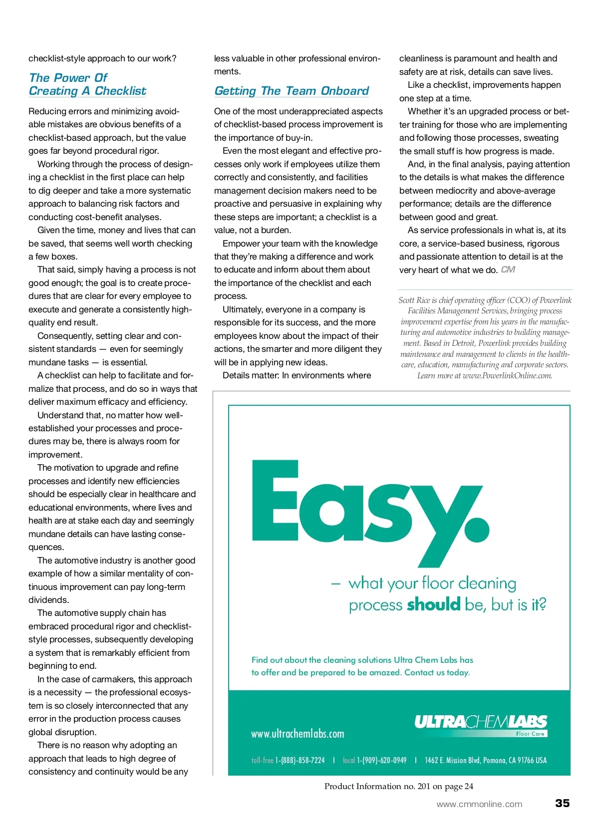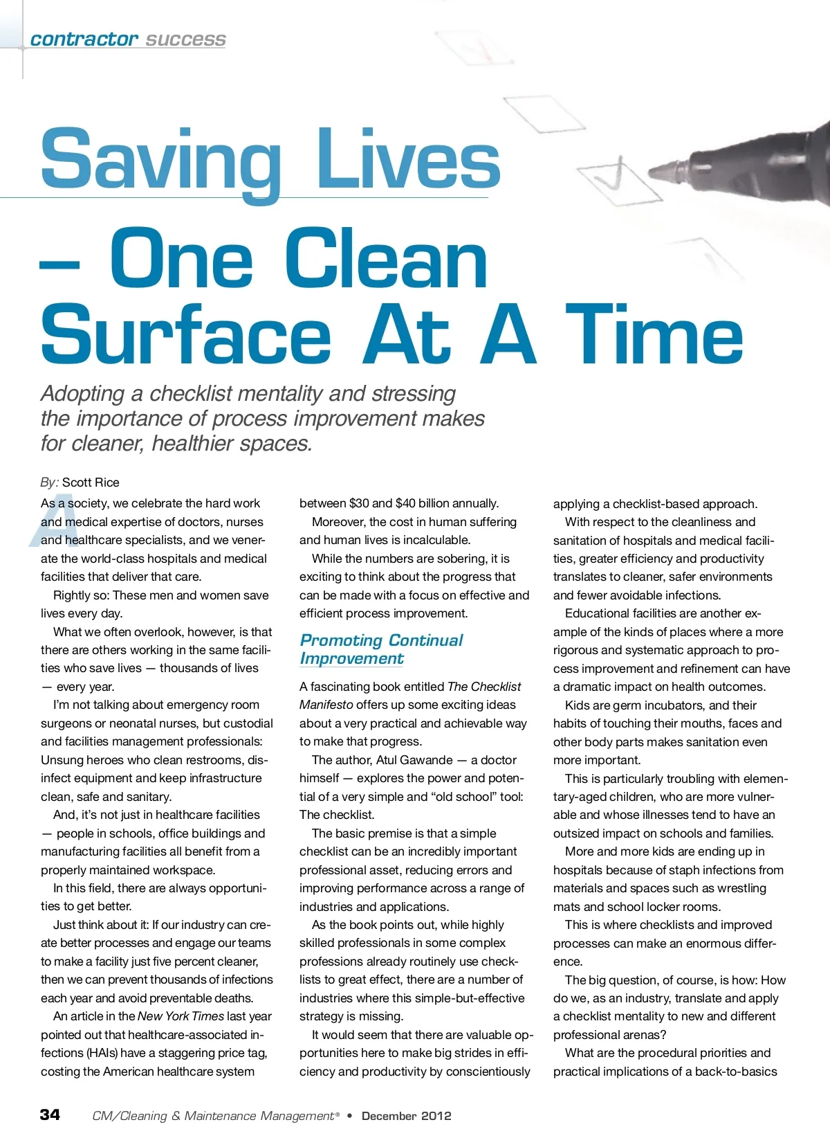 contractor success Saving Lives – One Clean Surface At A Time Adopting a checklist mentality and stressing the importance of process improvement makes for cleaner, healthier spaces. By: Scott Rice A As a society, we celebrate the hard work and medical expertise of doctors, nurses and healthcare specialists, and we vener-ate the world-class hospitals and medical facilities that deliver that care. Rightly so: These men and women save lives every day. What we often overlook, however, is that there are others working in the same facili-ties who save lives — thousands of lives — every year. I’m not talking about emergency room surgeons or neonatal nurses, but custodial and facilities management professionals: Unsung heroes who clean restrooms, dis-infect equipment and keep infrastructure clean, safe and sanitary. And, it’s not just in healthcare facilities — people in schools, office buildings and manufacturing facilities all benefit from a properly maintained workspace. In this field, there are always opportuni-ties to get better. Just think about it: If our industry can cre-ate better processes and engage our teams to make a facility just five percent cleaner, then we can prevent thousands of infections each year and avoid preventable deaths. An article in the New York Times last year pointed out that healthcare-associated in-fections (HAIs) have a staggering price tag, costing the American healthcare system between $30 and $40 billion annually. Moreover, the cost in human suffering and human lives is incalculable. While the numbers are sobering, it is exciting to think about the progress that can be made with a focus on effective and efficient process improvement. Promoting Continual Improvement A fascinating book entitled The Checklist Manifesto offers up some exciting ideas about a very practical and achievable way to make that progress. The author, Atul Gawande — a doctor himself — explores the power and poten-tial of a very simple and “old school” tool: The checklist. The basic premise is that a simple checklist can be an incredibly important professional asset, reducing errors and improving performance across a range of industries and applications. As the book points out, while highly skilled professionals in some complex professions already routinely use check-lists to great effect, there are a number of industries where this simple-but-effective strategy is missing. It would seem that there are valuable op-portunities here to make big strides in effi-ciency and productivity by conscientiously applying a checklist-based approach. With respect to the cleanliness and sanitation of hospitals and medical facili-ties, greater efficiency and productivity translates to cleaner, safer environments and fewer avoidable infections. Educational facilities are another ex-ample of the kinds of places where a more rigorous and systematic approach to pro-cess improvement and refinement can have a dramatic impact on health outcomes. Kids are germ incubators, and their habits of touching their mouths, faces and other body parts makes sanitation even more important. This is particularly troubling with elemen-tary-aged children, who are more vulner-able and whose illnesses tend to have an outsized impact on schools and families. More and more kids are ending up in hospitals because of staph infections from materials and spaces such as wrestling mats and school locker rooms. This is where checklists and improved processes can make an enormous differ-ence. The big question, of course, is how: How do we, as an industry, translate and apply a checklist mentality to new and different professional arenas? What are the procedural priorities and practical implications of a back-to-basics 34 CM/Cleaning & Maintenance Management ® • December 2012