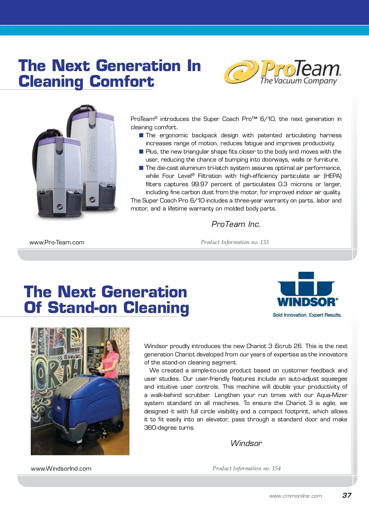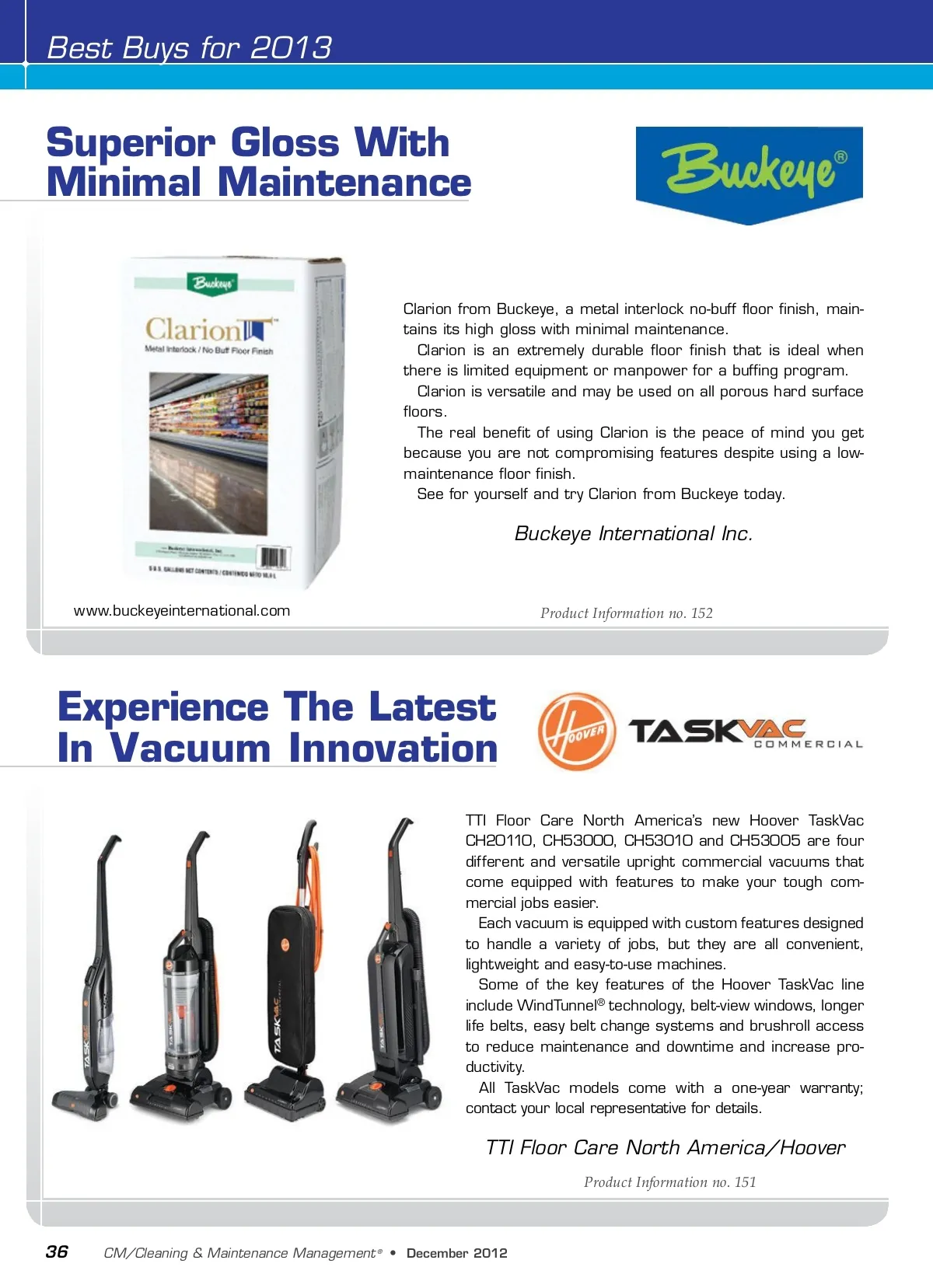 Best Buys for 2013 Superior Gloss With Minimal Maintenance Clarion from Buckeye, a metal interlock no-buff floor finish, main-tains its high gloss with minimal maintenance. Clarion is an extremely durable floor finish that is ideal when there is limited equipment or manpower for a buffing program. Clarion is versatile and may be used on all porous hard surface floors. The real benefit of using Clarion is the peace of mind you get because you are not compromising features despite using a low-maintenance floor finish. See for yourself and try Clarion from Buckeye today. Buckeye International Inc. www.buckeyeinternational.com Product Information no. 152 Experience The Latest In Vacuum Innovation TTI Floor Care North America’s new Hoover TaskVac CH20110, CH53000, CH53010 and CH53005 are four different and versatile upright commercial vacuums that come equipped with features to make your tough com-mercial jobs easier. Each vacuum is equipped with custom features designed to handle a variety of jobs, but they are all convenient, lightweight and easy-to-use machines. Some of the key features of the Hoover TaskVac line include WindTunnel ® technology, belt-view windows, longer life belts, easy belt change systems and brushroll access to reduce maintenance and downtime and increase pro-ductivity. All TaskVac models come with a one-year warranty; contact your local representative for details. TTI Floor Care North America/Hoover Product Information no. 151 36 CM/Cleaning & Maintenance Management ® • December2012