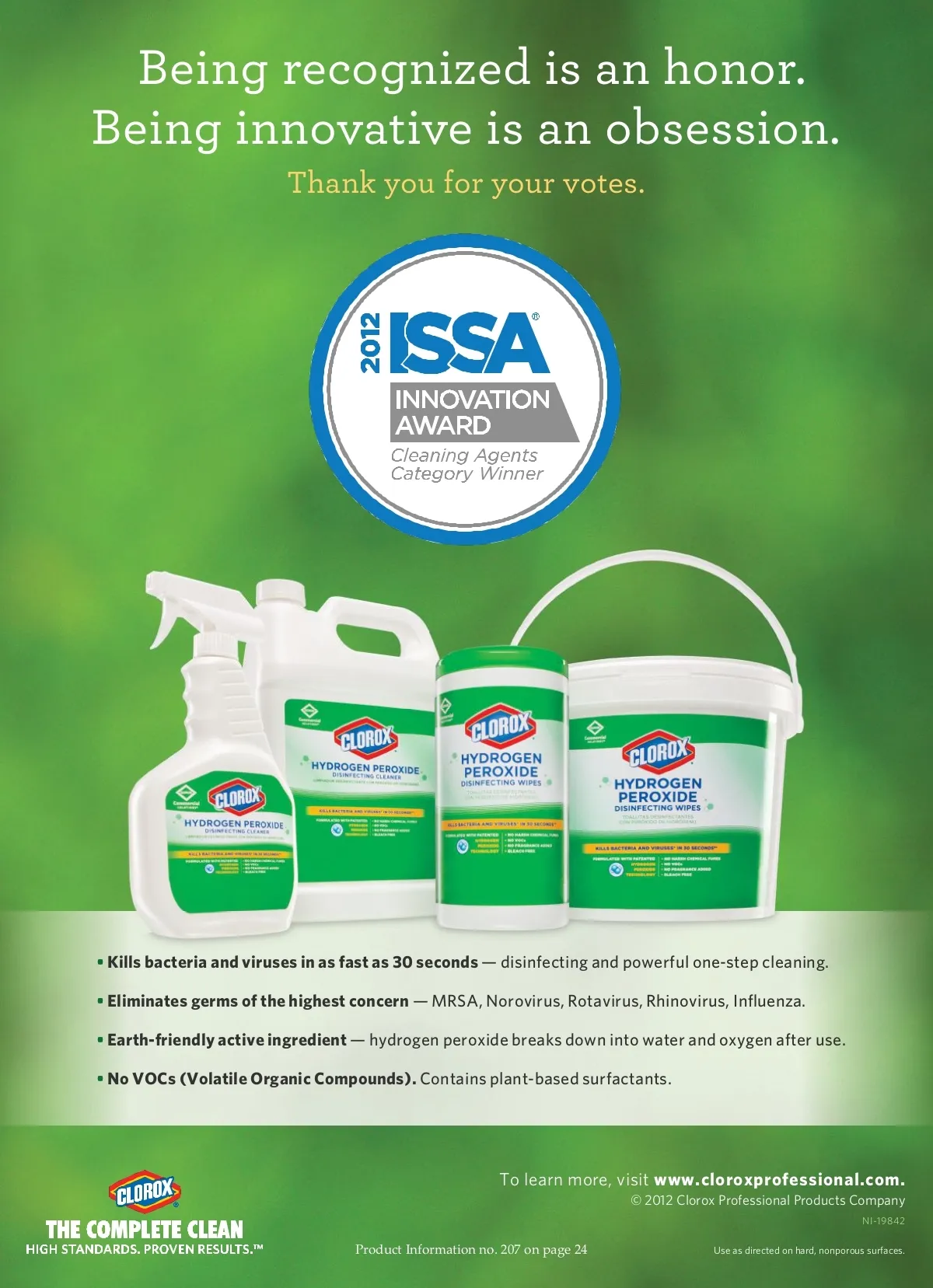 Being recognized is an honor. Being innovative is an obsession. Thank you for your votes. • Kills bacteria and viruses in as fast as 30 seconds — disinfecting and powerful one-step cleaning. • Eliminates germs of the highest concern — MRSA, Norovirus, Rotavirus, Rhinovirus, Influenza. • Earth-friendly active ingredient — hydrogen peroxide breaks down into water and oxygen after use. • No VOCs (Volatile Organic Compounds). Contains plant-based surfactants. To learn more, visit www.cloroxprofessional.com. © 2012 Clorox Professional Products Company NI-19842 Product Information no. 207 on page 24 Use as directed on hard, nonporous surfaces.