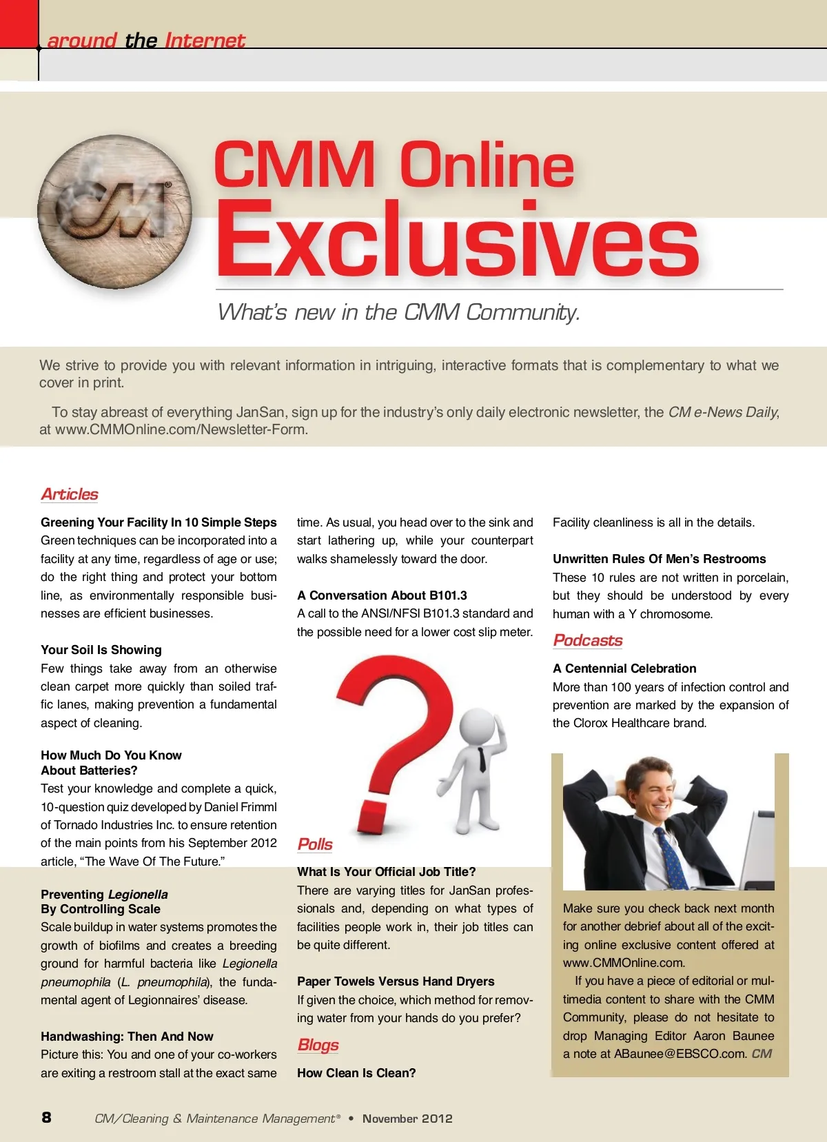 around the Internet CMM Online Exclusives What’s new in the CMM Community. We strive to provide you with relevant information in intriguing, interactive formats that is complementary to what we cover in print. To stay abreast of everything JanSan, sign up for the industry’s only daily electronic newsletter, the CM e-News Daily , at www.CMMOnline.com/Newsletter-Form. Articles Greening Your Facility In 10 Simple Steps Green techniques can be incorporated into a facility at any time, regardless of age or use; do the right thing and protect your bottom line, as environmentally responsible busi-nesses are efficient businesses. Your Soil Is Showing Few things take away from an otherwise clean carpet more quickly than soiled traf-fic lanes, making prevention a fundamental aspect of cleaning. How Much Do You Know About Batteries? Test your knowledge and complete a quick, 10-question quiz developed by Daniel Frimml of Tornado Industries Inc. to ensure retention of the main points from his September 2012 article, “The Wave Of The Future.” Preventing Legionella By Controlling Scale Scale buildup in water systems promotes the growth of biofilms and creates a breeding ground for harmful bacteria like Legionella pneumophila ( L. pneumophila ), the funda-mental agent of Legionnaires’ disease. Handwashing: Then And Now Picture this: You and one of your co-workers are exiting a restroom stall at the exact same time. As usual, you head over to the sink and start lathering up, while your counterpart walks shamelessly toward the door. A Conversation About B101.3 A call to the ANSI/NFSI B101.3 standard and the possible need for a lower cost slip meter. Facility cleanliness is all in the details. Unwritten Rules Of Men’s Restrooms These 10 rules are not written in porcelain, but they should be understood by every human with a Y chromosome. Podcasts A Centennial Celebration More than 100 years of infection control and prevention are marked by the expansion of the Clorox Healthcare brand. Polls What Is Your Official Job Title? There are varying titles for JanSan profes-sionals and, depending on what types of facilities people work in, their job titles can be quite different. Paper Towels Versus Hand Dryers If given the choice, which method for remov-ing water from your hands do you prefer? Blogs How Clean Is Clean? Make sure you check back next month for another debrief about all of the excit-ing online exclusive content offered at www.CMMOnline.com. If you have a piece of editorial or mul-timedia content to share with the CMM Community, please do not hesitate to drop Managing Editor Aaron Baunee a note at [email protected]. CM 8 CM/Cleaning & Maintenance Management ® • November 2012