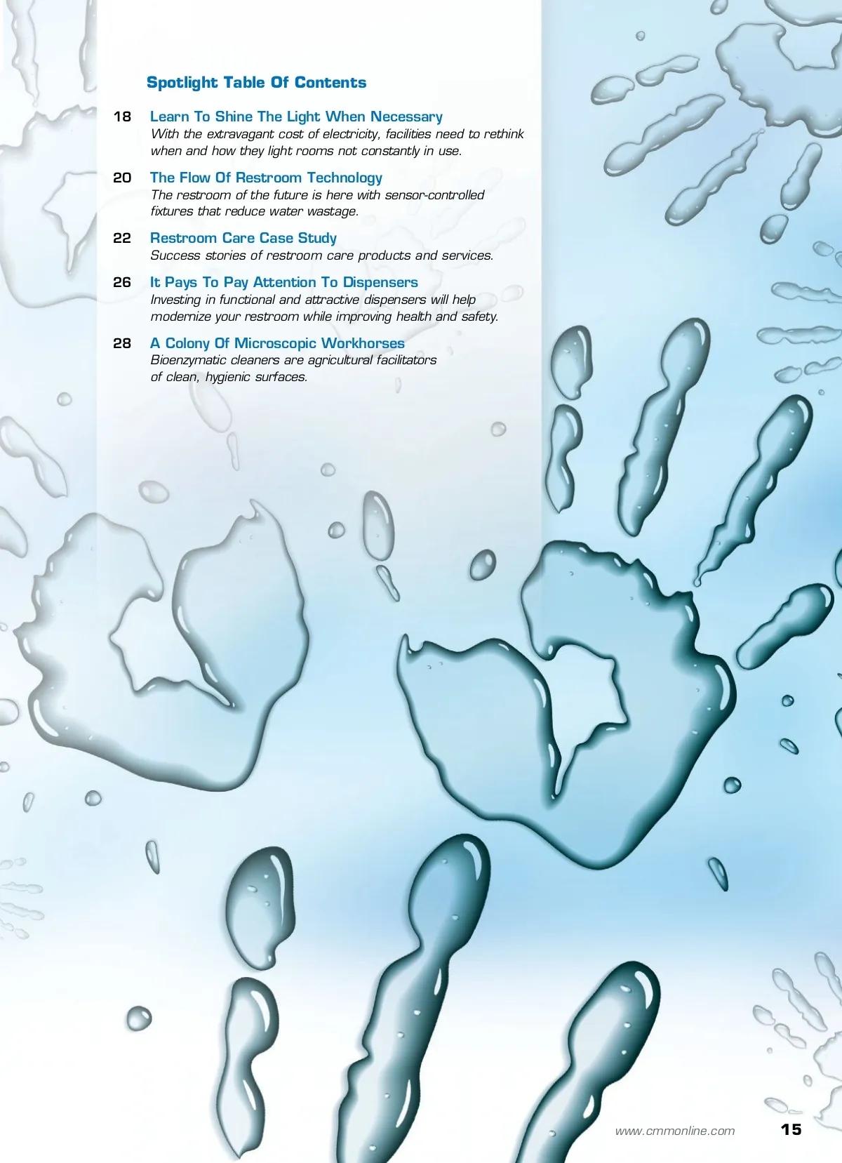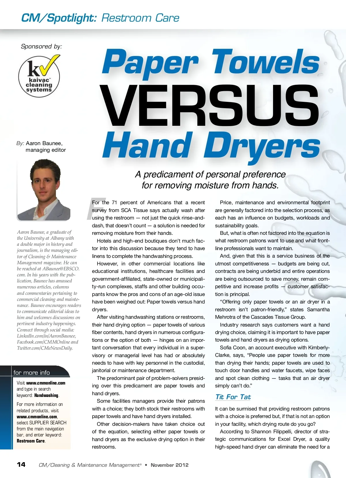 CM/Spotlight: Restroom Care Sponsored by: Paper Towels VERSUS By: Aaron Baunee, managing editor Hand Dryers A predicament of personal preference for removing moisture from hands. F Aaron Baunee, a graduate of the University at Albany with a double major in history and journalism, is the managing edi-tor of Cleaning & Maintenance Management magazine. He can be reached at ABaunee@EBSCO. com. In his years with the pub-lication, Baunee has amassed numerous articles, columns and commentaries pertaining to commercial cleaning and mainte-nance. Baunee encourages readers to communicate editorial ideas to him and welcomes discussions on pertinent industry happenings. Connect through social media: LinkedIn.com/in/AaronBaunee, Facebook.com/CMMOnline and Twitter.com/CMeNewsDaily. for more info Visit www.cmmonline.com and type in search keyword: Handwashing . For more information on related products, visit www.cmmonline.com , select SUPPLIER SEARCH from the main navigation bar, and enter keyword: Restroom Care . For the 71 percent of Americans that a recent survey from SCA Tissue says actually wash after using the restroom — not just the quick rinse-and-dash, that doesn’t count — a solution is needed for removing moisture from their hands. Hotels and high-end boutiques don’t much fac-tor into this discussion because they tend to have linens to complete the handwashing process. However, in other commercial locations like educational institutions, healthcare facilities and government-affiliated, state-owned or municipali-ty-run complexes, staffs and other building occu-pants know the pros and cons of an age-old issue have been weighed out: Paper towels versus hand dryers. After visiting handwashing stations or restrooms, their hand drying option — paper towels of various fiber contents, hand dryers in numerous configura-tions or the option of both — hinges on an impor-tant conversation that every individual in a super-visory or managerial level has had or absolutely needs to have with key personnel in the custodial, janitorial or maintenance department. The predominant pair of problem-solvers presid-ing over this predicament are paper towels and hand dryers. Some facilities managers provide their patrons with a choice; they both stock their restrooms with paper towels and have hand dryers installed. Other decision-makers have taken choice out of the equation, selecting either paper towels or hand dryers as the exclusive drying option in their restrooms. Price, maintenance and environmental footprint are generally factored into the selection process, as each has an influence on budgets, workloads and sustainability goals. But, what is often not factored into the equation is what restroom patrons want to use and what front-line professionals want to maintain. And, given that this is a service business of the utmost competitiveness — budgets are being cut, contracts are being underbid and entire operations are being outsourced to save money, remain com-petitive and increase profits — customer satisfac-tion is principal. “Offering only paper towels or an air dryer in a restroom isn’t patron-friendly,” states Samantha Mehrotra of the Cascades Tissue Group. Industry research says customers want a hand drying choice, claiming it is important to have paper towels and hand dryers as drying options. Sofia Coon, an account executive with Kimberly-Clarke, says, “People use paper towels for more than drying their hands; paper towels are used to touch door handles and water faucets, wipe faces and spot clean clothing — tasks that an air dryer simply can’t do.” Tit For Tat It can be surmised that providing restroom patrons with a choice is preferred but, if that is not an option in your facility, which drying route do you go? According to Shannon Filippelli, director of stra-tegic communications for Excel Dryer, a quality high-speed hand dryer can eliminate the need for a 14 CM/Cleaning & Maintenance Management ® • November 2012