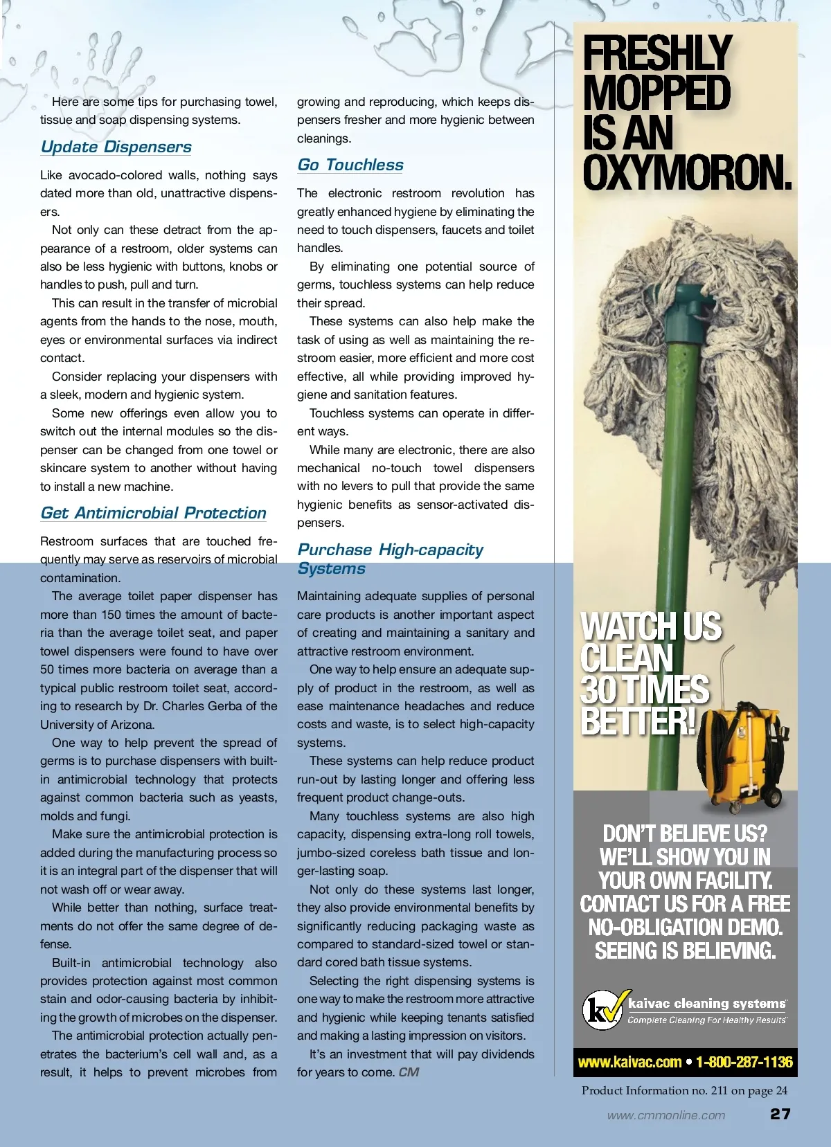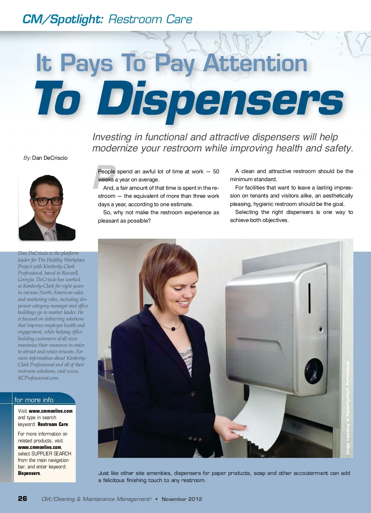 CM/Spotlight: Restroom Care It Pays To Pay Attention To Dispensers Investing in functional and attractive dispensers will help modernize your restroom while improving health and safety. By: Dan DeCriscio P Dan DeCriscio is the platform leader for The Healthy Workplace Project with Kimberly-Clark Professional, based in Roswell, Georgia. DeCriscio has worked at Kimberly-Clark for eight years in various North American sales and marketing roles, including dis-penser category manager and office buildings go to market leader. He is focused on delivering solutions that improve employee health and engagement, while helping office building customers of all sizes maximize their resources in order to attract and retain tenants. For more information about Kimberly-Clark Professional and all of their restroom solutions, visit www. KCProfessional.com. People spend an awful lot of time at work — 50 weeks a year on average. And, a fair amount of that time is spent in the re-stroom — the equivalent of more than three work days a year, according to one estimate. So, why not make the restroom experience as pleasant as possible? A clean and attractive restroom should be the minimum standard. For facilities that want to leave a lasting impres-sion on tenants and visitors alike, an aesthetically pleasing, hygienic restroom should be the goal. Selecting the right dispensers is one way to achieve both objectives. for more info Visit www.cmmonline.com and type in search keyword: Restroom Care . For more information on related products, visit www.cmmonline.com , select SUPPLIER SEARCH from the main navigation bar, and enter keyword: Dispensers . Just like other site amenities, dispensers for paper products, soap and other accouterment can add a felicitous finishing touch to any restroom. 26 CM/Cleaning & Maintenance Management ® • November 2012 Image courtesy of Kimberly-Clark Professional