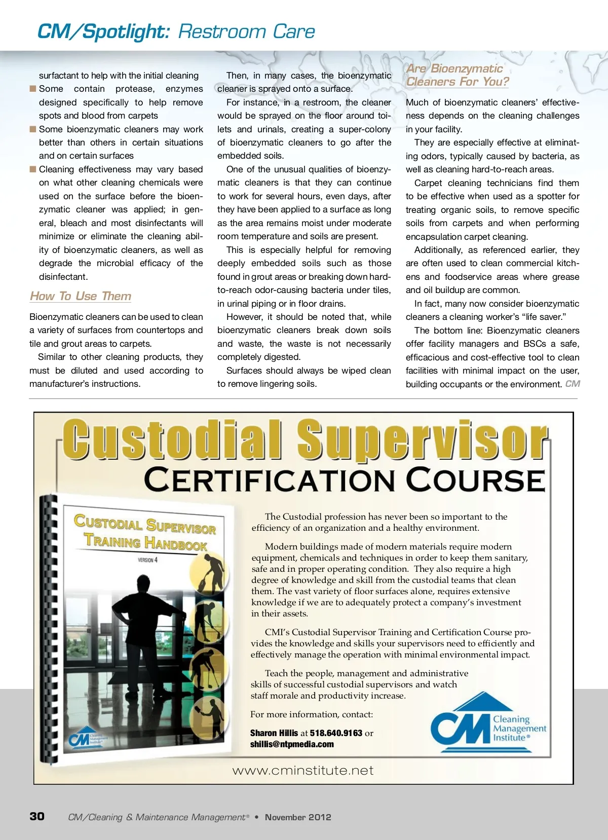 CM/Spotlight: Restroom Care surfactant to help with the initial cleaning ■ Some contain protease, enzymes designed specifically to help remove spots and blood from carpets ■ Some bioenzymatic cleaners may work better than others in certain situations and on certain surfaces ■ Cleaning effectiveness may vary based on what other cleaning chemicals were used on the surface before the bioen-zymatic cleaner was applied; in gen-eral, bleach and most disinfectants will minimize or eliminate the cleaning abil-ity of bioenzymatic cleaners, as well as degrade the microbial efficacy of the disinfectant. Then, in many cases, the bioenzymatic cleaner is sprayed onto a surface. For instance, in a restroom, the cleaner would be sprayed on the floor around toi-lets and urinals, creating a super-colony of bioenzymatic cleaners to go after the embedded soils. One of the unusual qualities of bioenzy-matic cleaners is that they can continue to work for several hours, even days, after they have been applied to a surface as long as the area remains moist under moderate room temperature and soils are present. This is especially helpful for removing deeply embedded soils such as those found in grout areas or breaking down hard-to-reach odor-causing bacteria under tiles, in urinal piping or in floor drains. However, it should be noted that, while bioenzymatic cleaners break down soils and waste, the waste is not necessarily completely digested. Surfaces should always be wiped clean to remove lingering soils. 2/19/10 3:38 PM Page 1 Are Bioenzymatic Cleaners For You? Much of bioenzymatic cleaners’ effective-ness depends on the cleaning challenges in your facility. They are especially effective at eliminat-ing odors, typically caused by bacteria, as well as cleaning hard-to-reach areas. Carpet cleaning technicians find them to be effective when used as a spotter for treating organic soils, to remove specific soils from carpets and when performing encapsulation carpet cleaning. Additionally, as referenced earlier, they are often used to clean commercial kitch-ens and foodservice areas where grease and oil buildup are common. In fact, many now consider bioenzymatic cleaners a cleaning worker’s “life saver.” The bottom line: Bioenzymatic cleaners offer facility managers and BSCs a safe, efficacious and cost-effective tool to clean facilities with minimal impact on the user, building occupants or the environment. CM How To Use Them Bioenzymatic cleaners can be used to clean a variety of surfaces from countertops and tile and grout areas to carpets. Similar to other cleaning products, they must be diluted and used according to manufacturer’s instructions. Custodial Supervisor.qxp:Layout 1 Sharon Hillis at 518.640.9163 or [email protected] For more information, contact: Teach the people, management and administrative skills of successful custodial supervisors and watch staff morale and productivity increase. CMI’s Custodial Supervisor Training and Certification Course pro-vides the knowledge and skills your supervisors need to efficiently and effectively manage the operation with minimal environmental impact. Modern buildings made of modern materials require modern equipment, chemicals and techniques in order to keep them sanitary, safe and in proper operating condition. They also require a high degree of knowledge and skill from the custodial teams that clean them. The vast variety of floor surfaces alone, requires extensive knowledge if we are to adequately protect a company’s investment in their assets. The Custodial profession has never been so important to the efficiency of an organization and a healthy environment. www.cminstitute.net 30 CM/Cleaning & Maintenance Management ® • November 2012